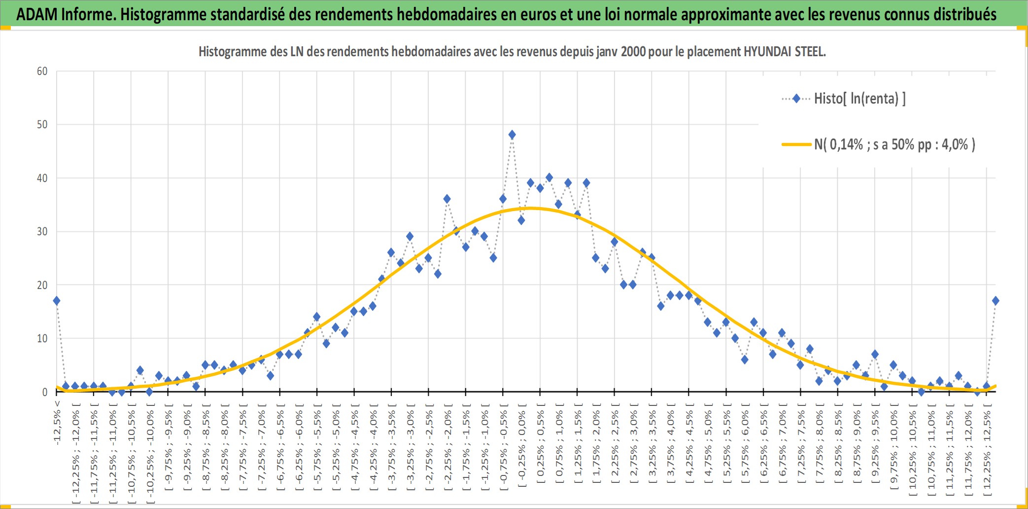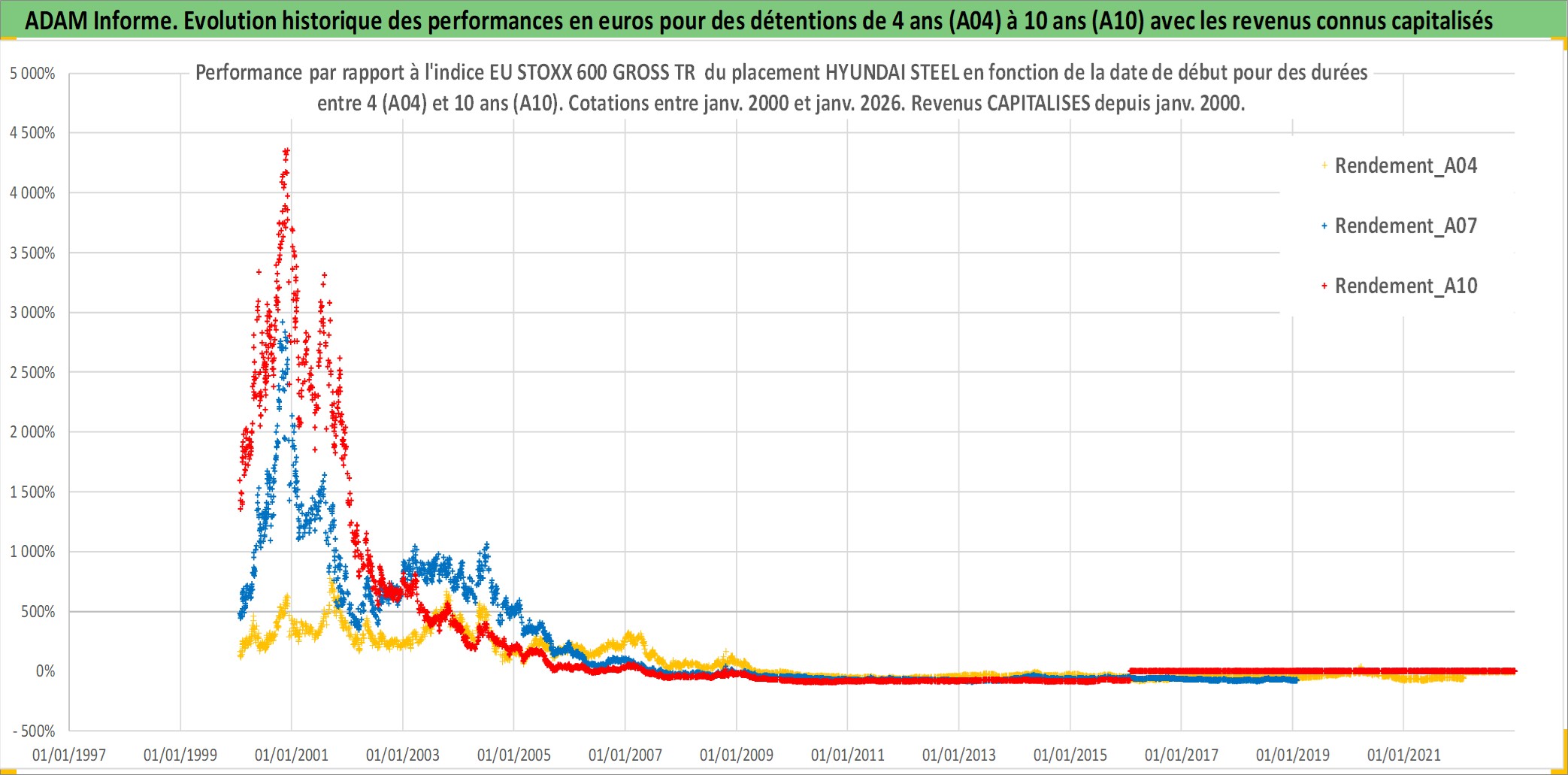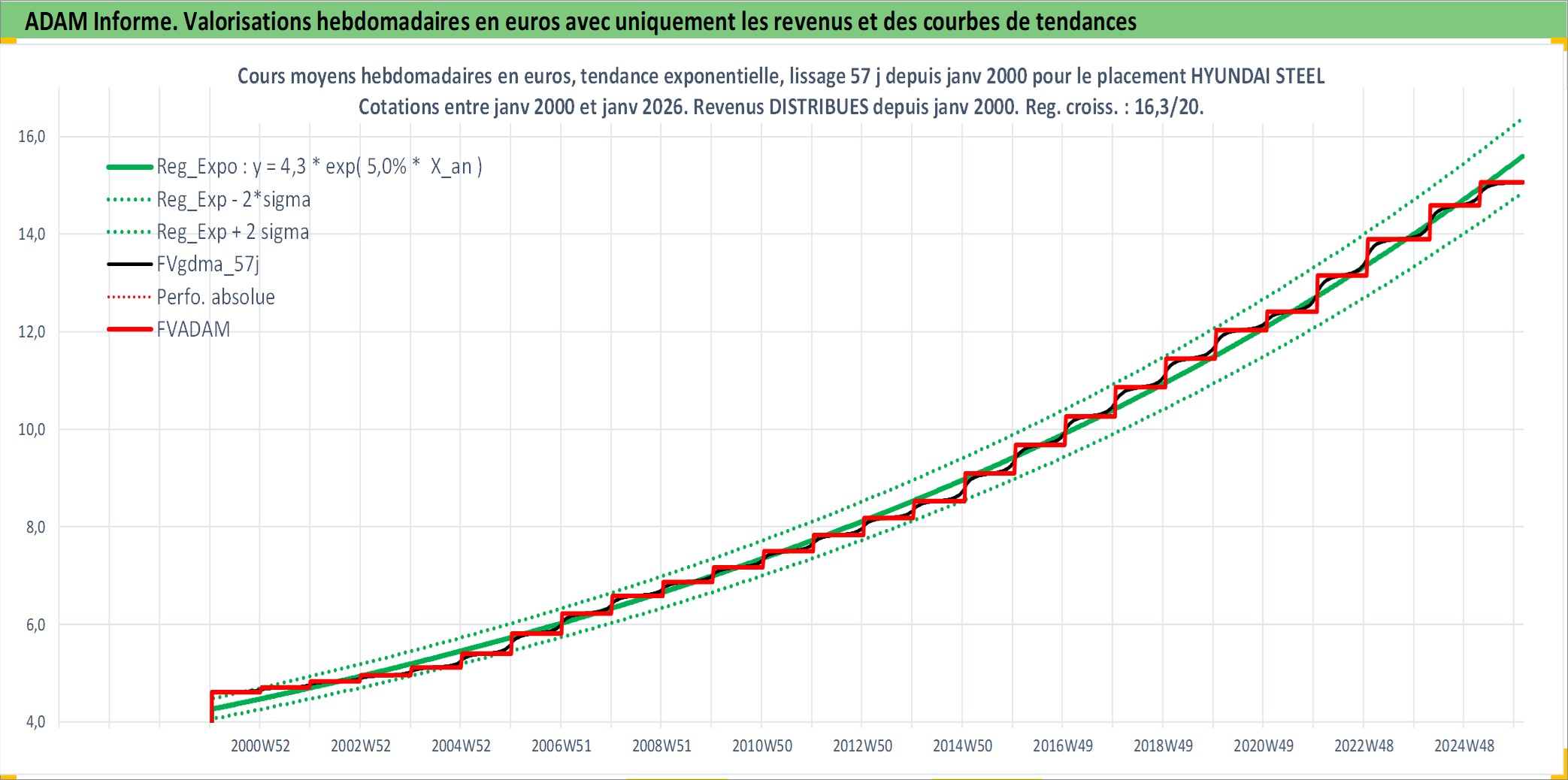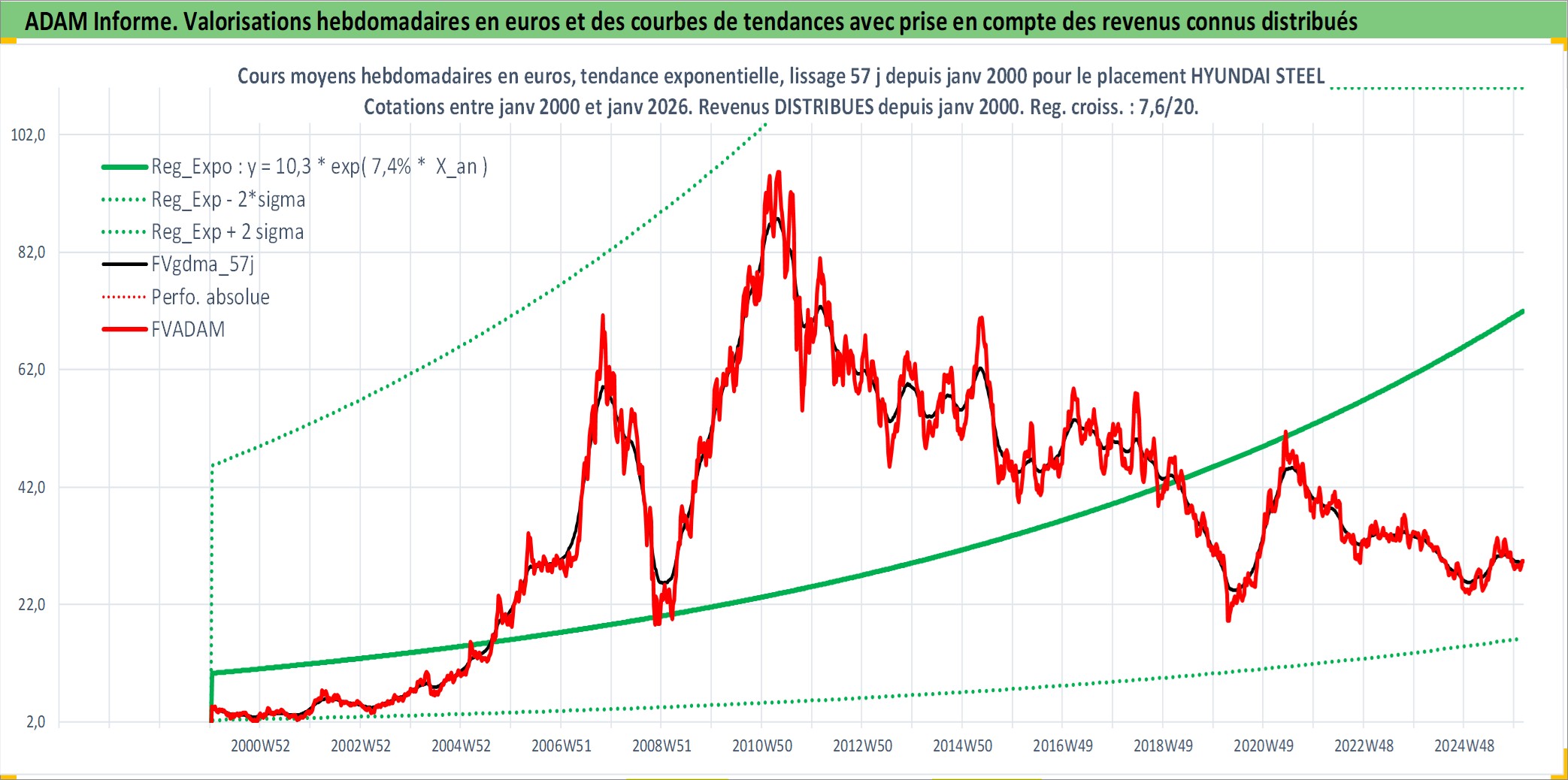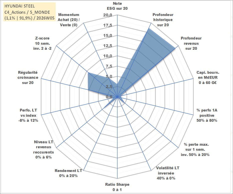 Site dédié aux investisseursPage dédiée sur site financeAnalyse des valorisations hebdomadaires de l'action HYUNDAI STEEL. Cet actif est cote en KRW. Les valorisations sont en contrevaleur EURO et couvrent les semaines 2000W02 a 2026W05. Les revenus de cet actif financier sont pris en compte depuis la semaine 2000W01. La note globale ESG de cet actif est estimee a 3.0 (apres rebasage entre 0 et 20).