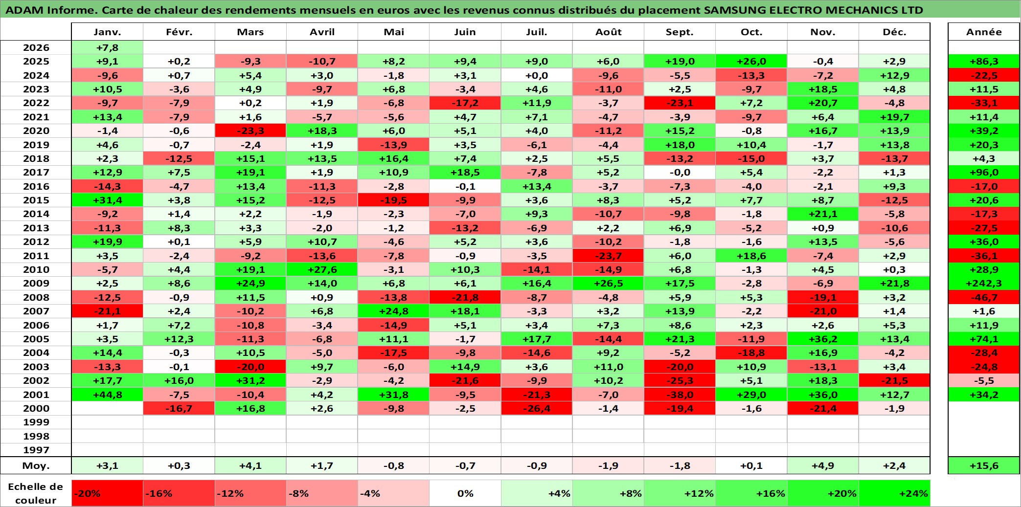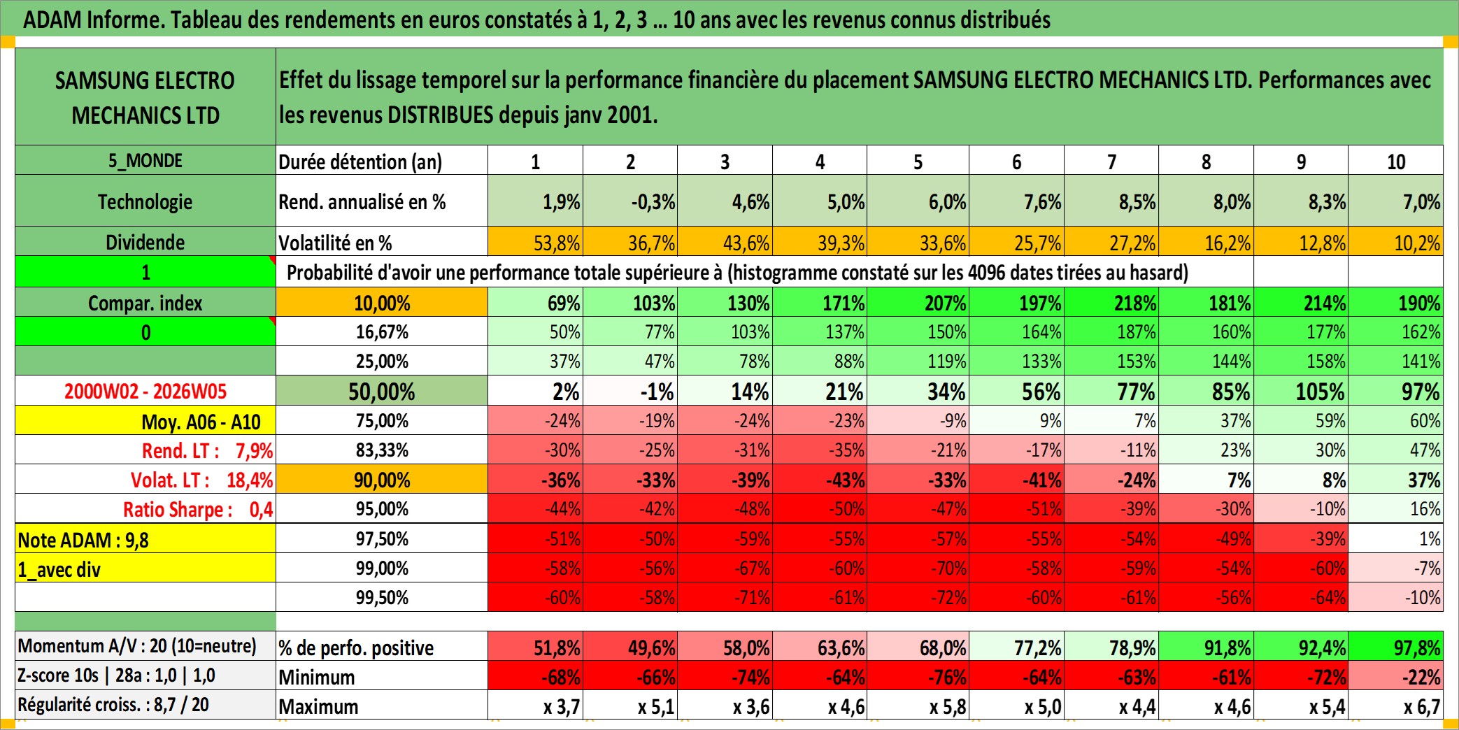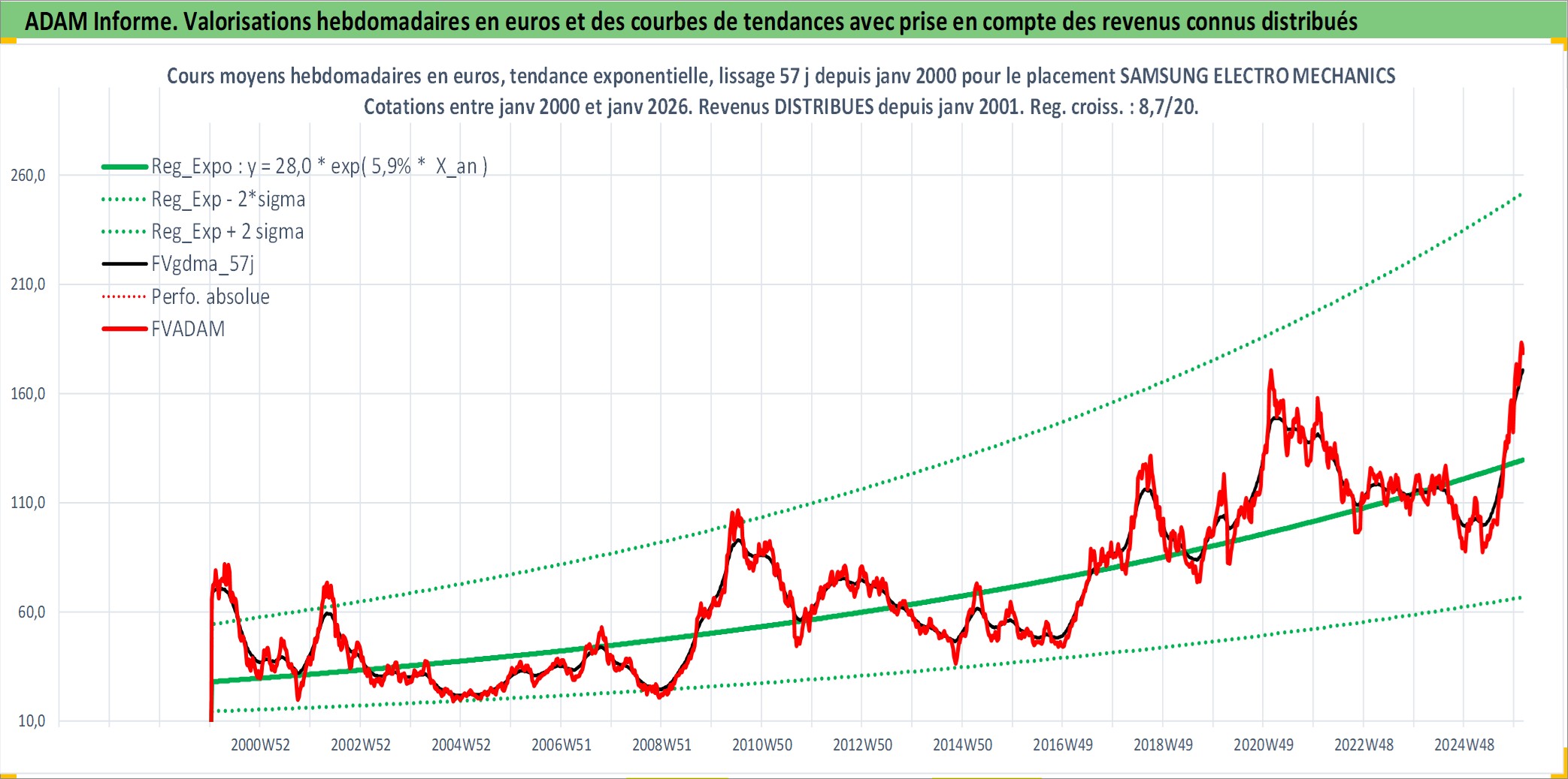 Site dédié aux investisseursPage dédiée sur site financeAnalyse des valorisations hebdomadaires de l'action SAMSUNG ELECTRO MECHANICS LTD. Cet actif est cote en KRW. Les valorisations sont en contrevaleur EURO et couvrent les semaines 2000W02 a 2026W05. Les revenus de cet actif financier sont pris en compte depuis la semaine 2001W01. La note ESG de cet actif n'est pas connue.