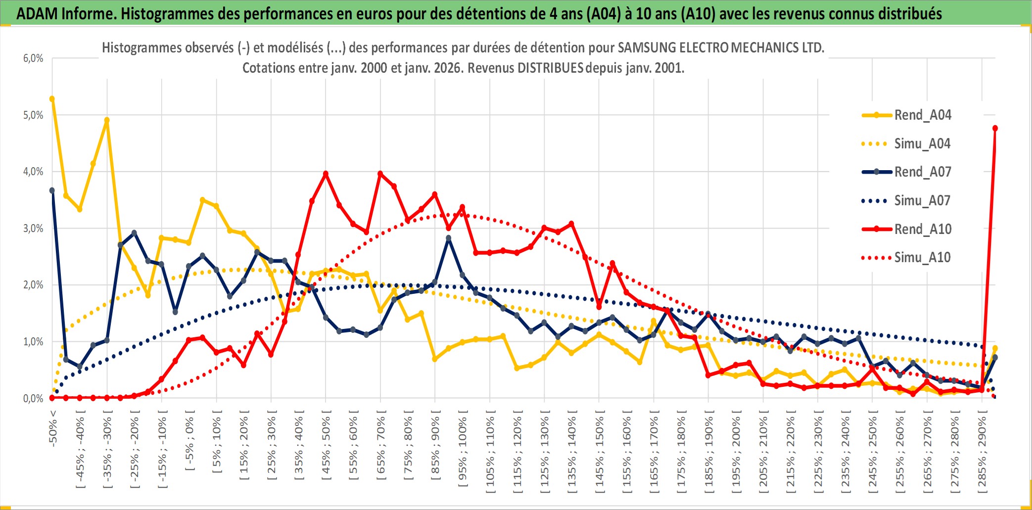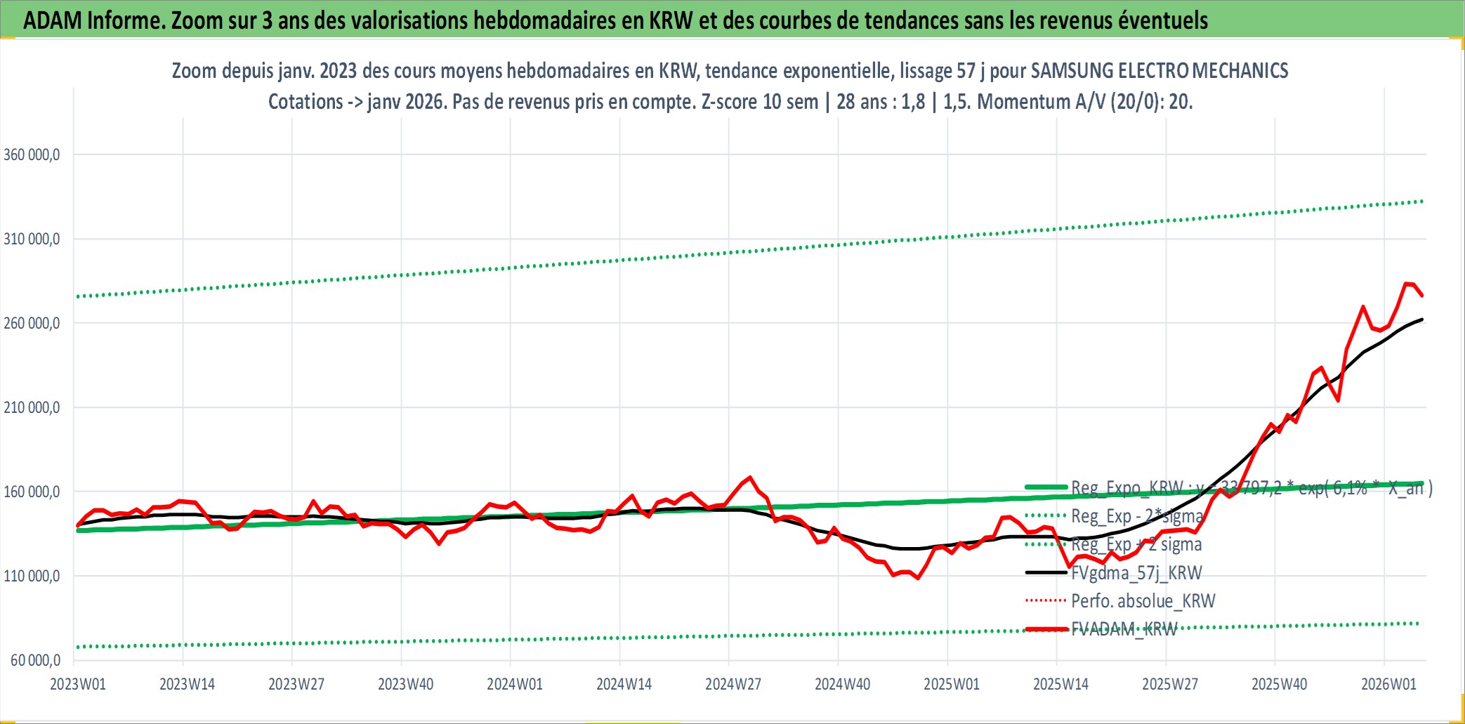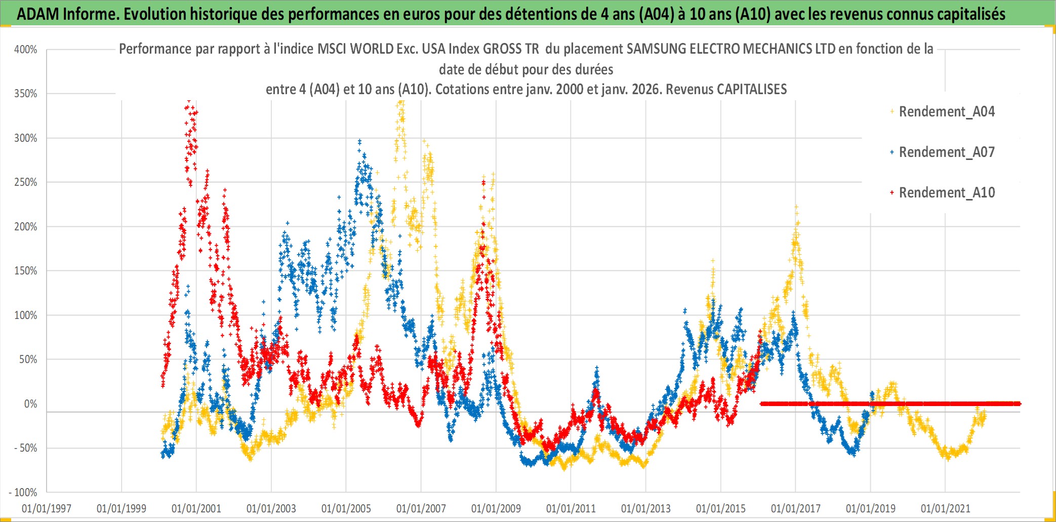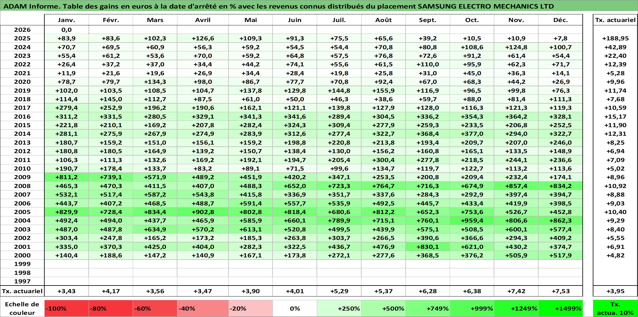 Site dédié aux investisseursPage dédiée sur site financeAnalyse des valorisations hebdomadaires de l'action SAMSUNG ELECTRO MECHANICS LTD. Cet actif est cote en KRW. Les valorisations sont en contrevaleur EURO et couvrent les semaines 2000W02 a 2026W05. Les revenus de cet actif financier sont pris en compte depuis la semaine 2001W01. La note ESG de cet actif n'est pas connue.