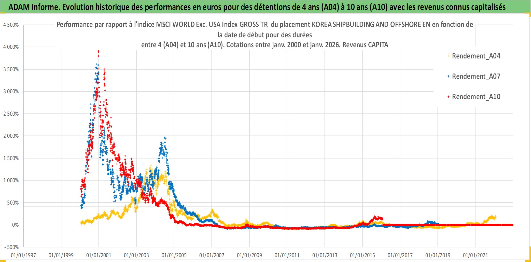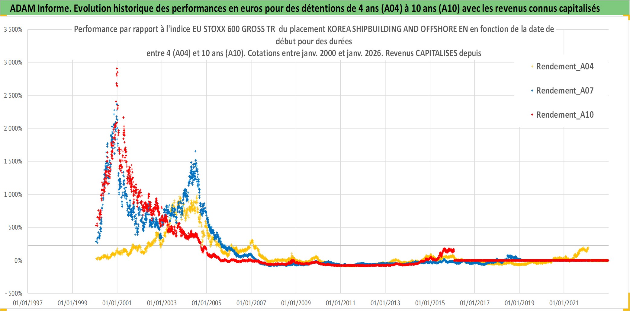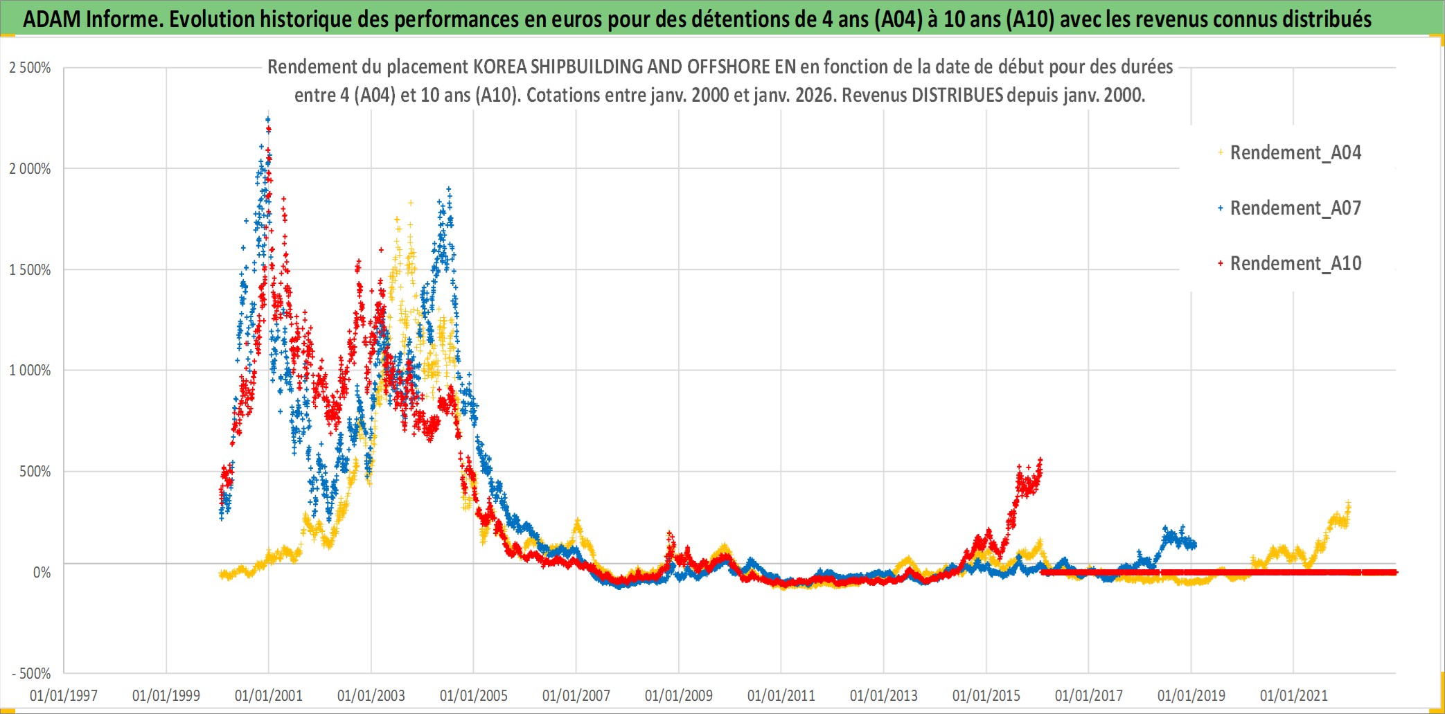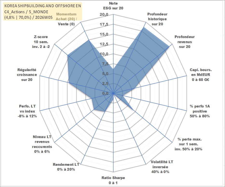 Site dédié aux investisseursPage dédiée sur site financeAnalyse des valorisations hebdomadaires de l'action KOREA SHIPBUILDING AND OFFSHORE EN. Cet actif est cote en KRW. Les valorisations sont en contrevaleur EURO et couvrent les semaines 2000W02 a 2026W05. Les revenus de cet actif financier sont pris en compte depuis la semaine 2000W01. La note globale ESG de cet actif est estimee a 6.0 (apres rebasage entre 0 et 20).