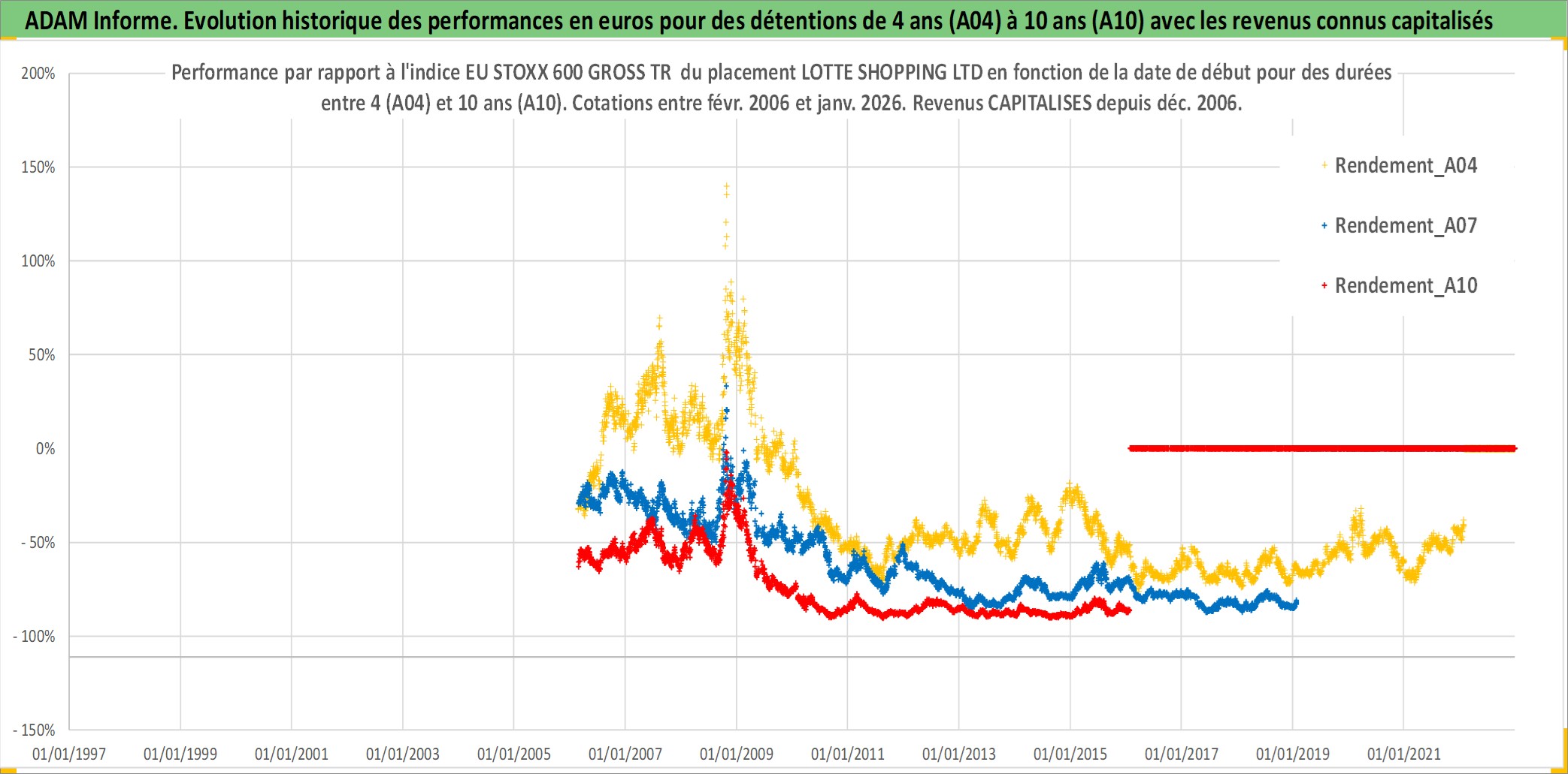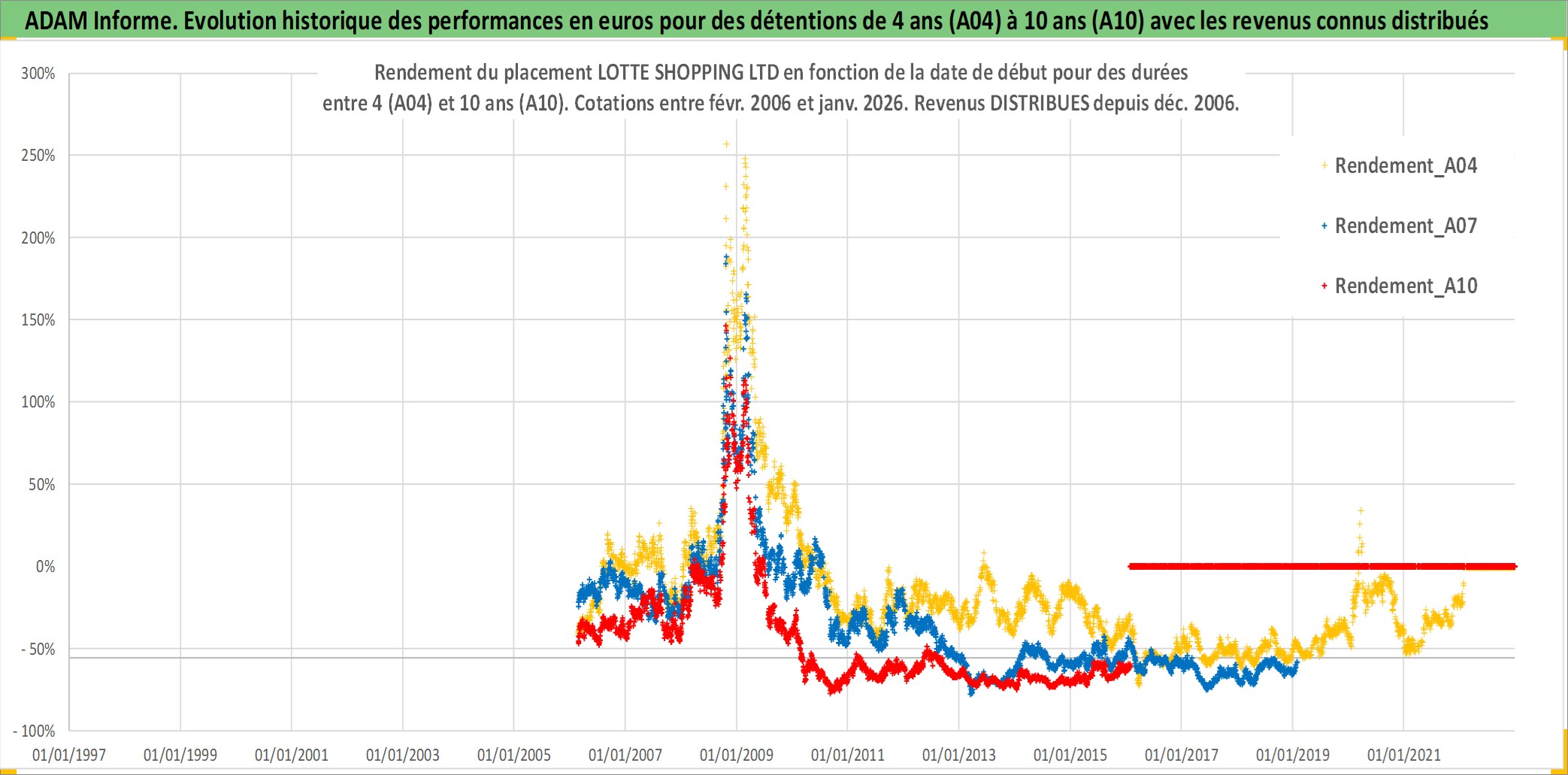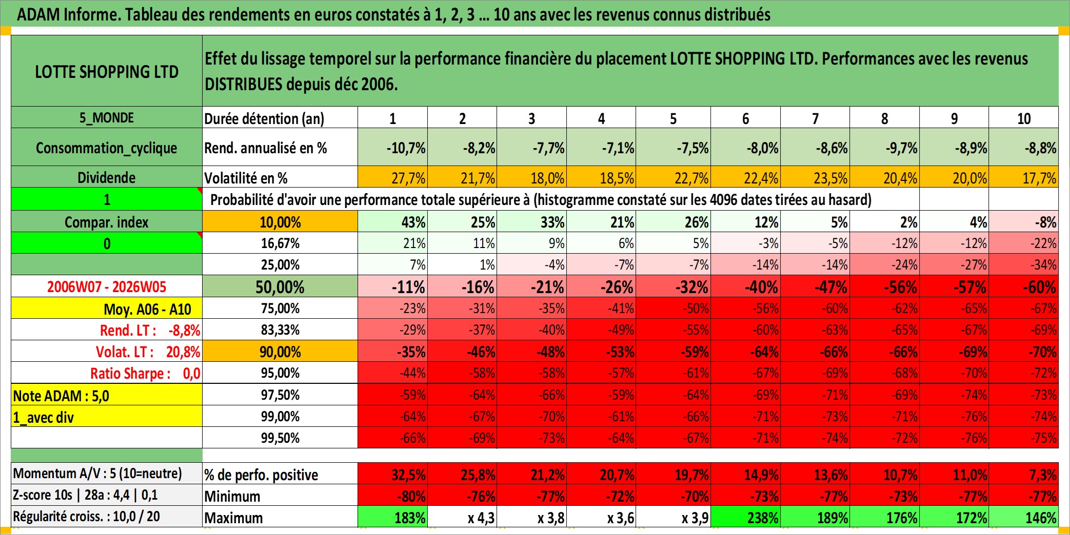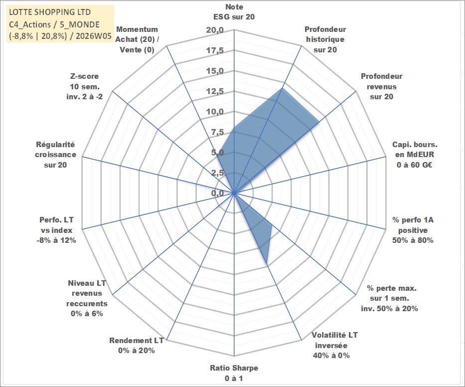 Site dédié aux investisseursPage dédiée sur site financeAnalyse des valorisations hebdomadaires de l'action LOTTE SHOPPING LTD. Cet actif est cote en KRW. Les valorisations sont en contrevaleur EURO et couvrent les semaines 2006W07 a 2026W05. Les revenus de cet actif financier sont pris en compte depuis la semaine 2006W52. La note globale ESG de cet actif est estimee a 8.0 (apres rebasage entre 0 et 20).