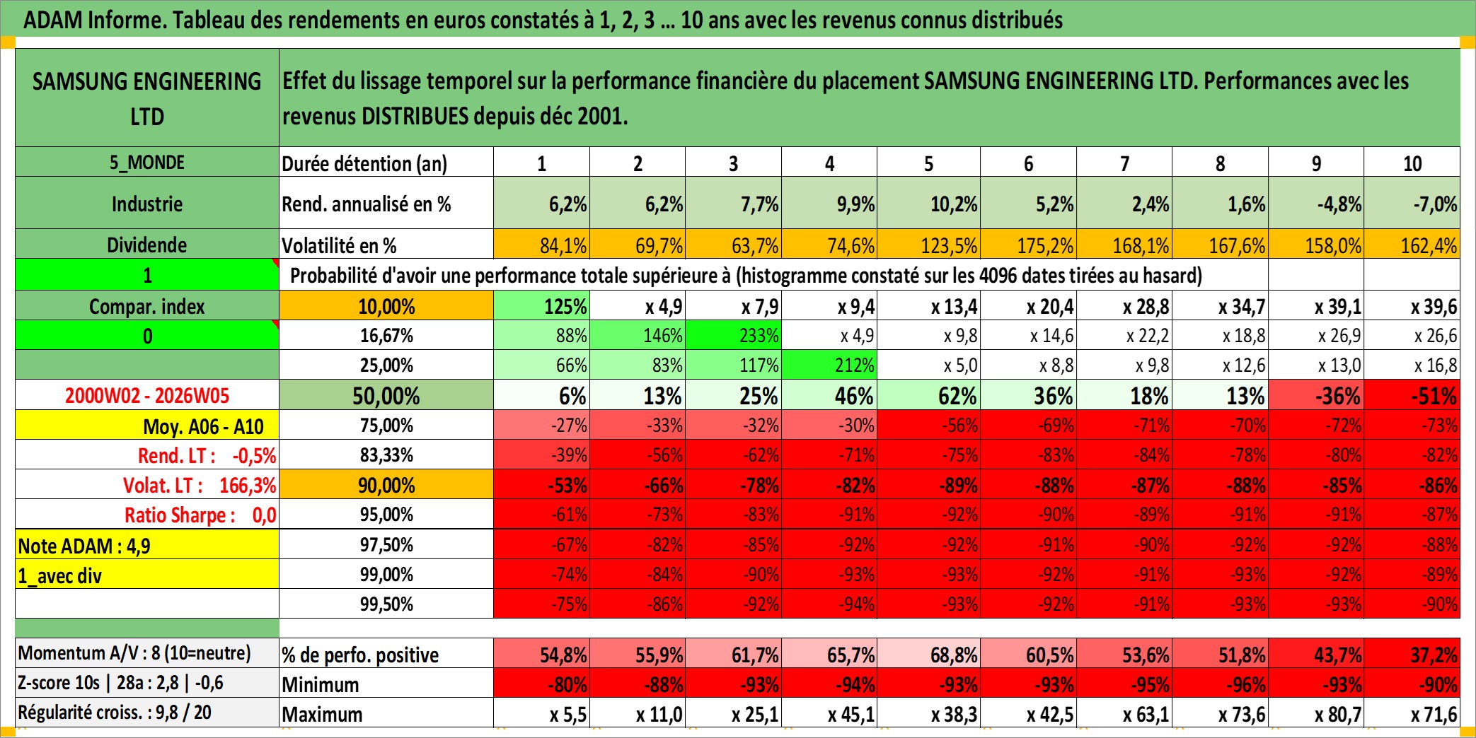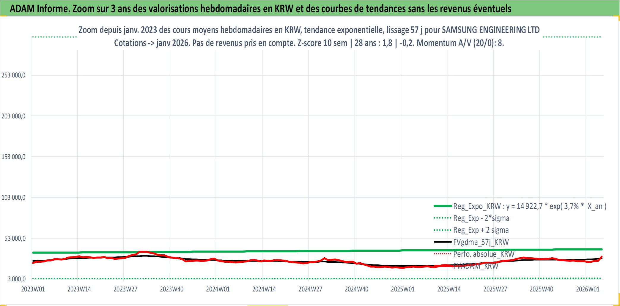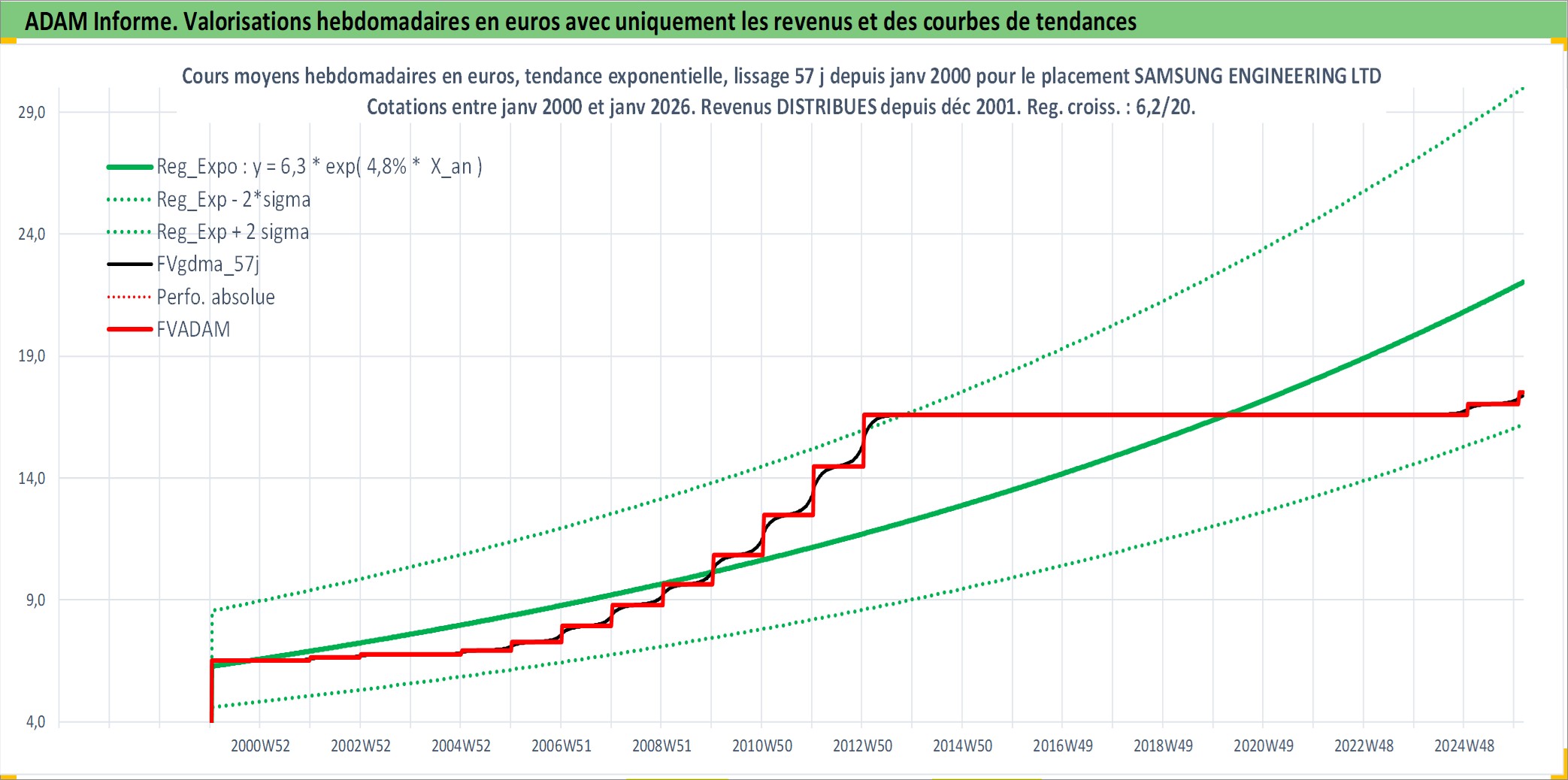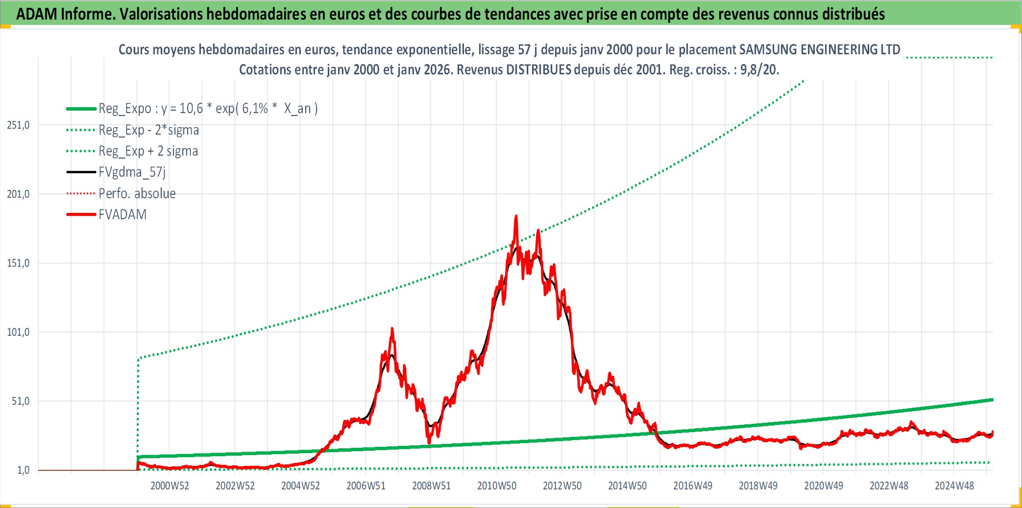 Site dédié aux investisseursPage dédiée sur site financeAnalyse des valorisations hebdomadaires de l'action SAMSUNG ENGINEERING LTD. Cet actif est cote en KRW. Les valorisations sont en contrevaleur EURO et couvrent les semaines 2000W02 a 2026W05. Les revenus de cet actif financier sont pris en compte depuis la semaine 2001W52. La note ESG de cet actif n'est pas connue.