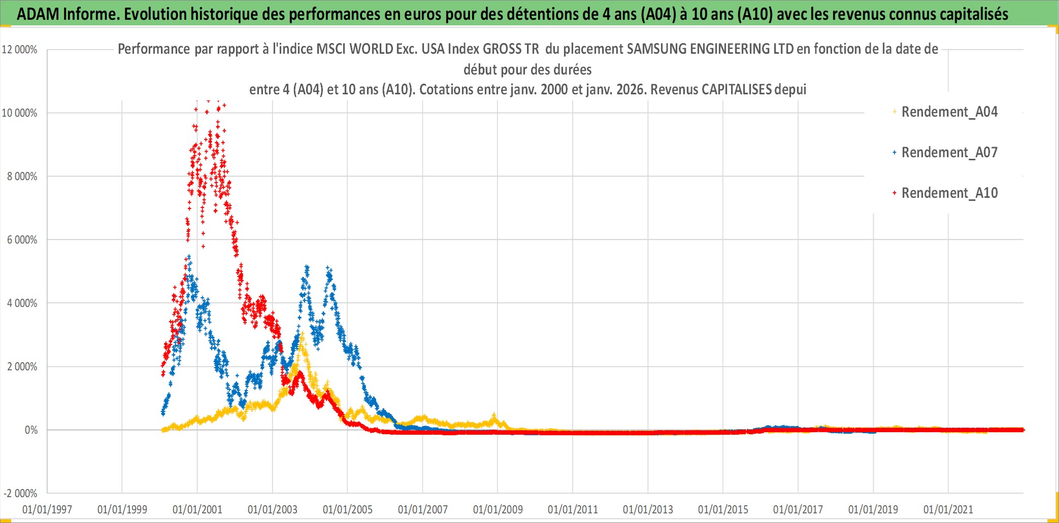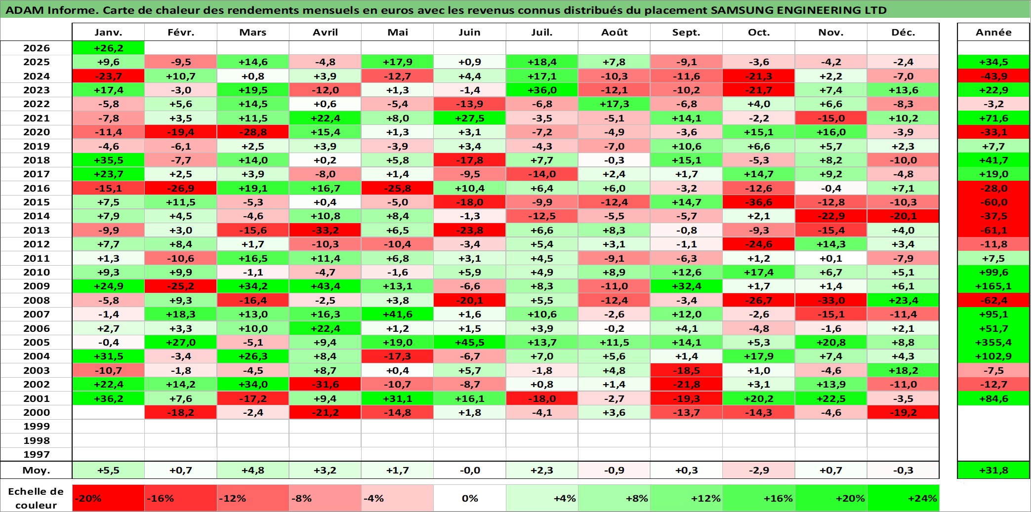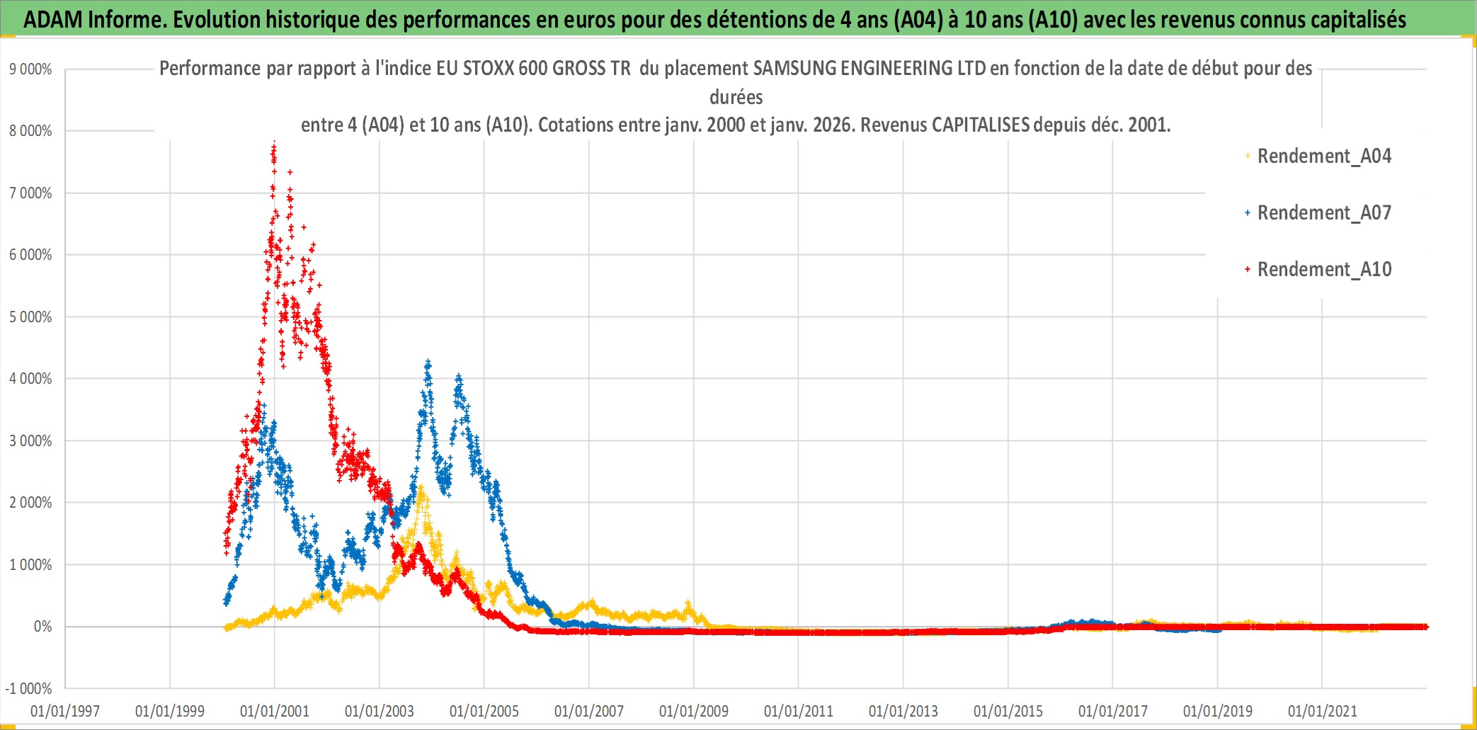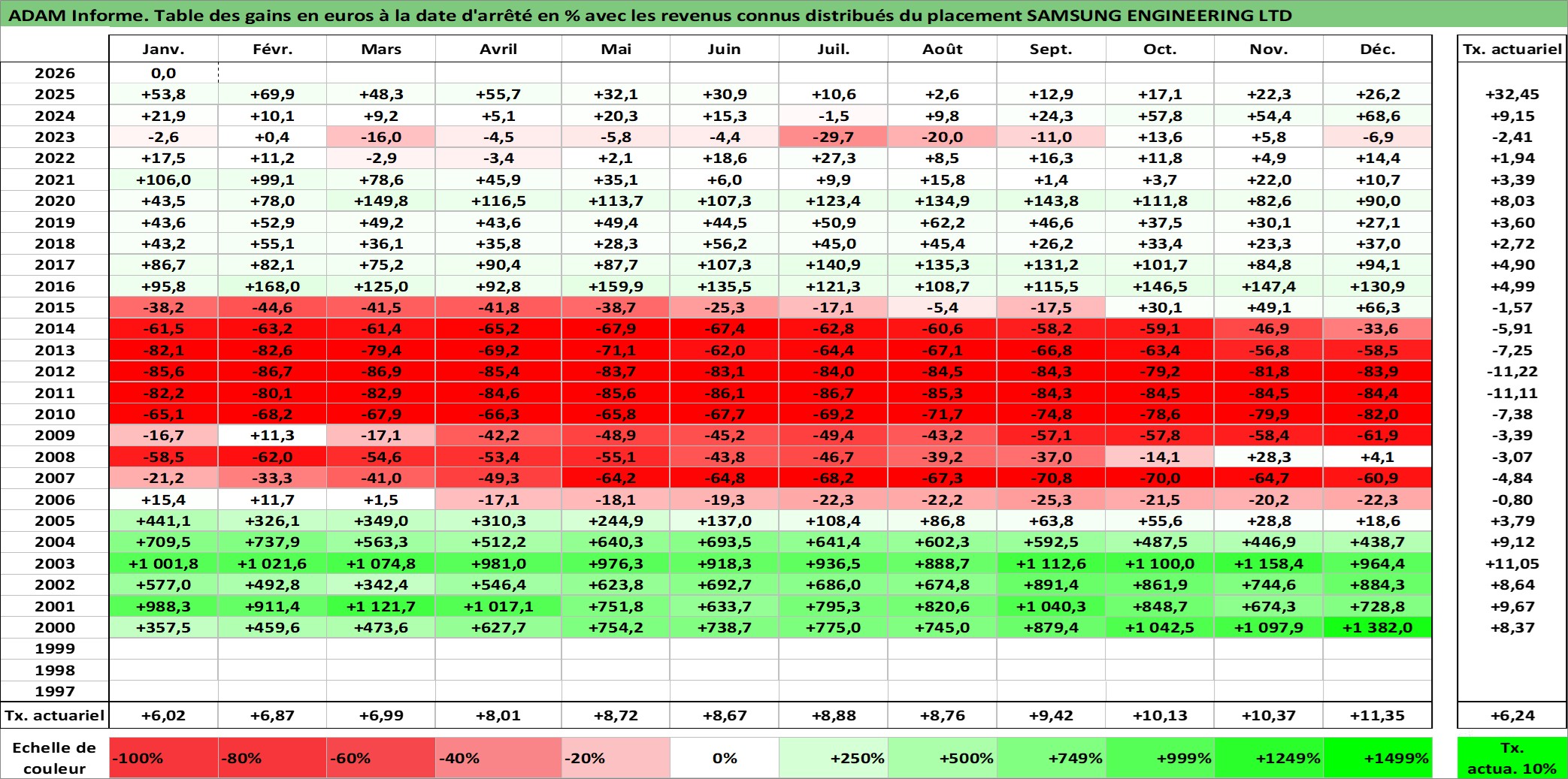Site dédié aux investisseursPage dédiée sur site financeAnalyse des valorisations hebdomadaires de l'action SAMSUNG ENGINEERING LTD. Cet actif est cote en KRW. Les valorisations sont en contrevaleur EURO et couvrent les semaines 2000W02 a 2026W05. Les revenus de cet actif financier sont pris en compte depuis la semaine 2001W52. La note ESG de cet actif n'est pas connue.