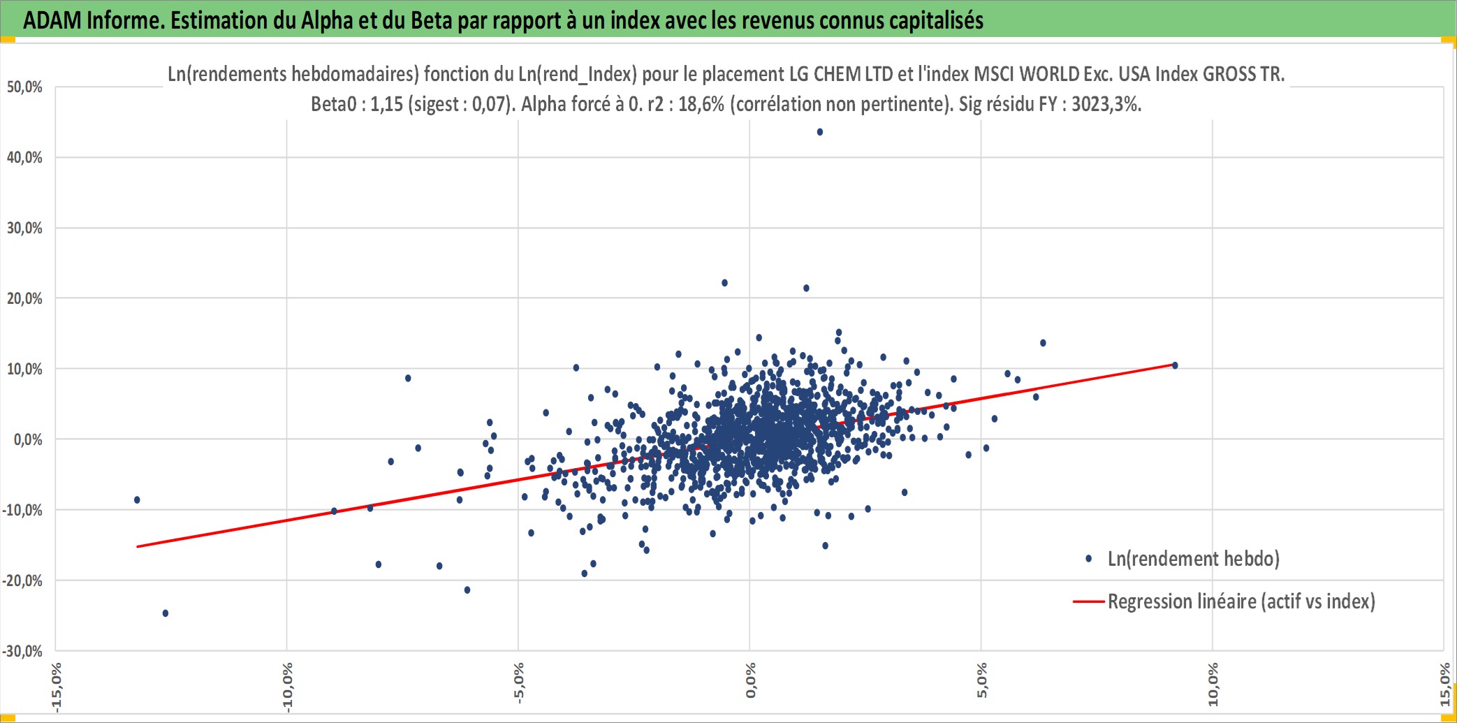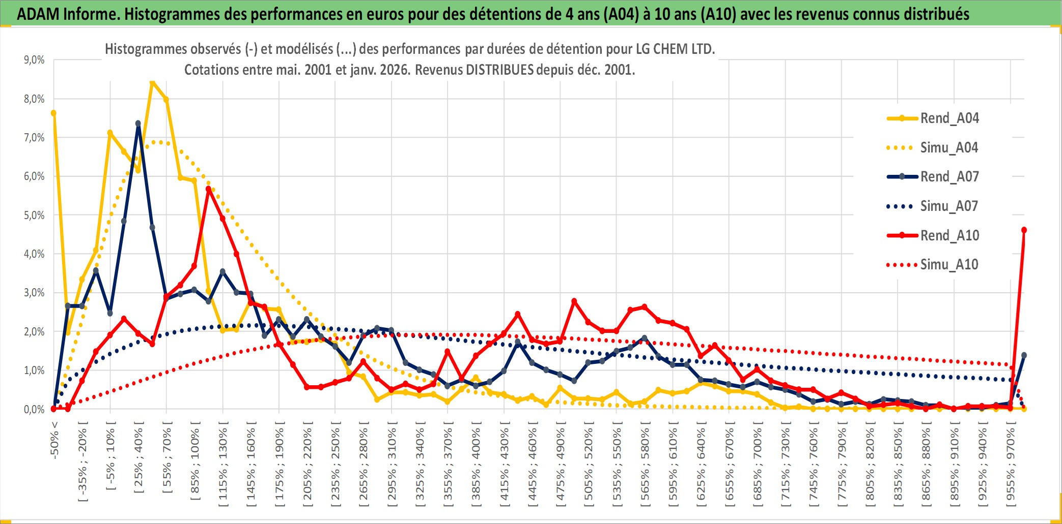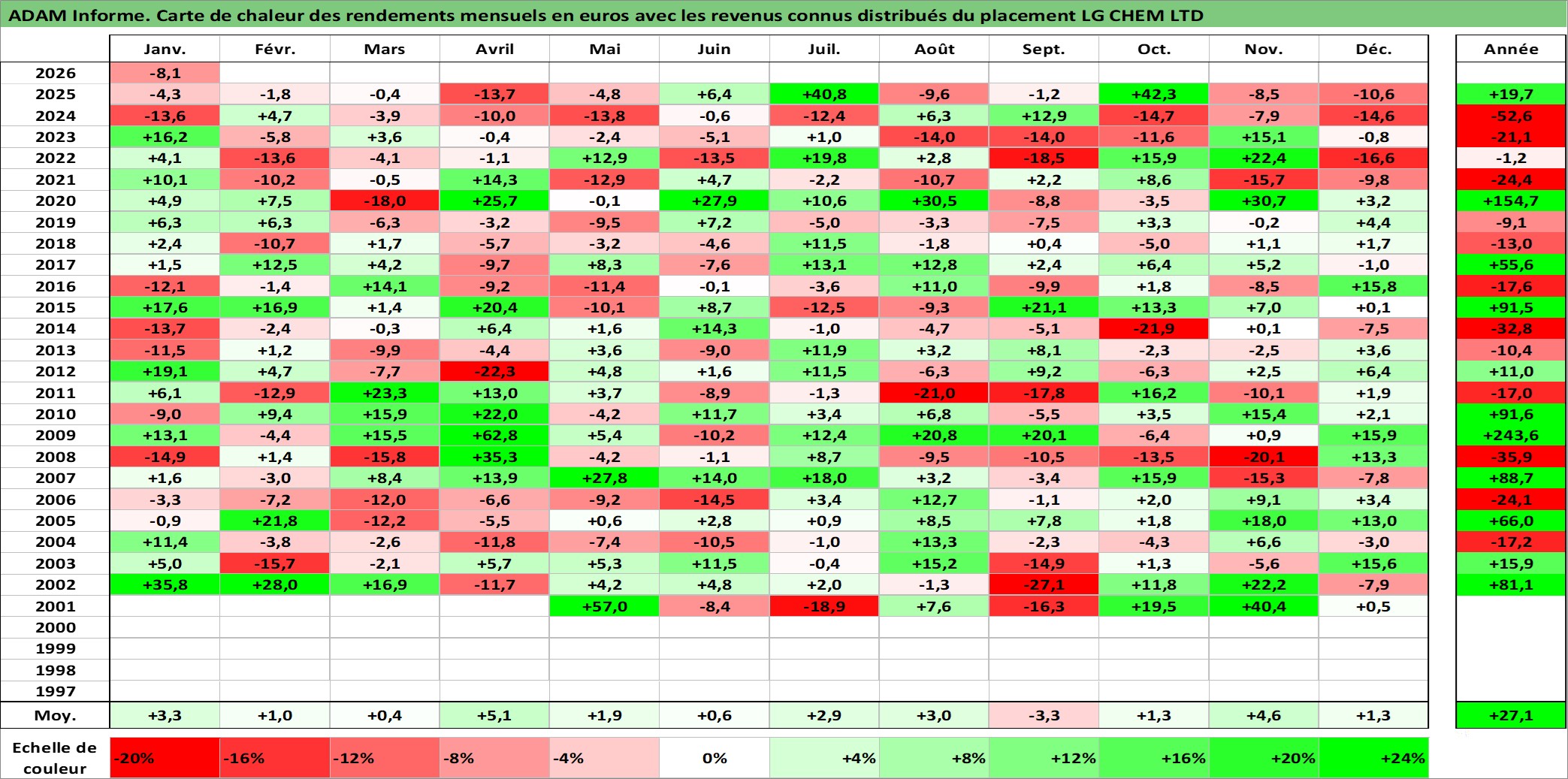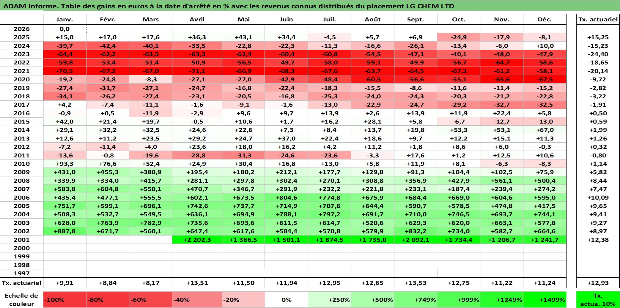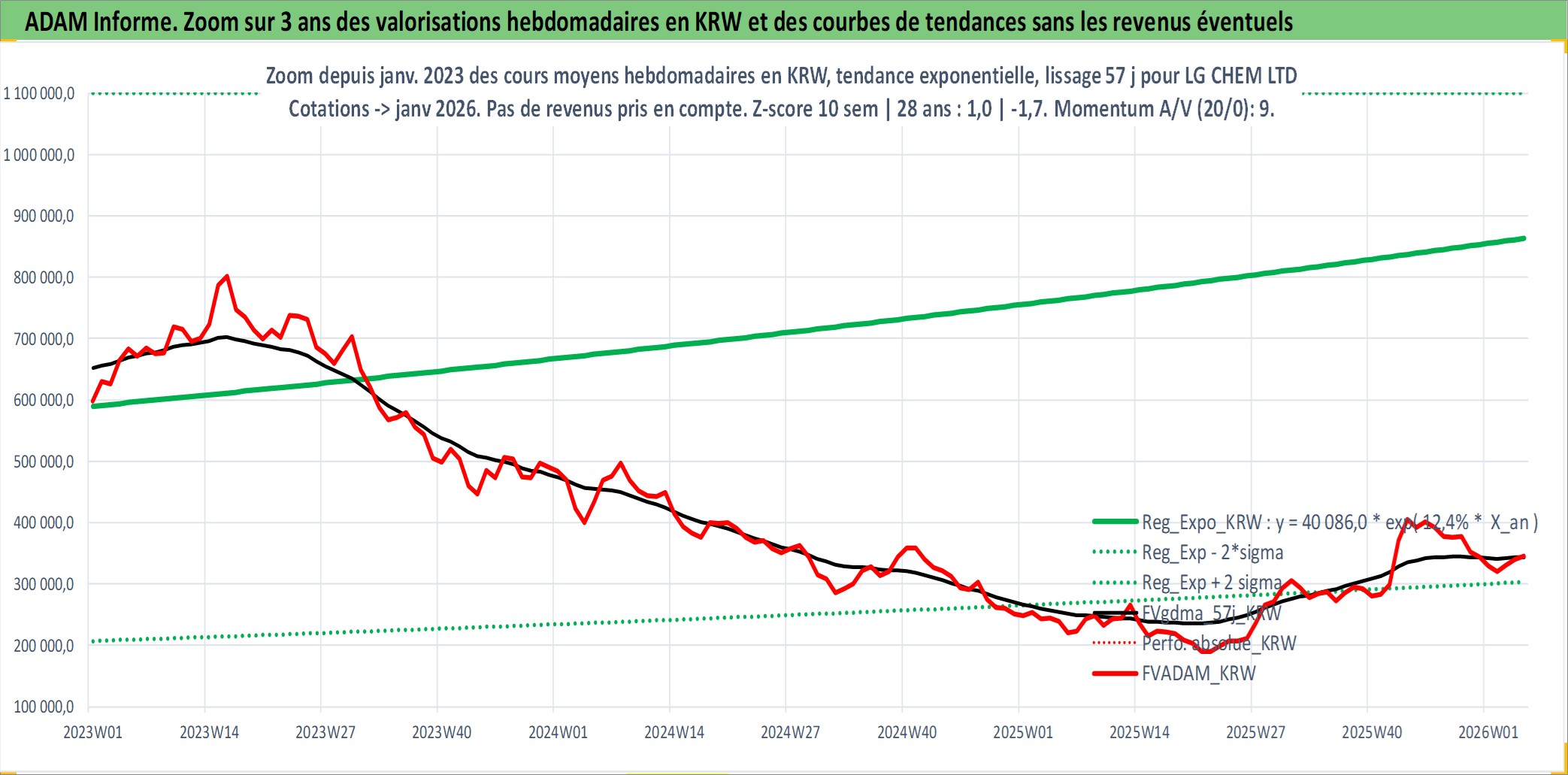 Site dédié aux investisseursPage dédiée sur site financeAnalyse des valorisations hebdomadaires de l'action LG CHEM LTD. Cet actif est cote en KRW. Les valorisations sont en contrevaleur EURO et couvrent les semaines 2001W21 a 2026W05. Les revenus de cet actif financier sont pris en compte depuis la semaine 2001W52. La note globale ESG de cet actif est estimee a 7.0 (apres rebasage entre 0 et 20).