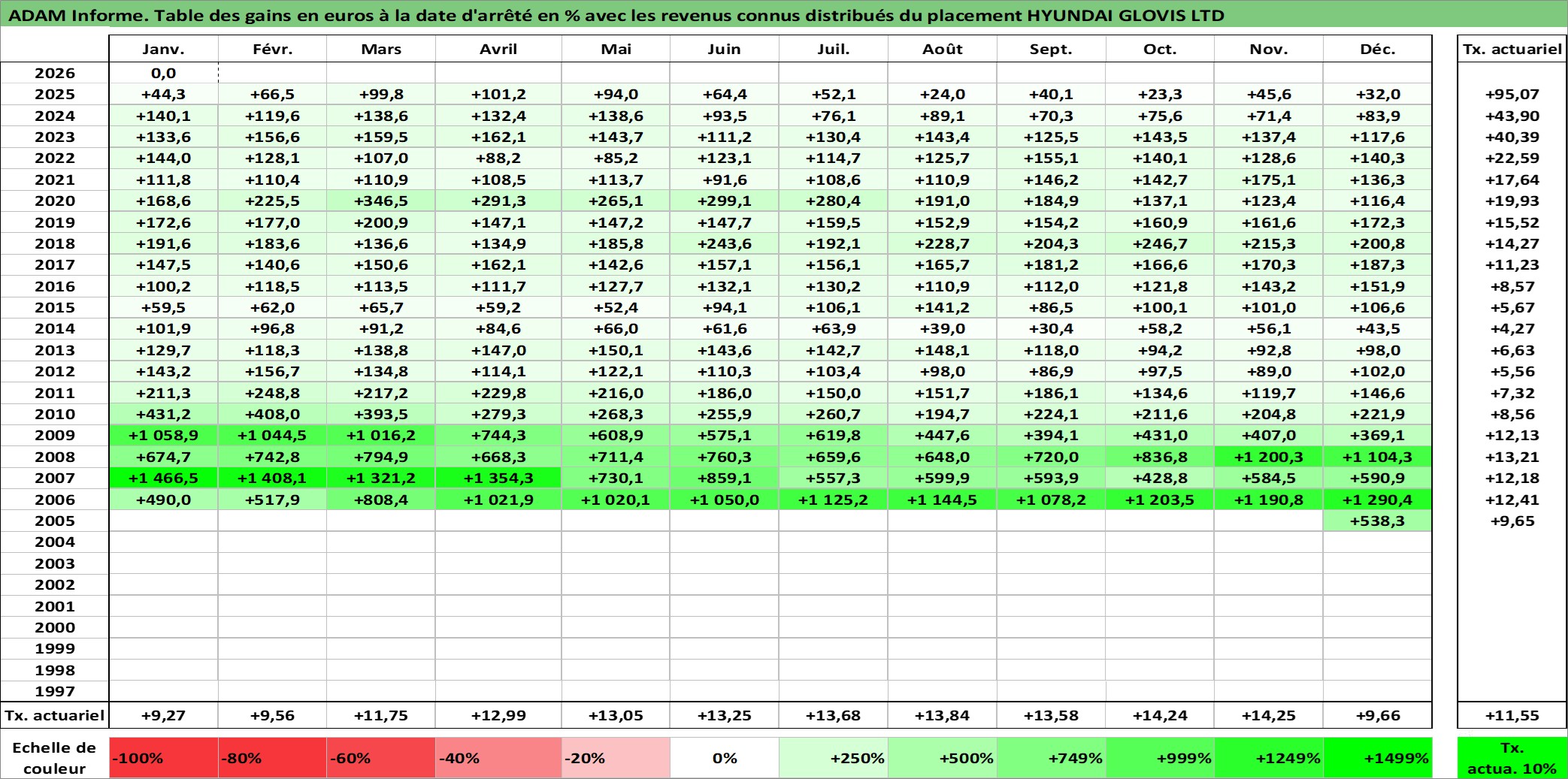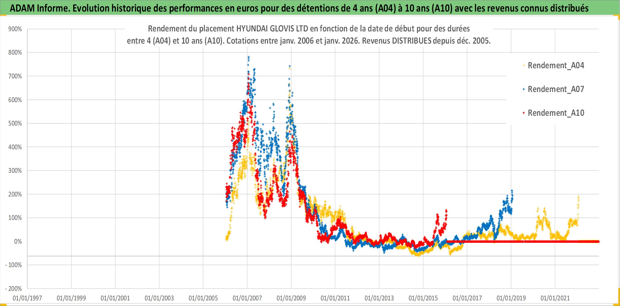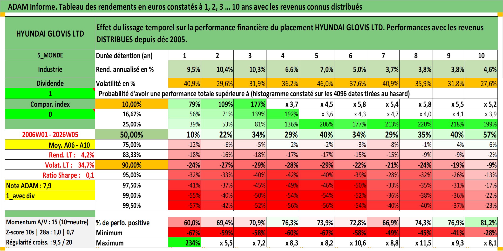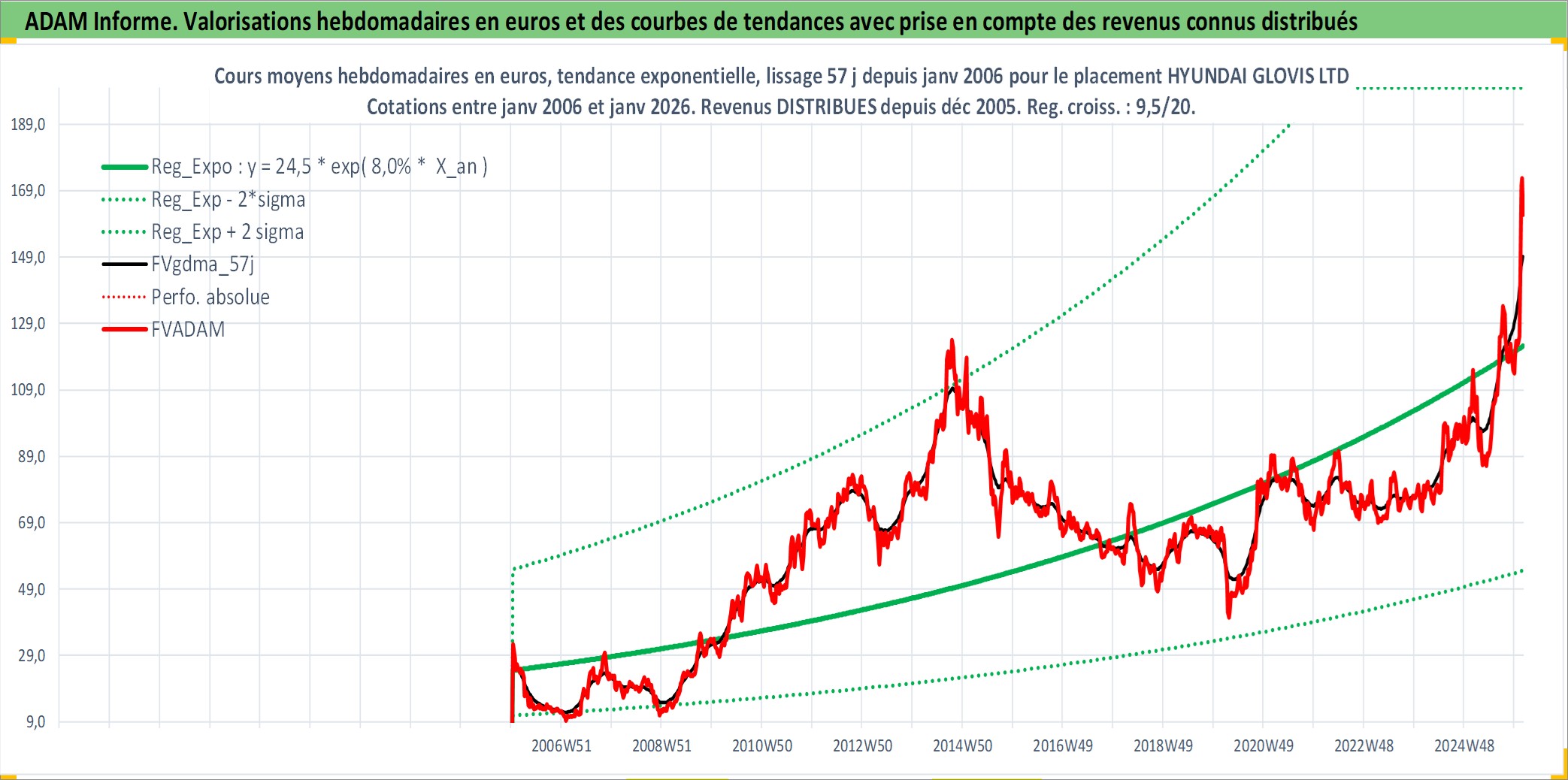 Site dédié aux investisseursPage dédiée sur site financeAnalyse des valorisations hebdomadaires de l'action HYUNDAI GLOVIS LTD. Cet actif est cote en KRW. Les valorisations sont en contrevaleur EURO et couvrent les semaines 2006W01 a 2026W05. Les revenus de cet actif financier sont pris en compte depuis la semaine 2005W52. La note globale ESG de cet actif est estimee a 13.0 (apres rebasage entre 0 et 20).