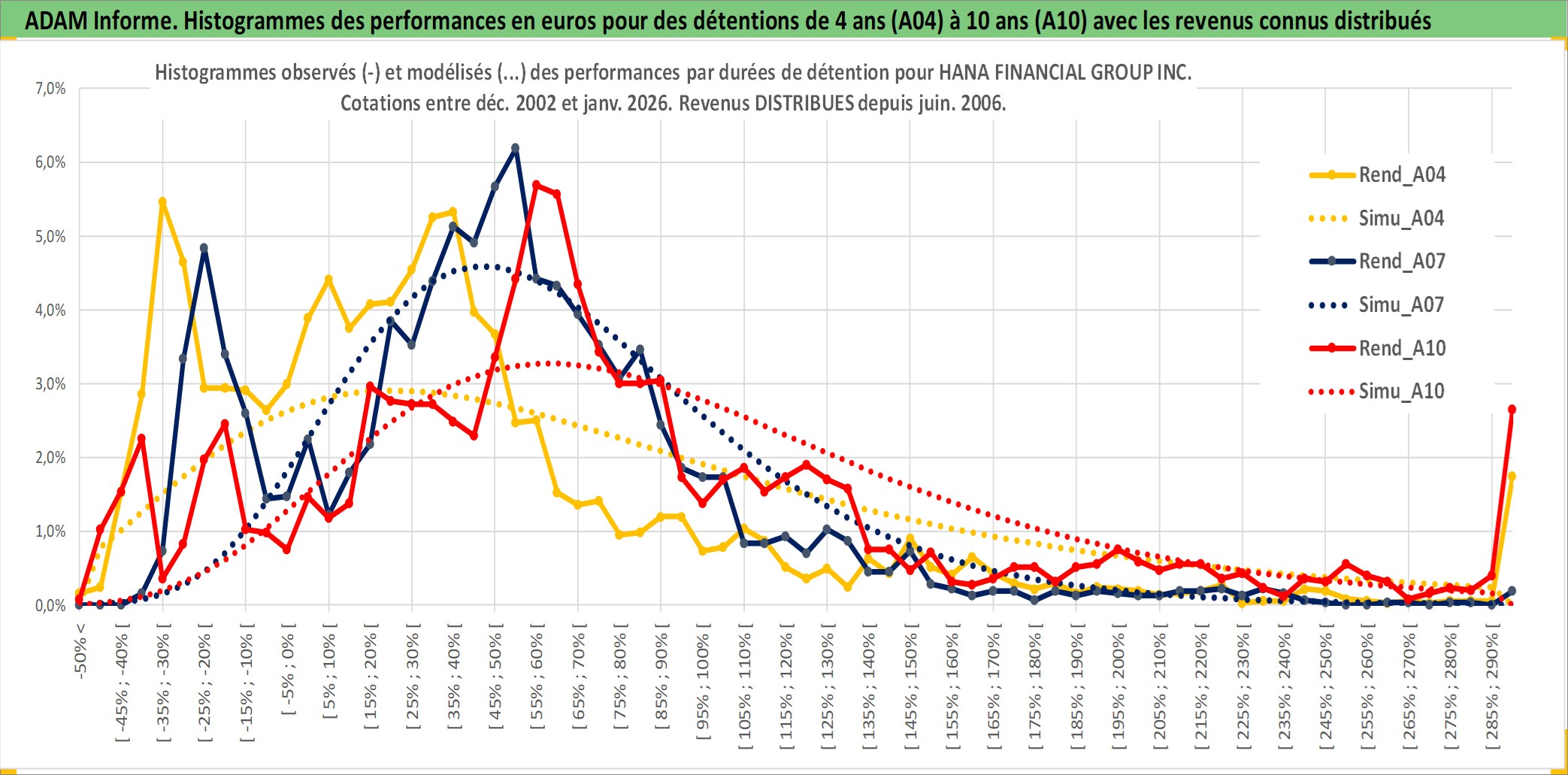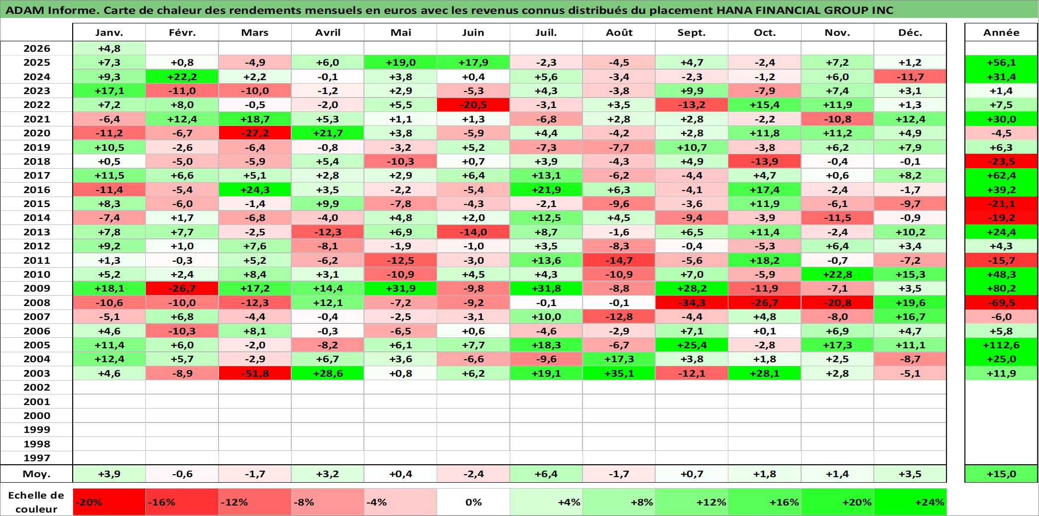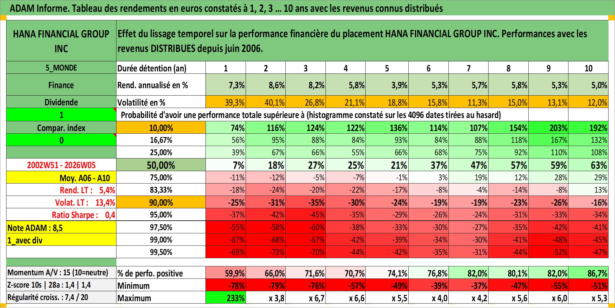Site dédié aux investisseursPage dédiée sur site financeAnalyse des valorisations hebdomadaires de l'action HANA FINANCIAL GROUP INC. Cet actif est cote en KRW. Les valorisations sont en contrevaleur EURO et couvrent les semaines 2002W51 a 2026W05. Les revenus de cet actif financier sont pris en compte depuis la semaine 2006W26. La note globale ESG de cet actif est estimee a 7.0 (apres rebasage entre 0 et 20).