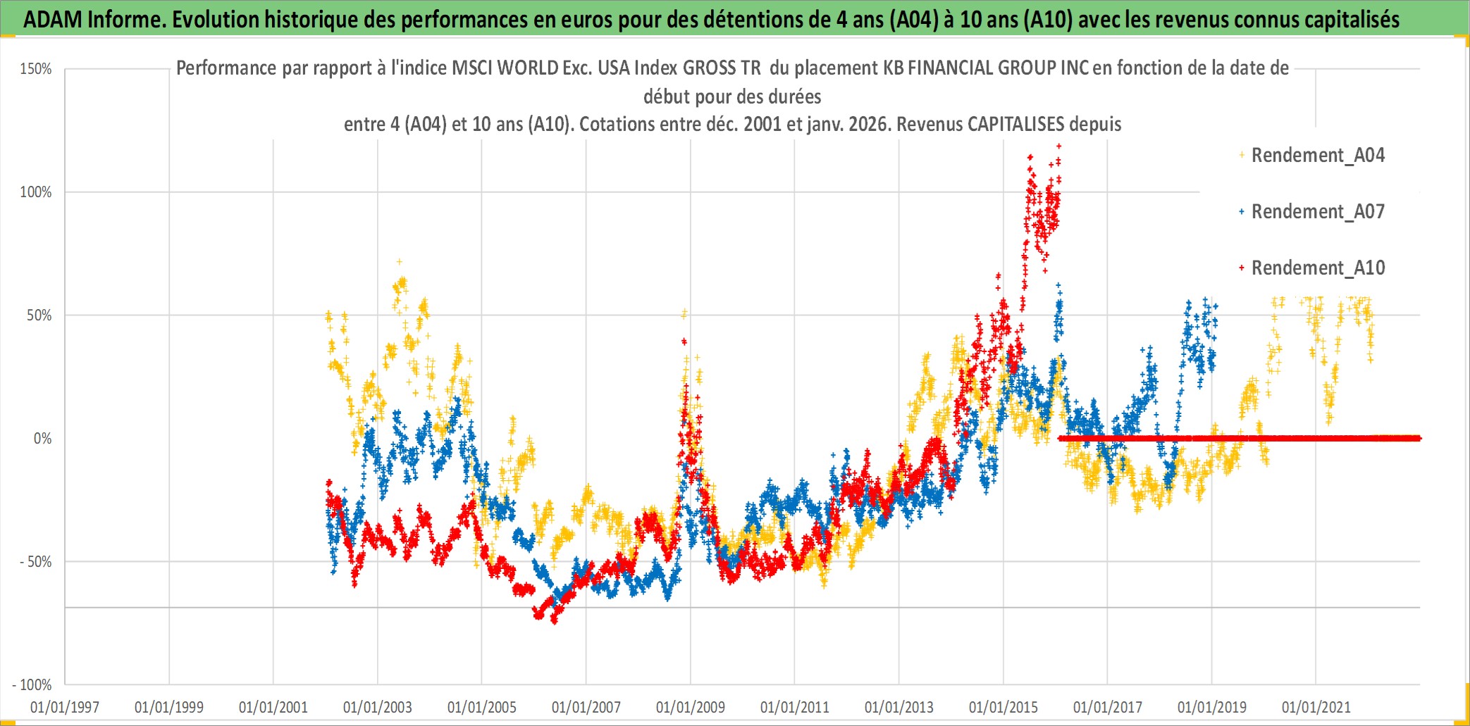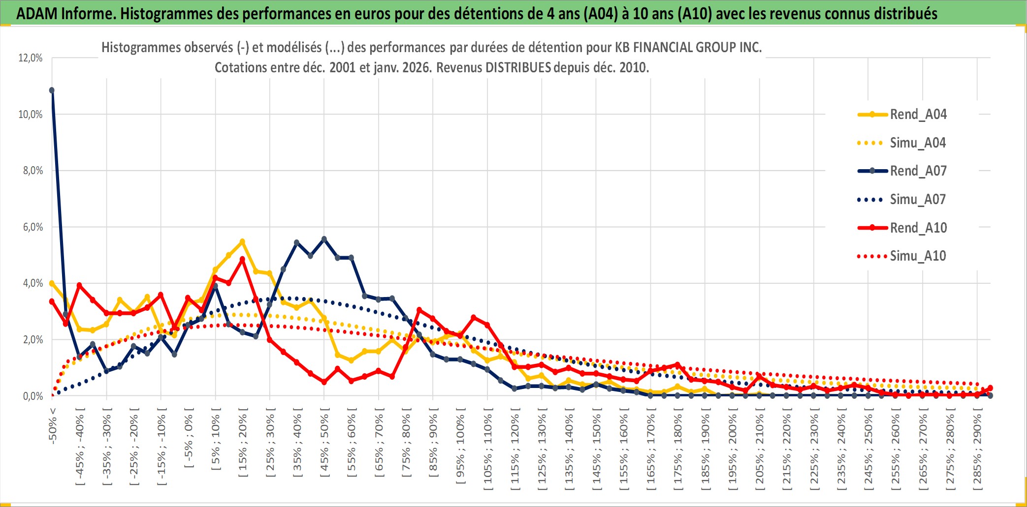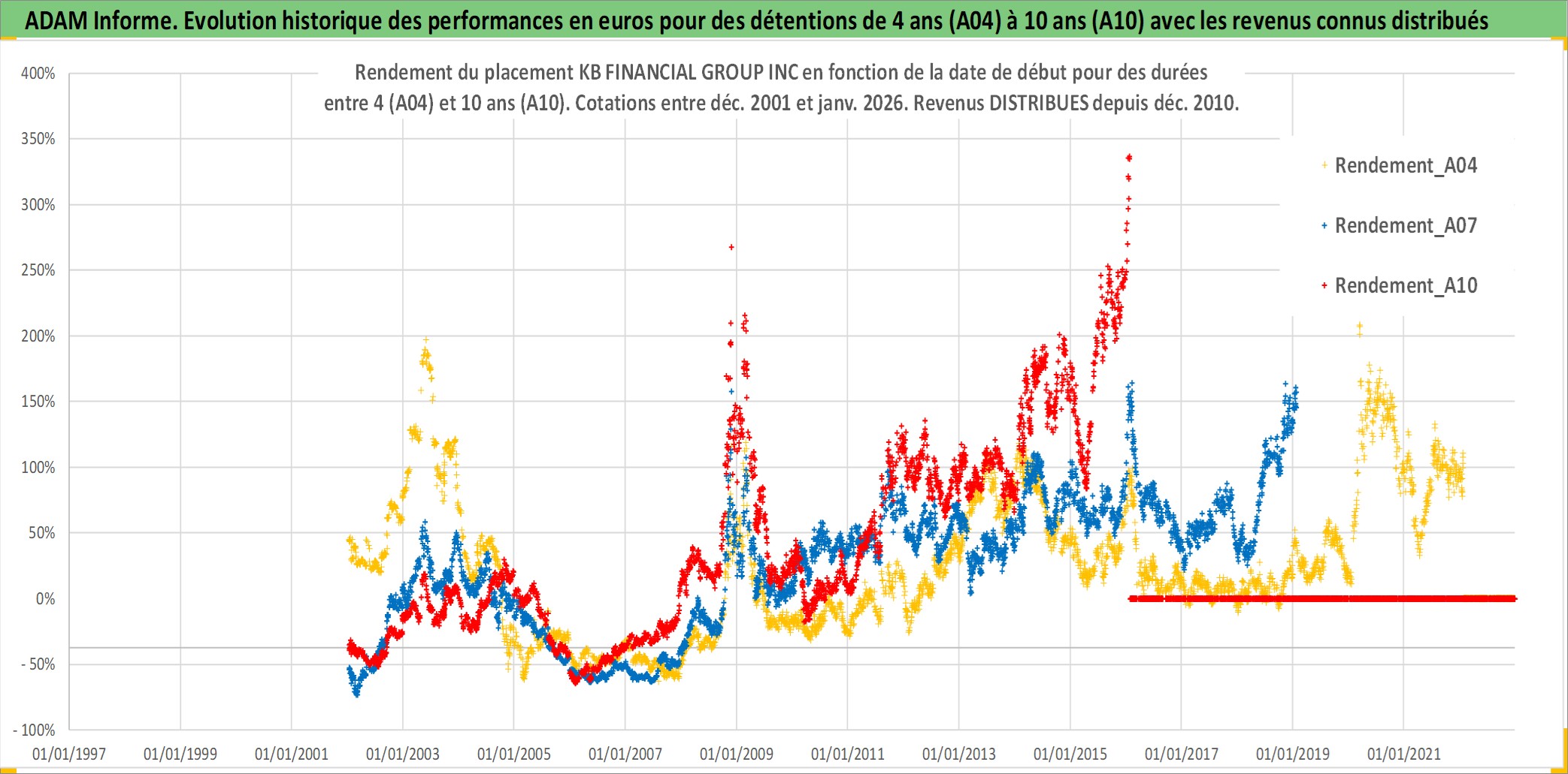 Site dédié aux investisseursPage dédiée sur site financeAnalyse des valorisations hebdomadaires de l'action KB FINANCIAL GROUP INC. Cet actif est cote en KRW. Les valorisations sont en contrevaleur EURO et couvrent les semaines 2002W01 a 2026W05. Les revenus de cet actif financier sont pris en compte depuis la semaine 2010W52. La note globale ESG de cet actif est estimee a 6.0 (apres rebasage entre 0 et 20).
