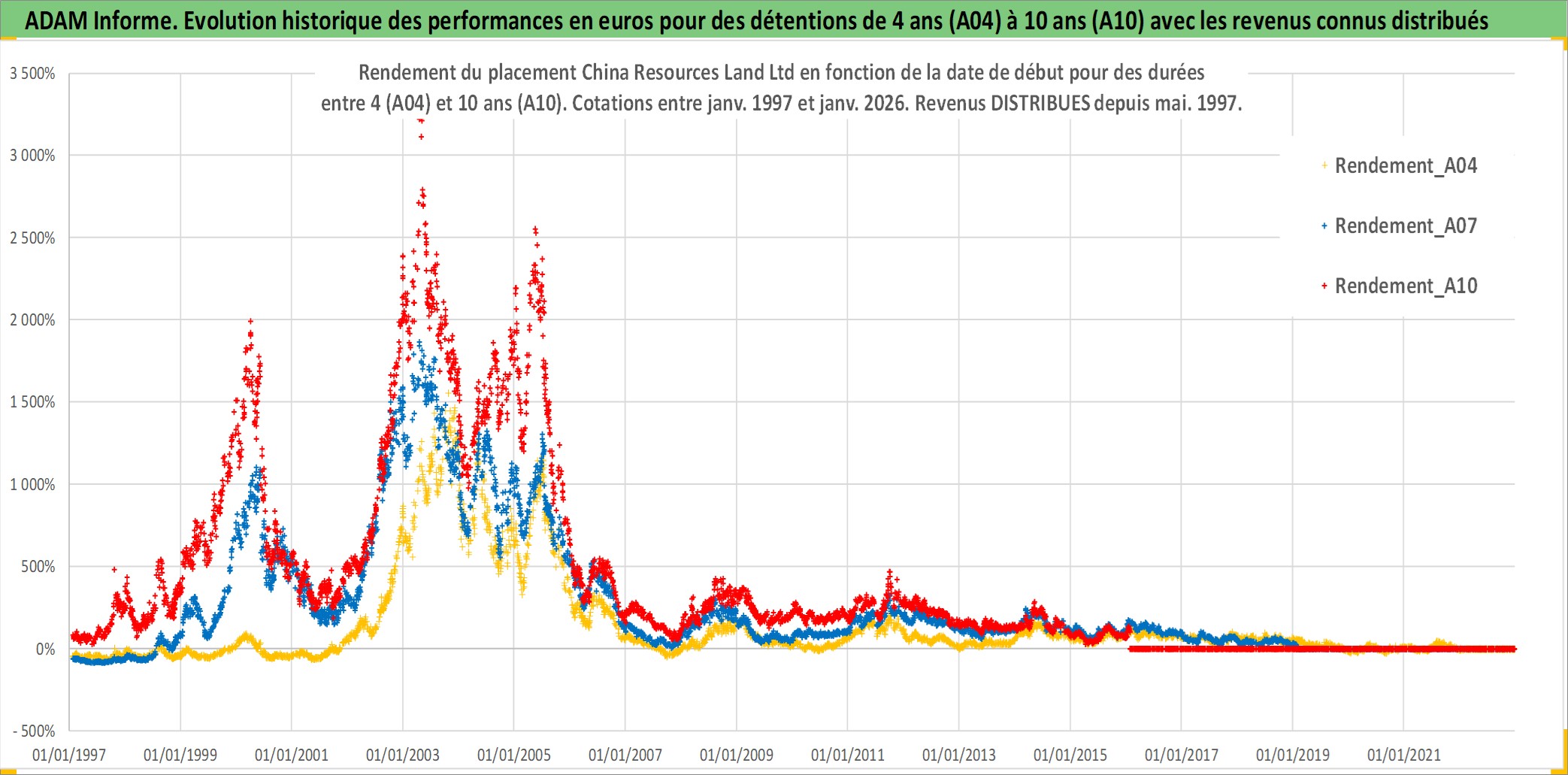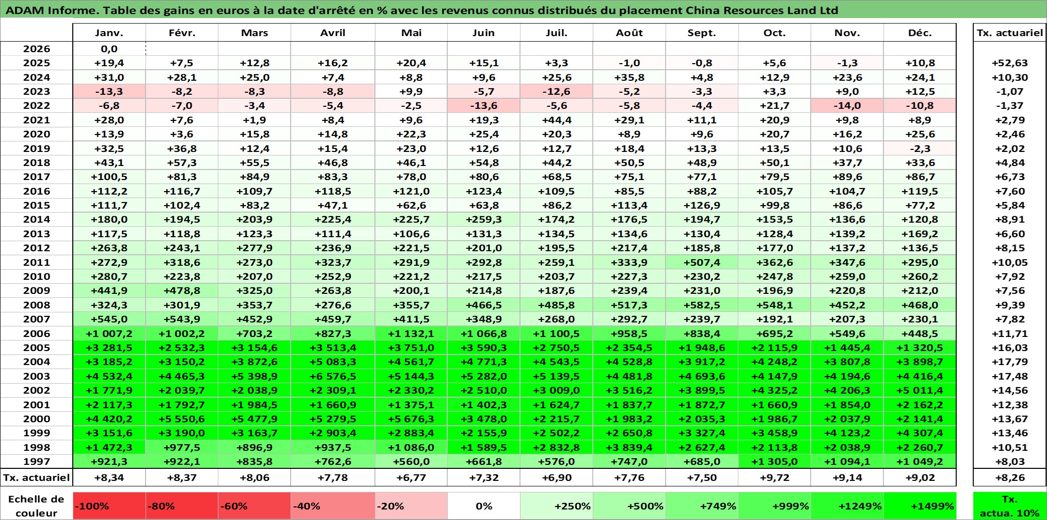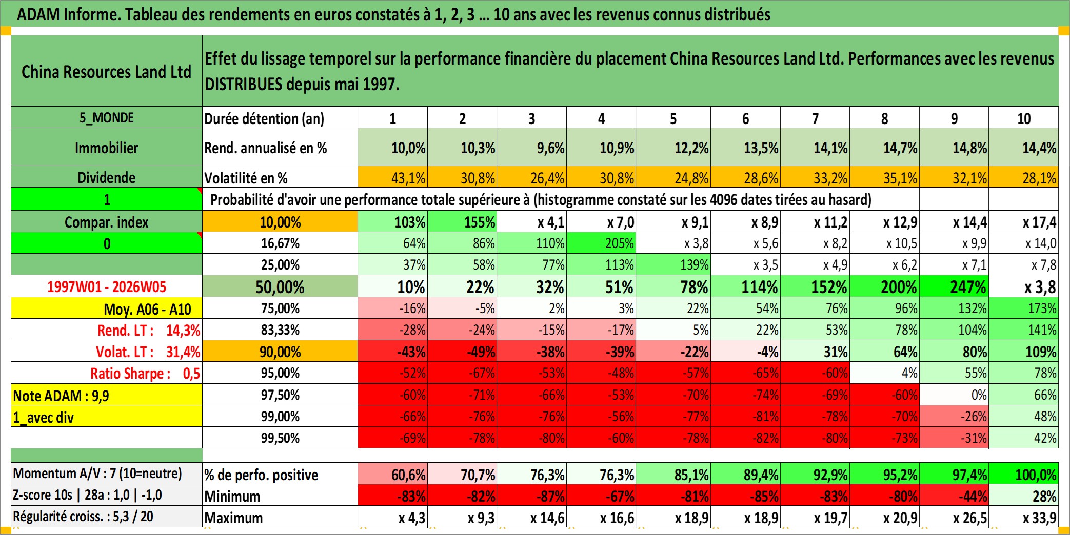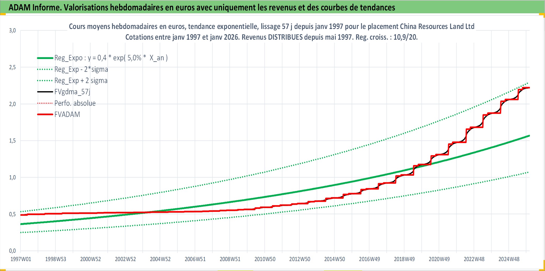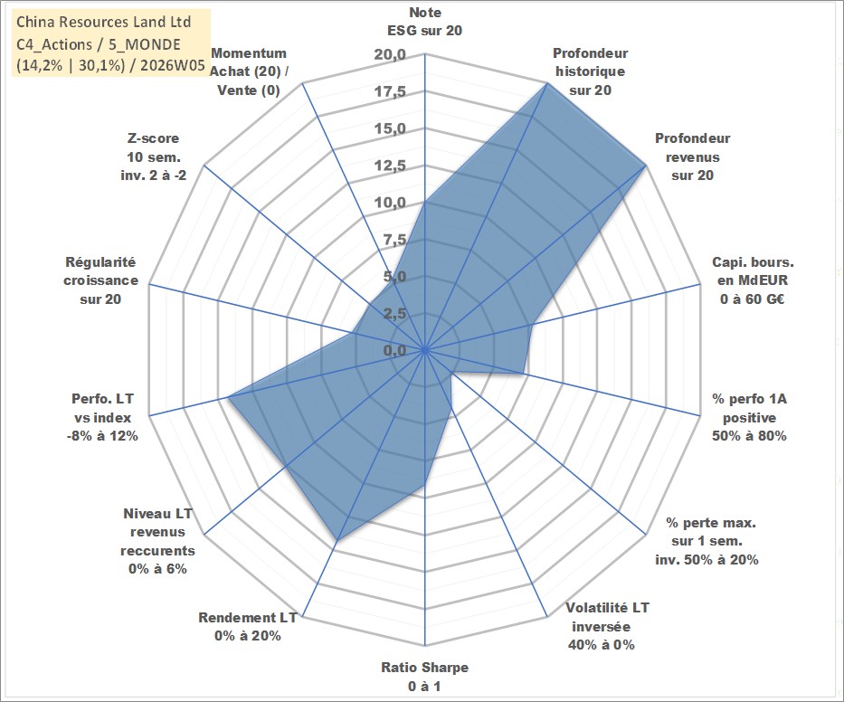 Site dédié aux investisseursPage dédiée sur site financeAnalyse des valorisations hebdomadaires de l'action China Resources Land Ltd. Cet actif est cote en HKD. Les valorisations sont en contrevaleur EURO et couvrent les semaines 1997W01 a 2026W05. Les revenus de cet actif financier sont pris en compte depuis la semaine 1997W21. La note globale ESG de cet actif est estimee a 10.0 (apres rebasage entre 0 et 20).