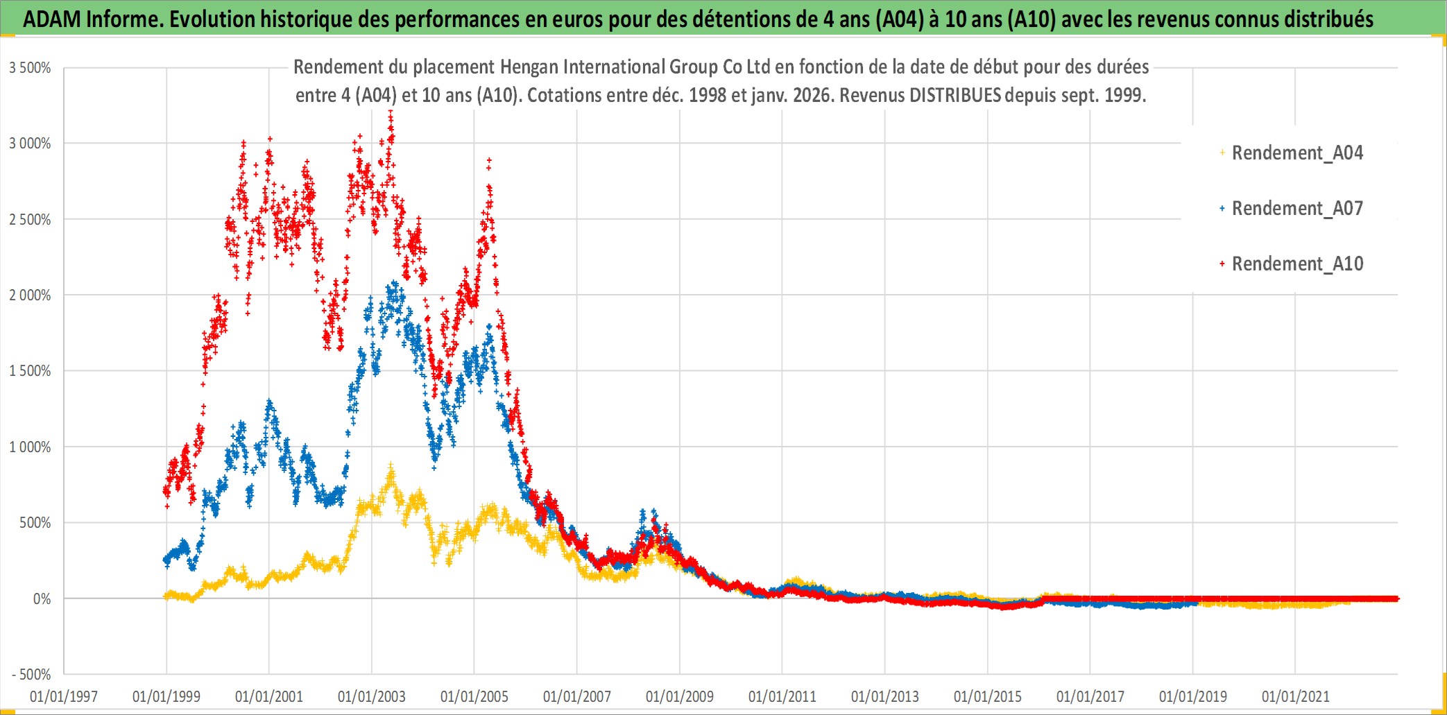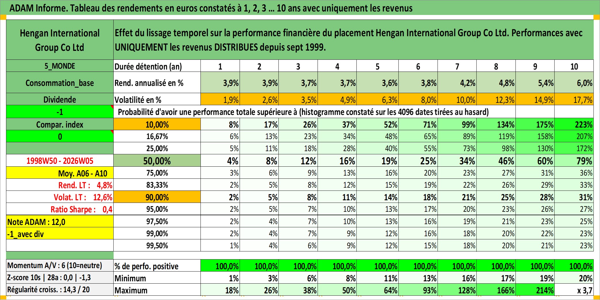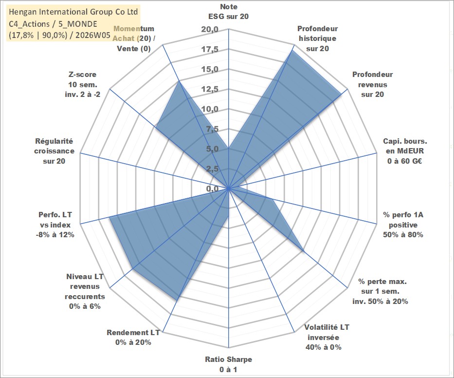 Site dédié aux investisseursPage dédiée sur site financeAnalyse des valorisations hebdomadaires de l'action Hengan International Group Co Ltd. Cet actif est cote en HKD. Les valorisations sont en contrevaleur EURO et couvrent les semaines 1998W50 a 2026W05. Les revenus de cet actif financier sont pris en compte depuis la semaine 1999W37. La note globale ESG de cet actif est estimee a 5.0 (apres rebasage entre 0 et 20).