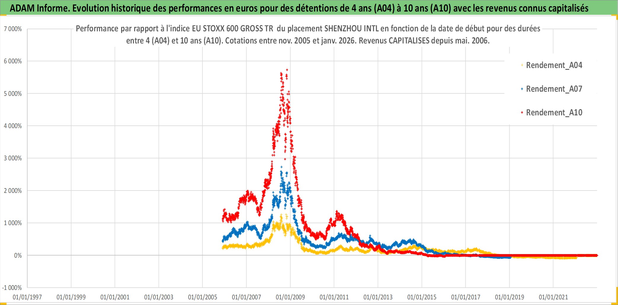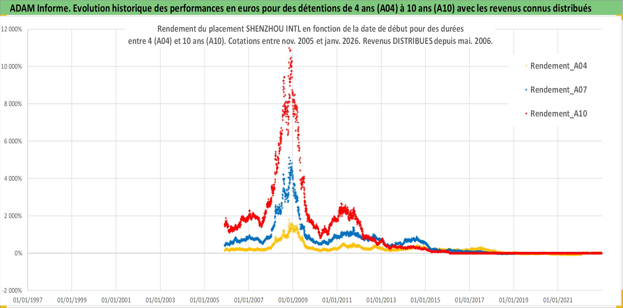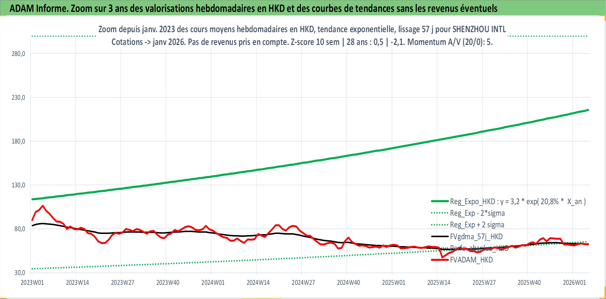 Site dédié aux investisseursPage dédiée sur site financeAnalyse des valorisations hebdomadaires de l'action SHENZHOU INTL. Cet actif est cote en HKD. Les valorisations sont en contrevaleur EURO et couvrent les semaines 2005W47 a 2026W05. Les revenus de cet actif financier sont pris en compte depuis la semaine 2006W22. La note globale ESG de cet actif est estimee a 12.0 (apres rebasage entre 0 et 20).