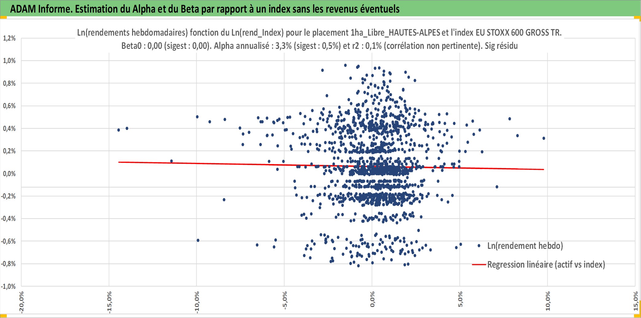 Site dédié aux investisseursPage dédiée sur site financeAnalyse des valorisations hebdomadaires de l'actif 1ha_Libre_HAUTES-ALPES. Cet actif est cote en EUR. Les valorisations couvrent les semaines 1997W01 a 2026W05. Les fermages de ce bien foncier sont pris egaux a 2,5% annuels de la valeur venale du bien.