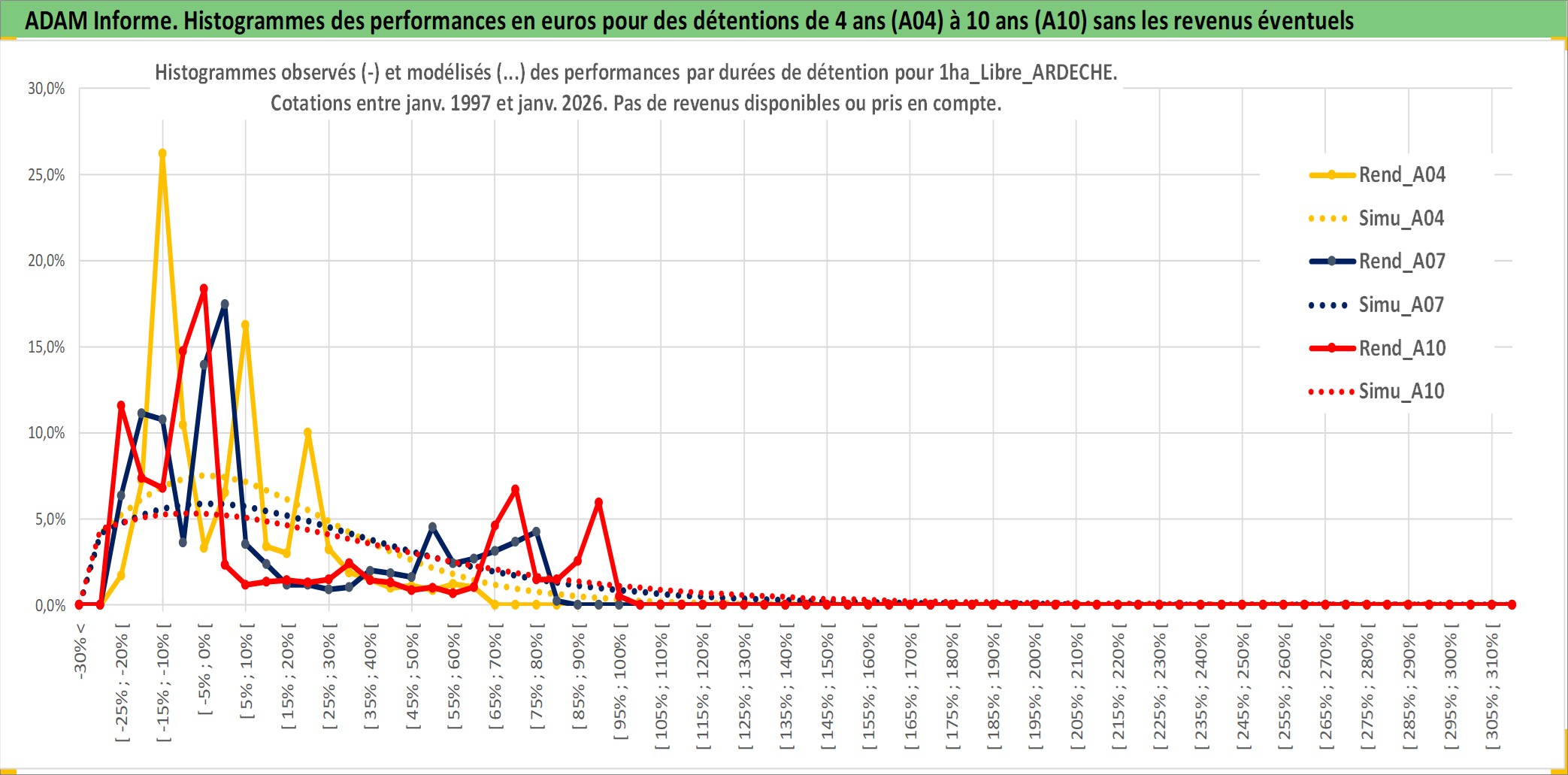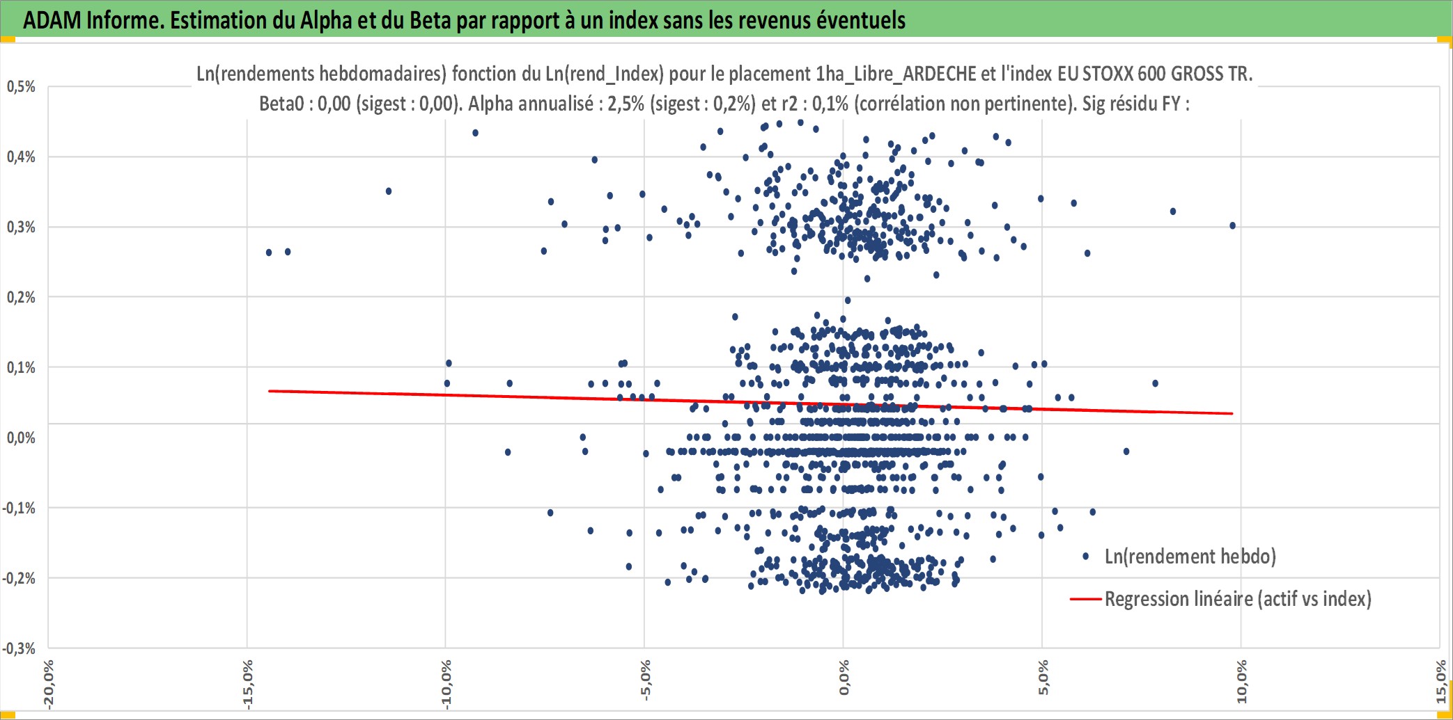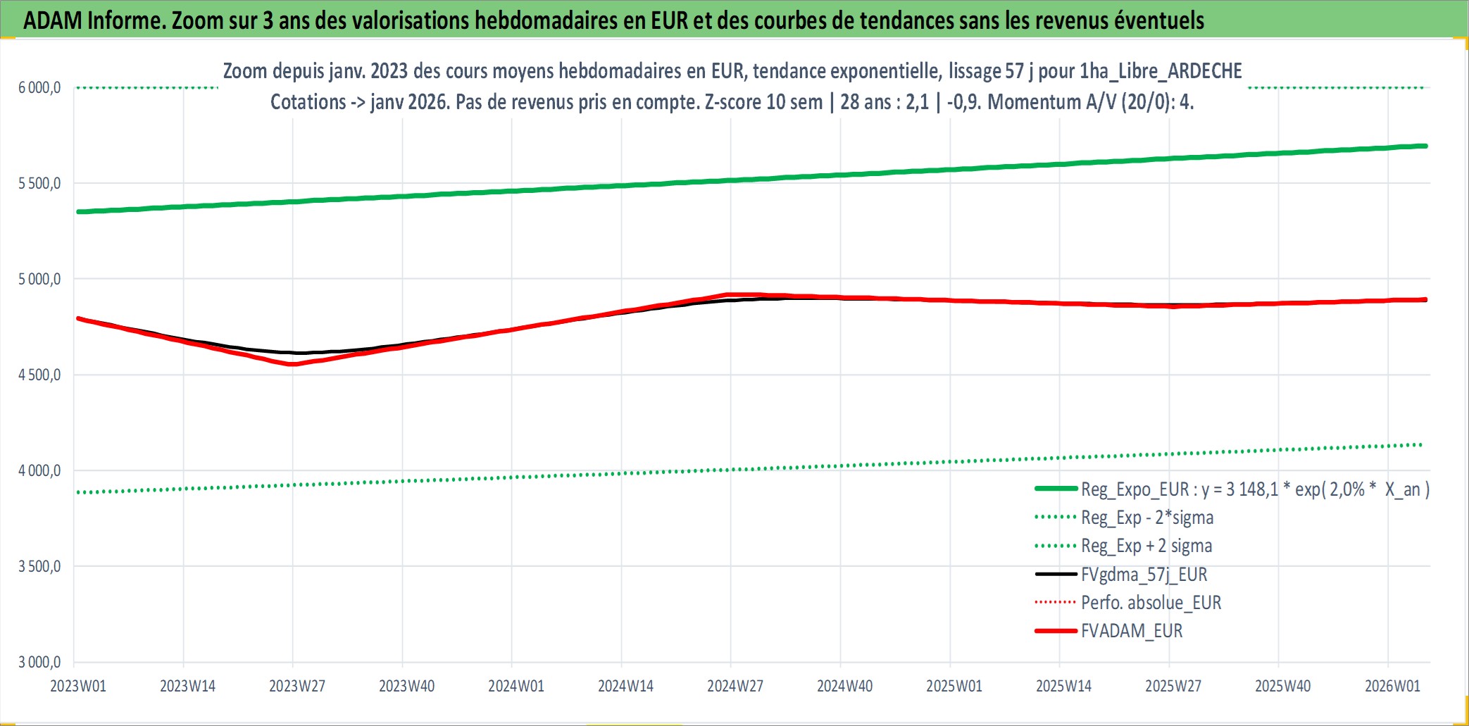 Site dédié aux investisseursPage dédiée sur site financeAnalyse des valorisations hebdomadaires de l'actif 1ha_Libre_ARDECHE. Cet actif est cote en EUR. Les valorisations couvrent les semaines 1997W01 a 2026W05. Les fermages de ce bien foncier sont pris egaux a 2,5% annuels de la valeur venale du bien.