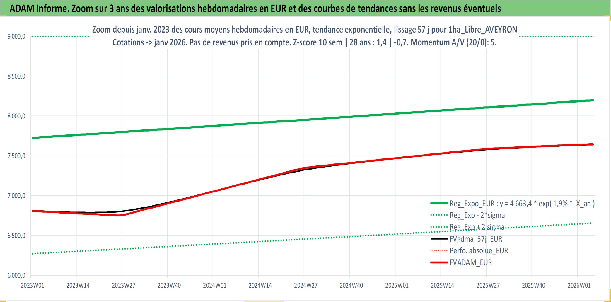 Site dédié aux investisseursPage dédiée sur site financeAnalyse des valorisations hebdomadaires de l'actif 1ha_Libre_AVEYRON. Cet actif est cote en EUR. Les valorisations couvrent les semaines 1997W01 a 2026W05. Les fermages de ce bien foncier sont pris egaux a 2,5% annuels de la valeur venale du bien.