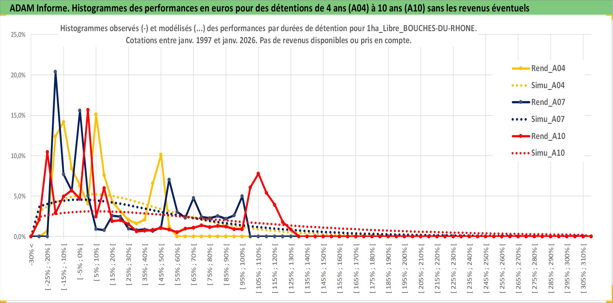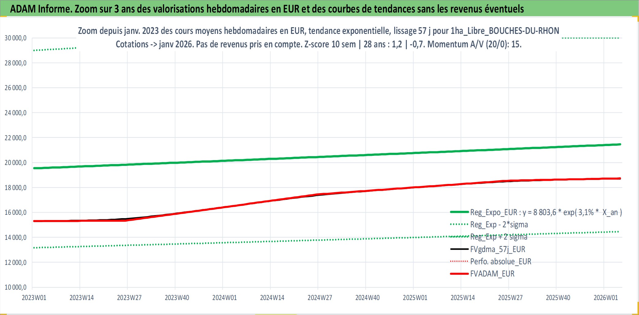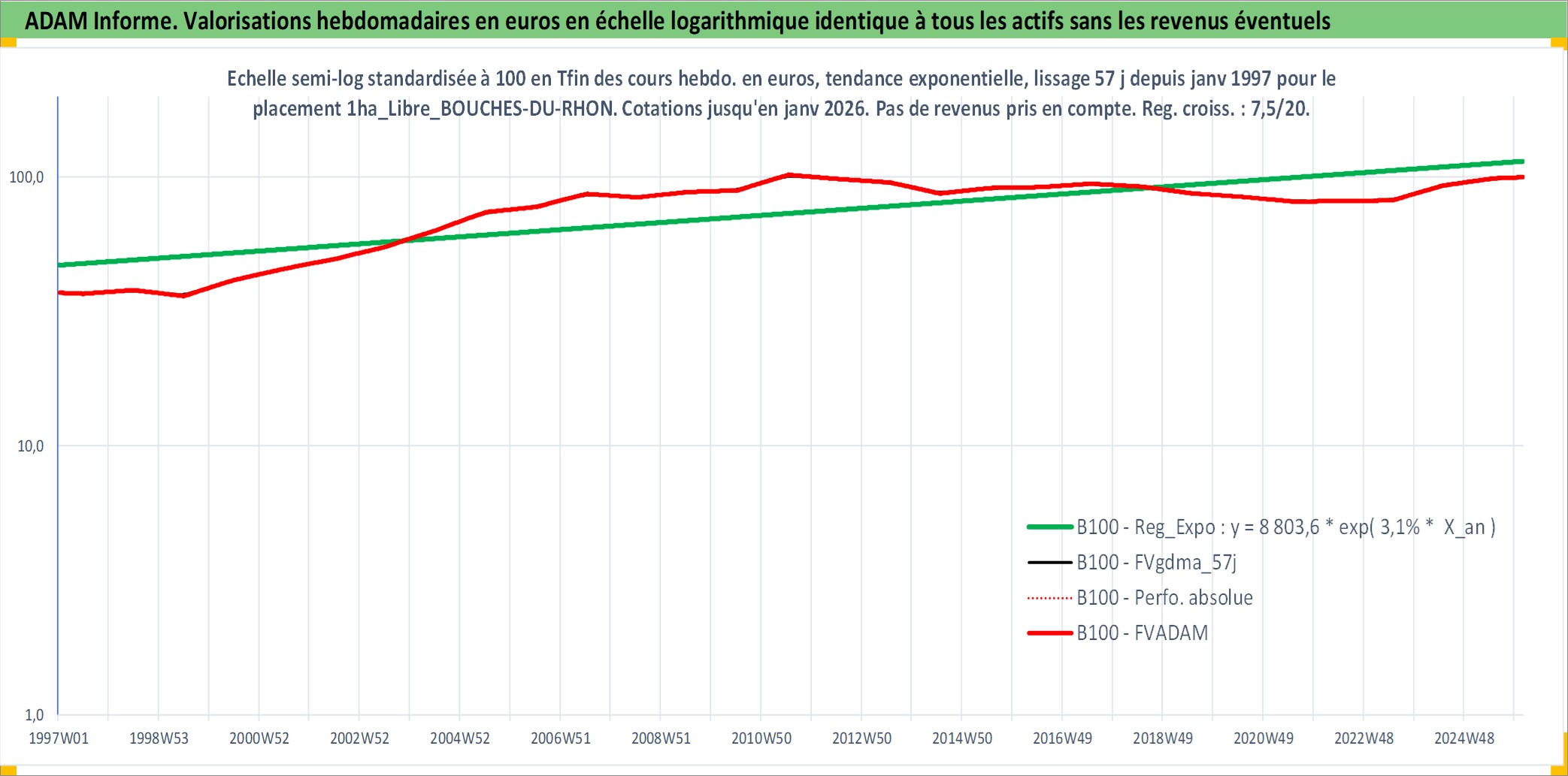 Site dédié aux investisseursPage dédiée sur site financeAnalyse des valorisations hebdomadaires de l'actif 1ha_Libre_BOUCHES-DU-RHONE. Cet actif est cote en EUR. Les valorisations couvrent les semaines 1997W01 a 2026W05. Les fermages de ce bien foncier sont pris egaux a 2,5% annuels de la valeur venale du bien.