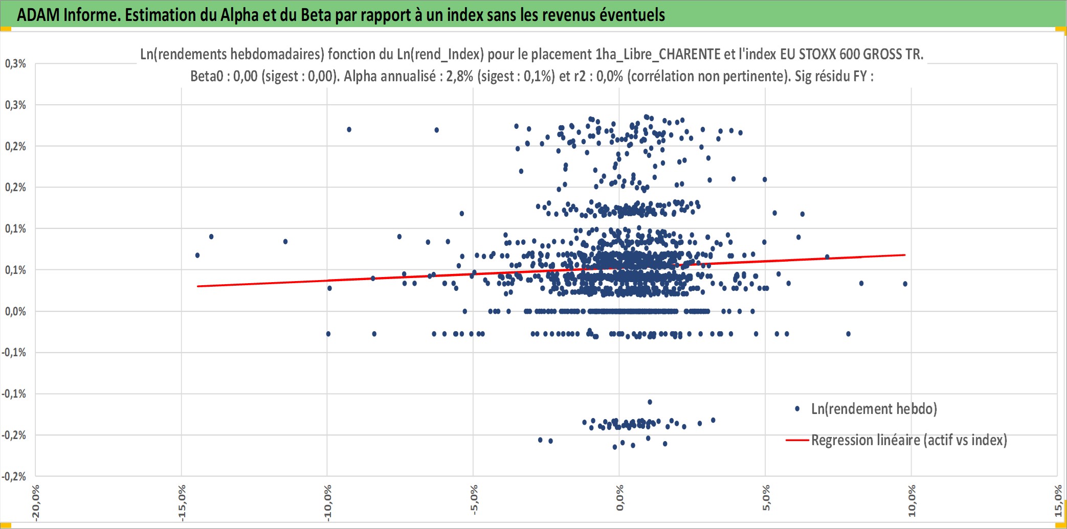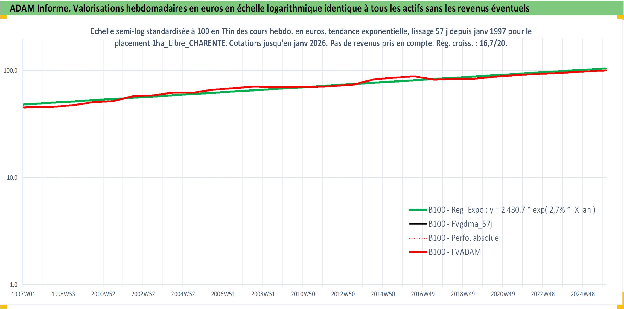 Site dédié aux investisseursPage dédiée sur site financeAnalyse des valorisations hebdomadaires de l'actif 1ha_Libre_CHARENTE. Cet actif est cote en EUR. Les valorisations couvrent les semaines 1997W01 a 2026W05. Les fermages de ce bien foncier sont pris egaux a 2,5% annuels de la valeur venale du bien.