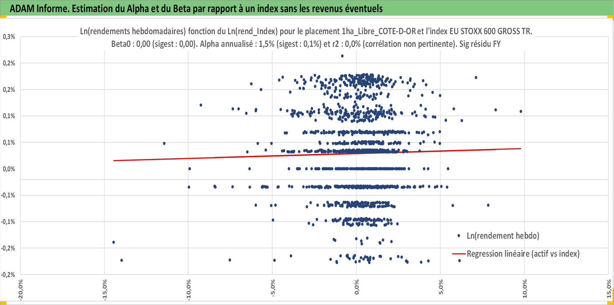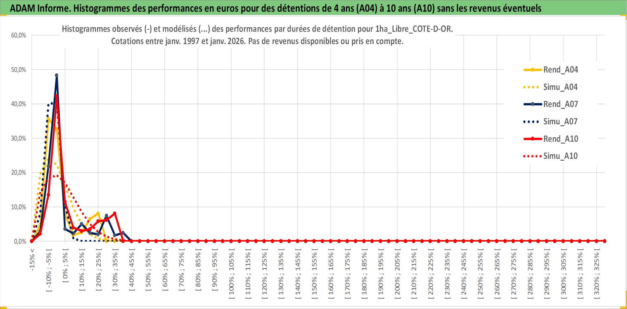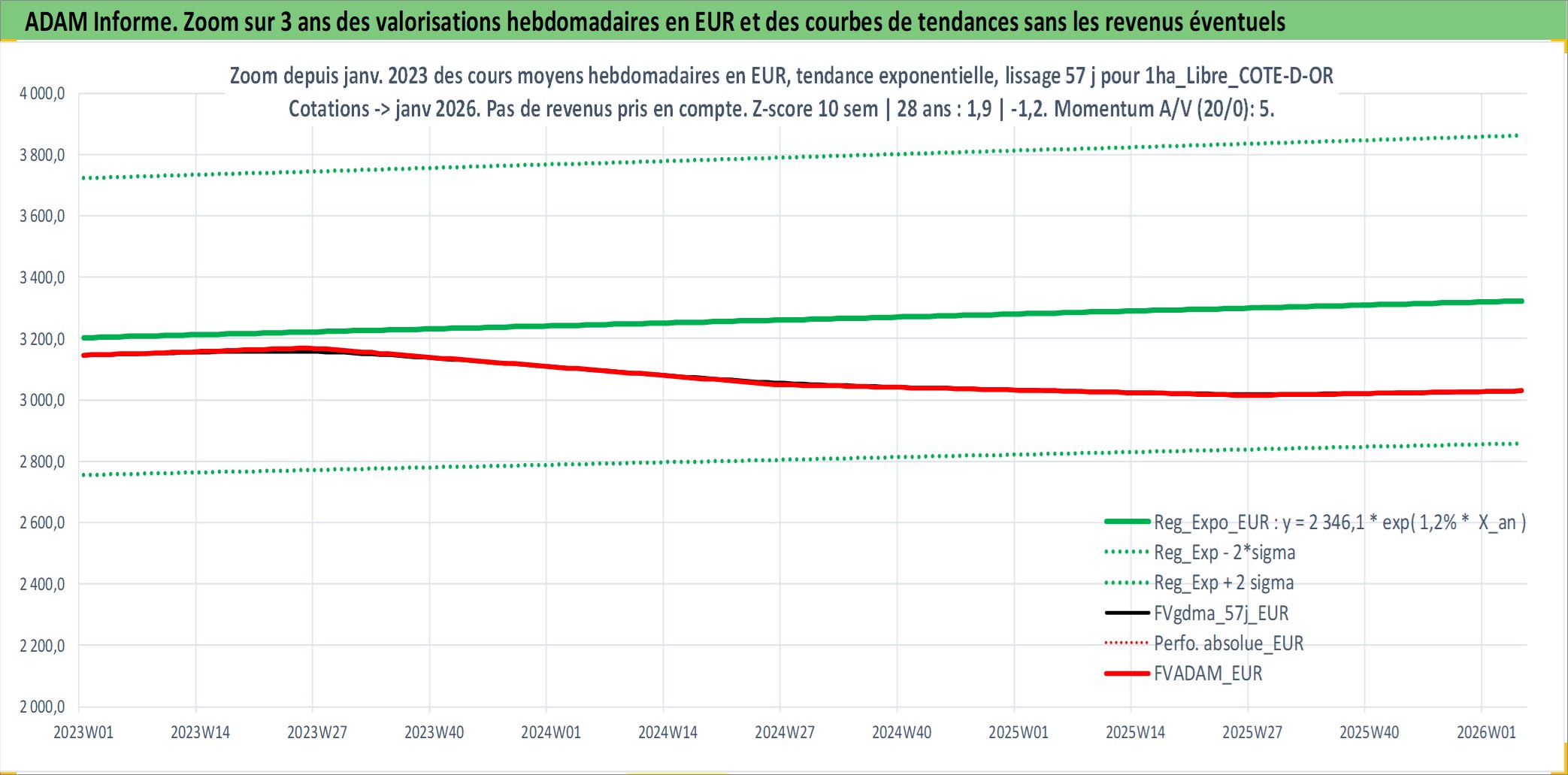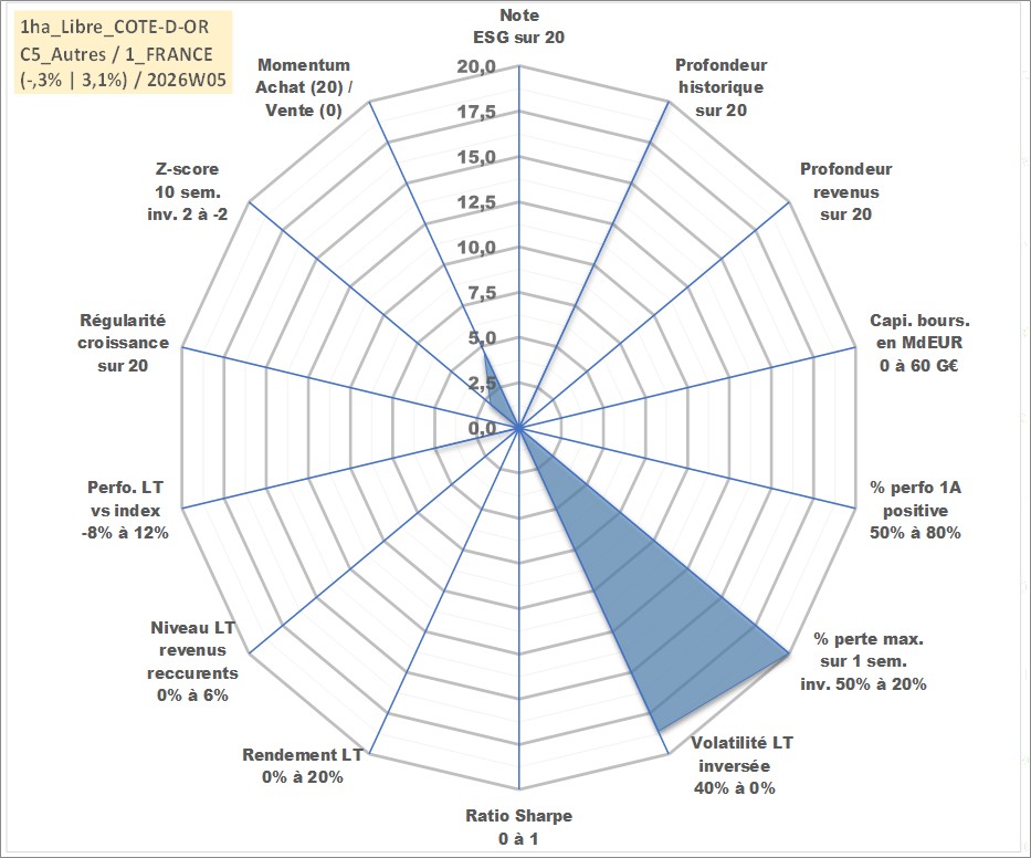 Site dédié aux investisseursPage dédiée sur site financeAnalyse des valorisations hebdomadaires de l'actif 1ha_Libre_COTE-D-OR. Cet actif est cote en EUR. Les valorisations couvrent les semaines 1997W01 a 2026W05. Les fermages de ce bien foncier sont pris egaux a 2,5% annuels de la valeur venale du bien.