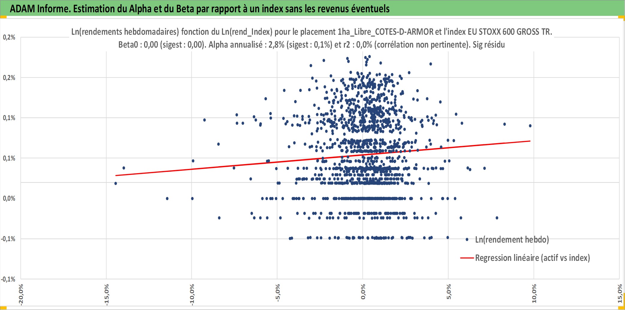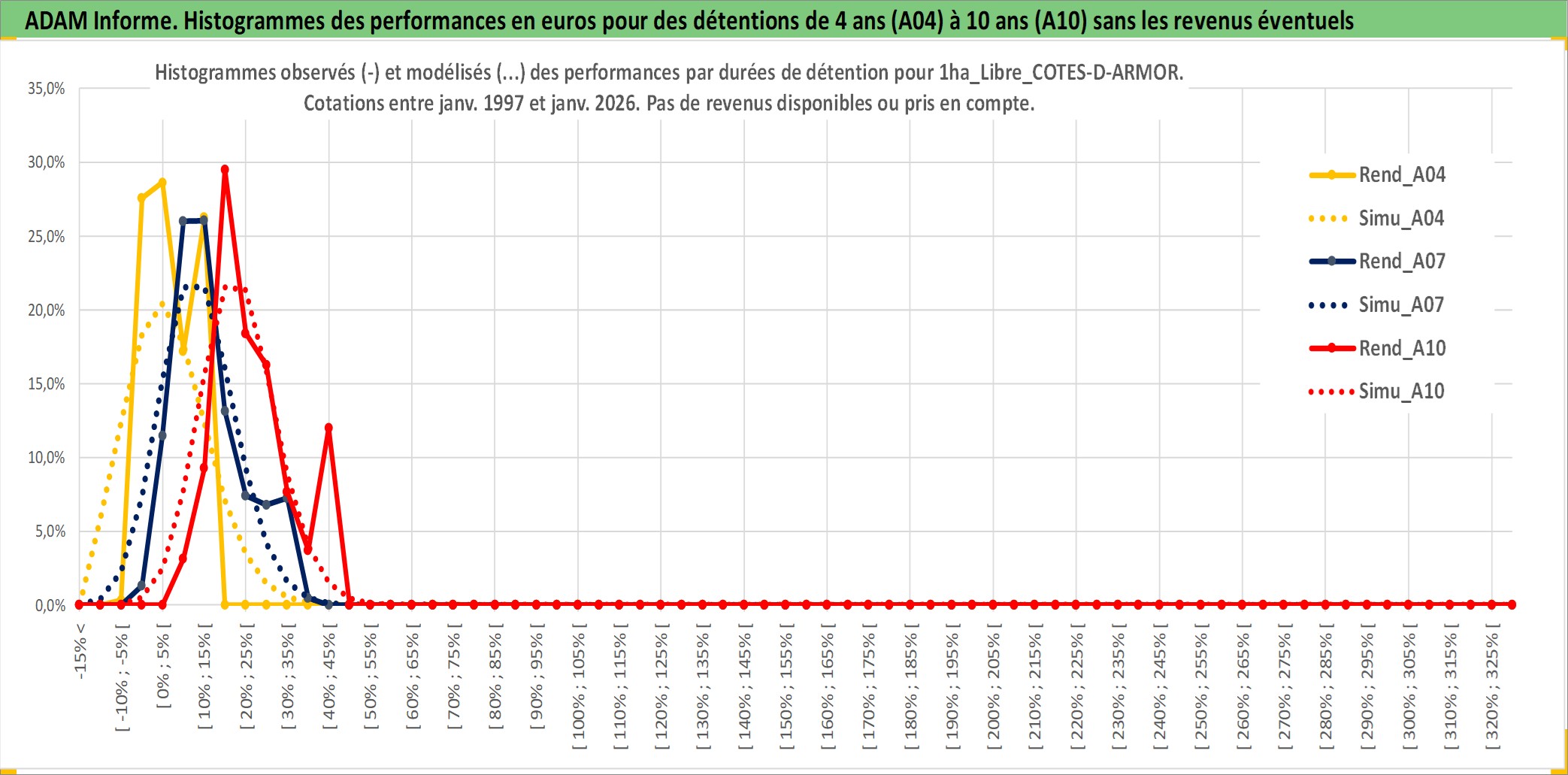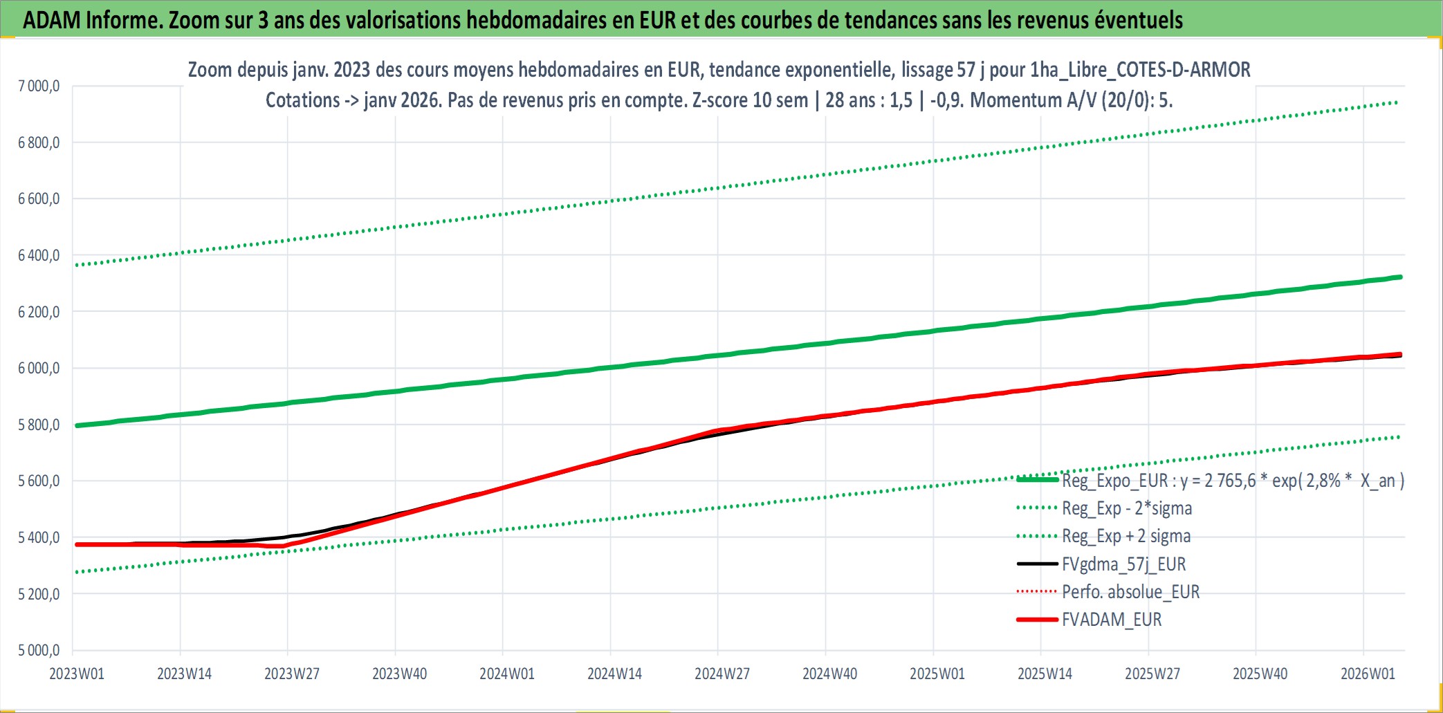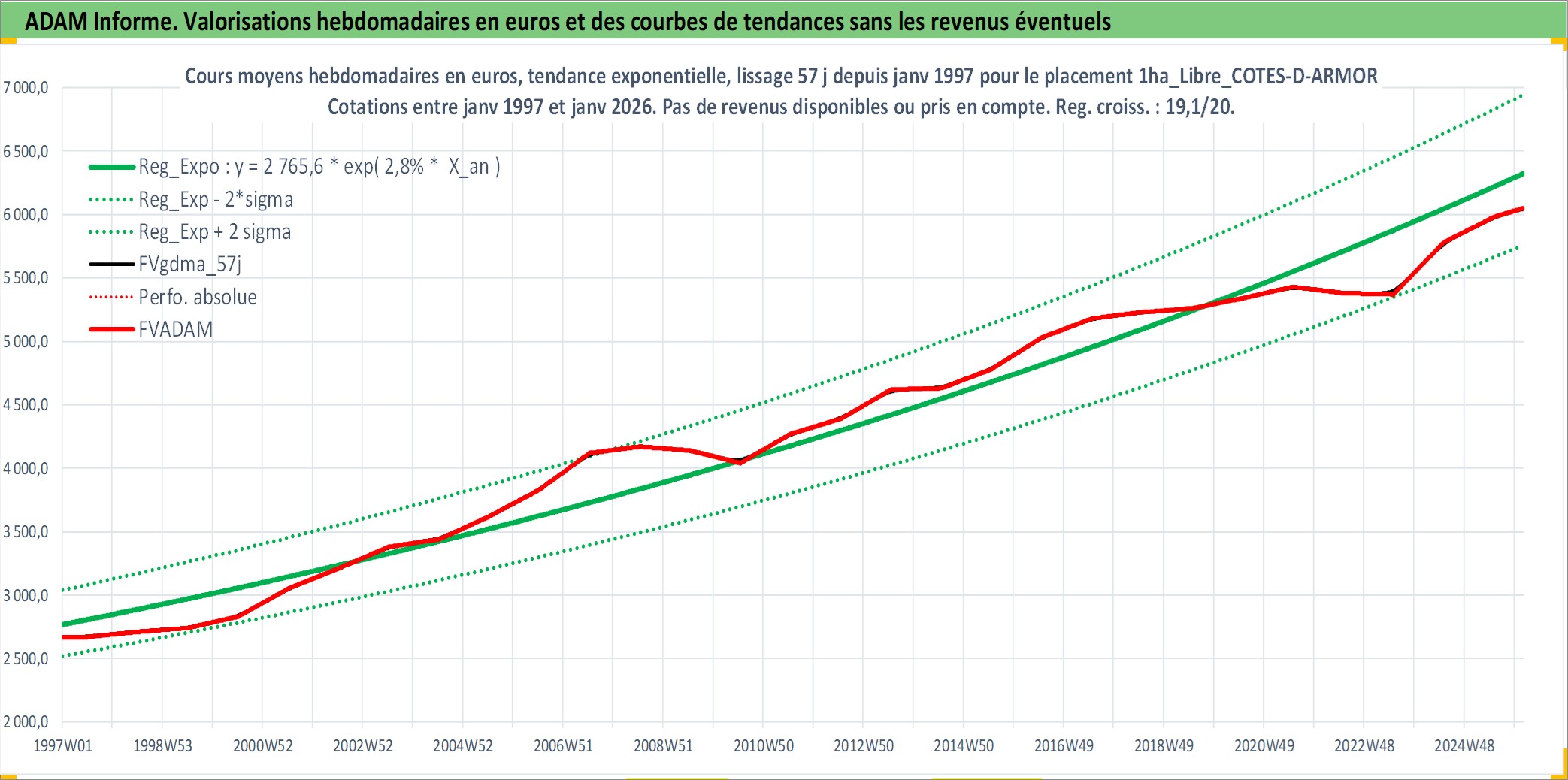 Site dédié aux investisseursPage dédiée sur site financeAnalyse des valorisations hebdomadaires de l'actif 1ha_Libre_COTES-D-ARMOR. Cet actif est cote en EUR. Les valorisations couvrent les semaines 1997W01 a 2026W05. Les fermages de ce bien foncier sont pris egaux a 2,5% annuels de la valeur venale du bien.