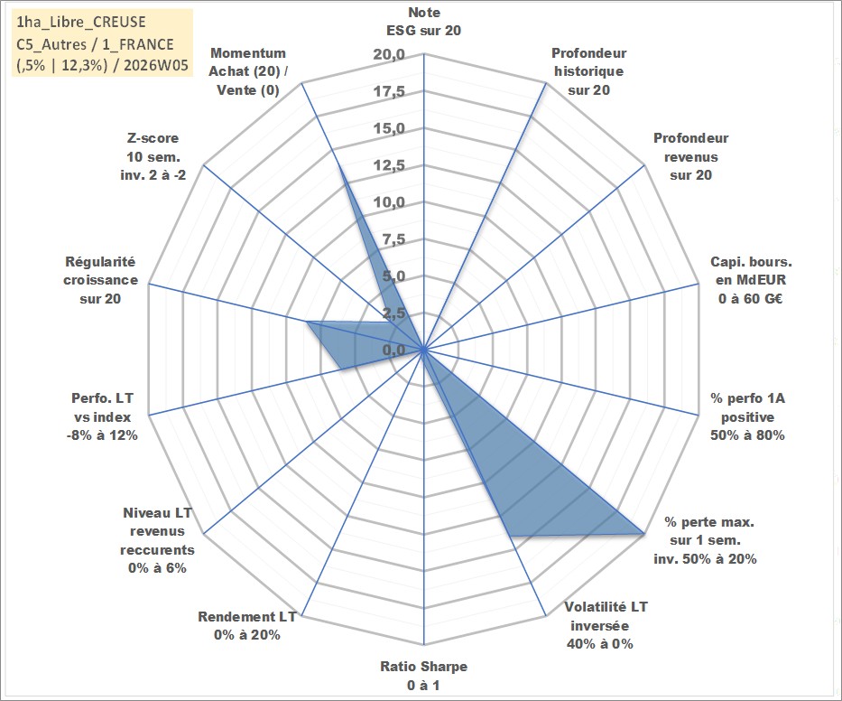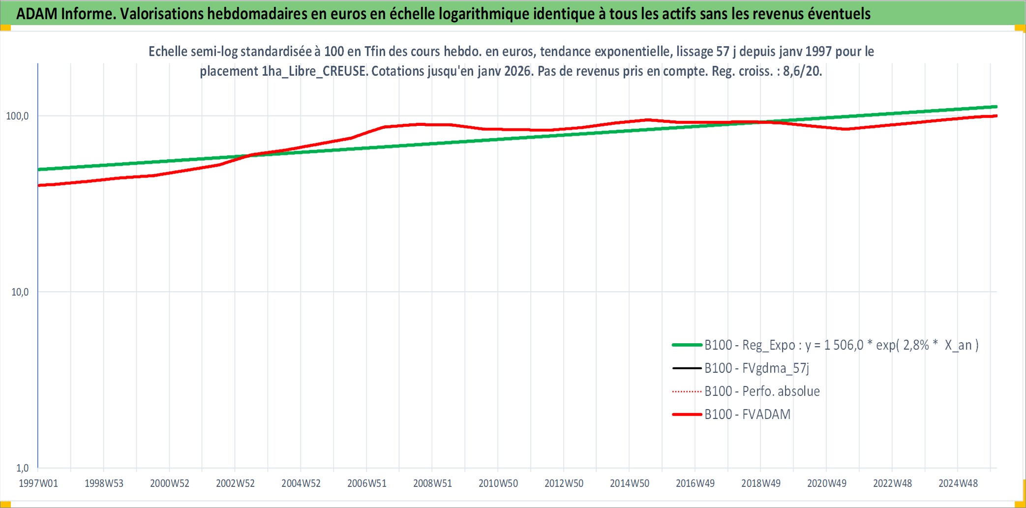 Site dédié aux investisseursPage dédiée sur site financeAnalyse des valorisations hebdomadaires de l'actif 1ha_Libre_CREUSE. Cet actif est cote en EUR. Les valorisations couvrent les semaines 1997W01 a 2026W05. Les fermages de ce bien foncier sont pris egaux a 2,5% annuels de la valeur venale du bien.