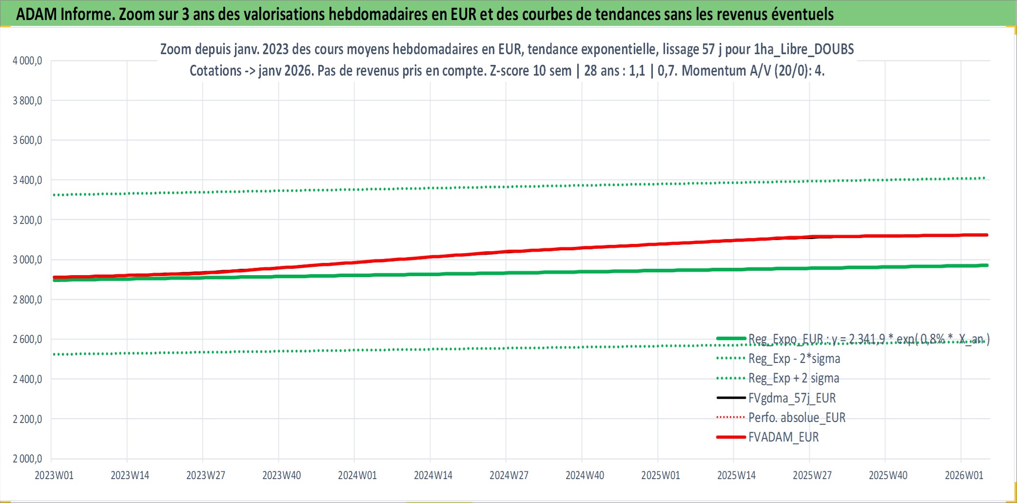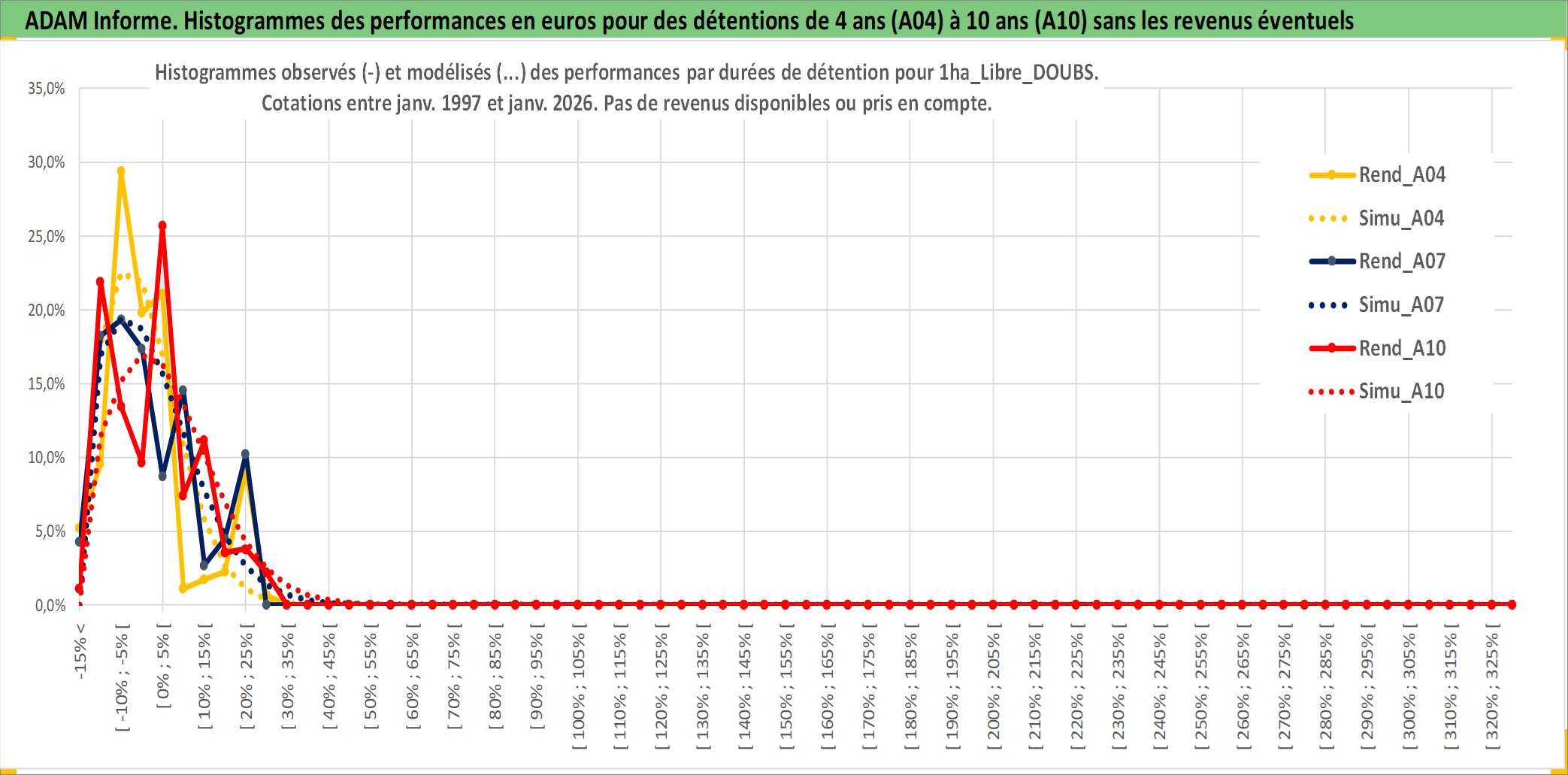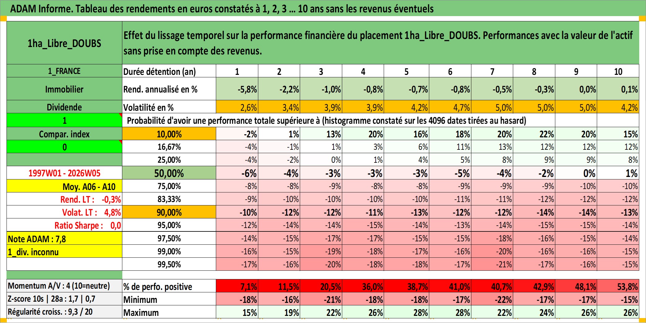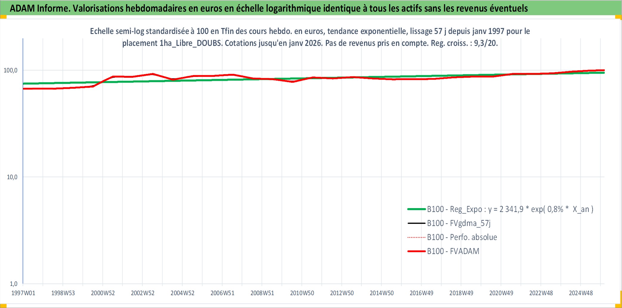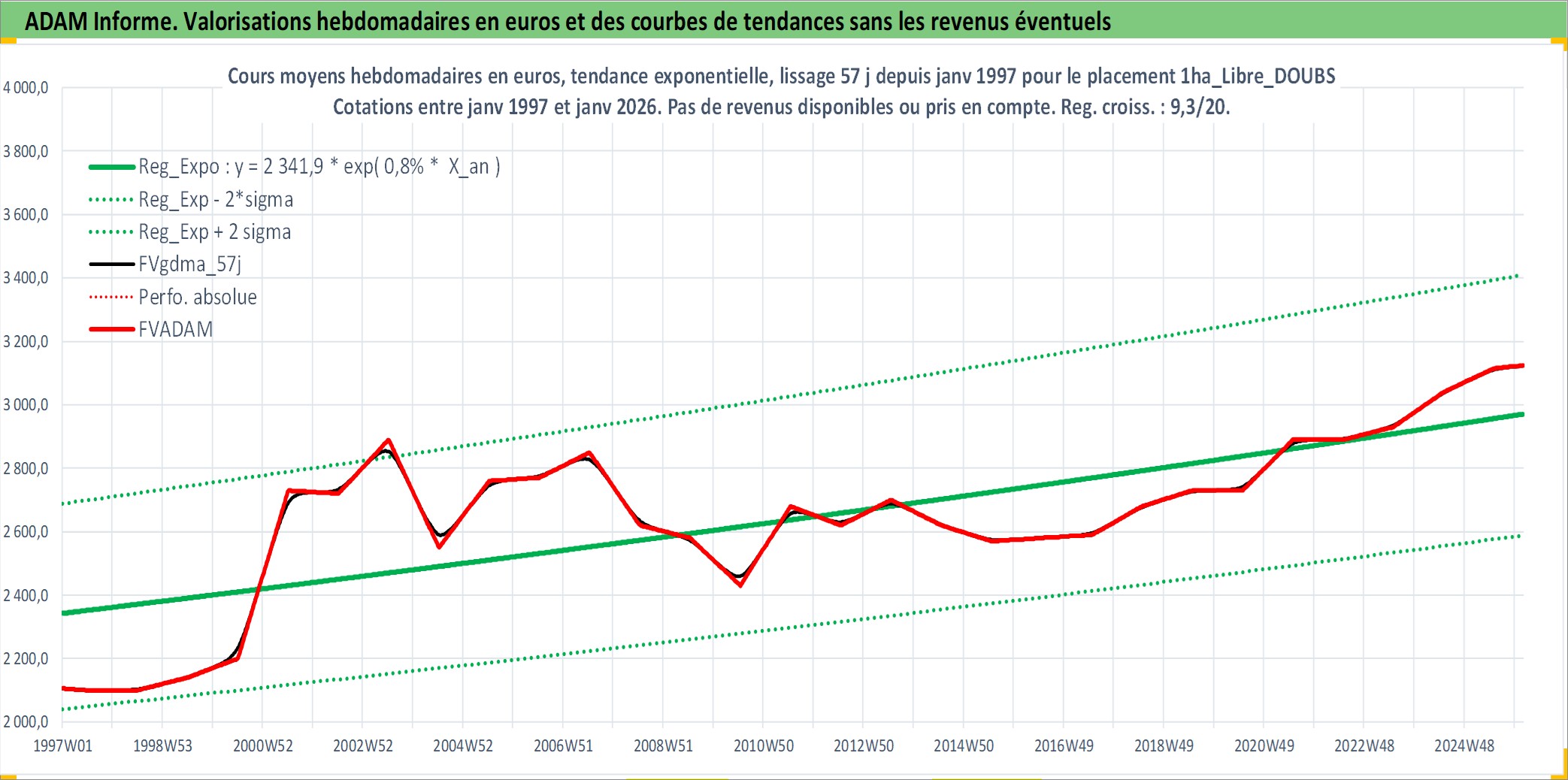 Site dédié aux investisseursPage dédiée sur site financeAnalyse des valorisations hebdomadaires de l'actif 1ha_Libre_DOUBS. Cet actif est cote en EUR. Les valorisations couvrent les semaines 1997W01 a 2026W05. Les fermages de ce bien foncier sont pris egaux a 2,5% annuels de la valeur venale du bien.