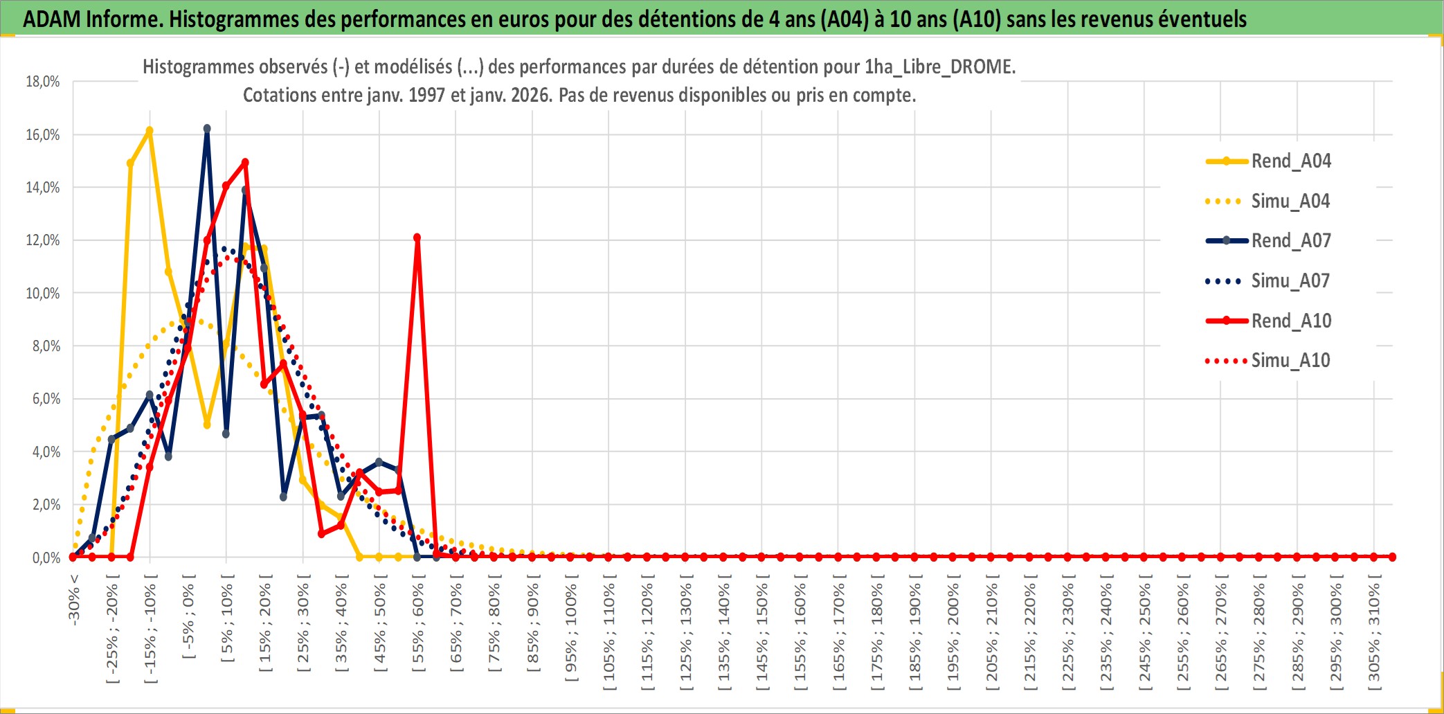 Site dédié aux investisseursPage dédiée sur site financeAnalyse des valorisations hebdomadaires de l'actif 1ha_Libre_DROME. Cet actif est cote en EUR. Les valorisations couvrent les semaines 1997W01 a 2026W05. Les fermages de ce bien foncier sont pris egaux a 2,5% annuels de la valeur venale du bien.
