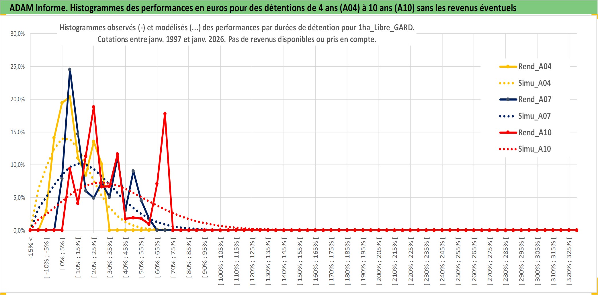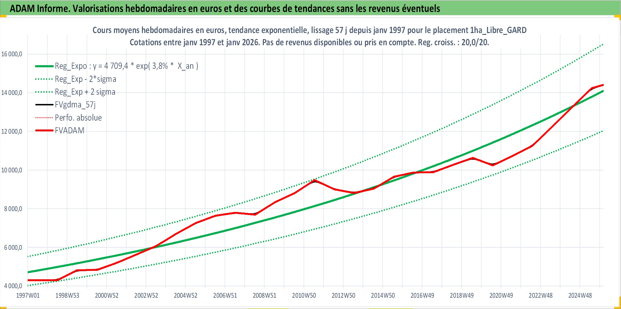 Site dédié aux investisseursPage dédiée sur site financeAnalyse des valorisations hebdomadaires de l'actif 1ha_Libre_GARD. Cet actif est cote en EUR. Les valorisations couvrent les semaines 1997W01 a 2026W05. Les fermages de ce bien foncier sont pris egaux a 2,5% annuels de la valeur venale du bien.