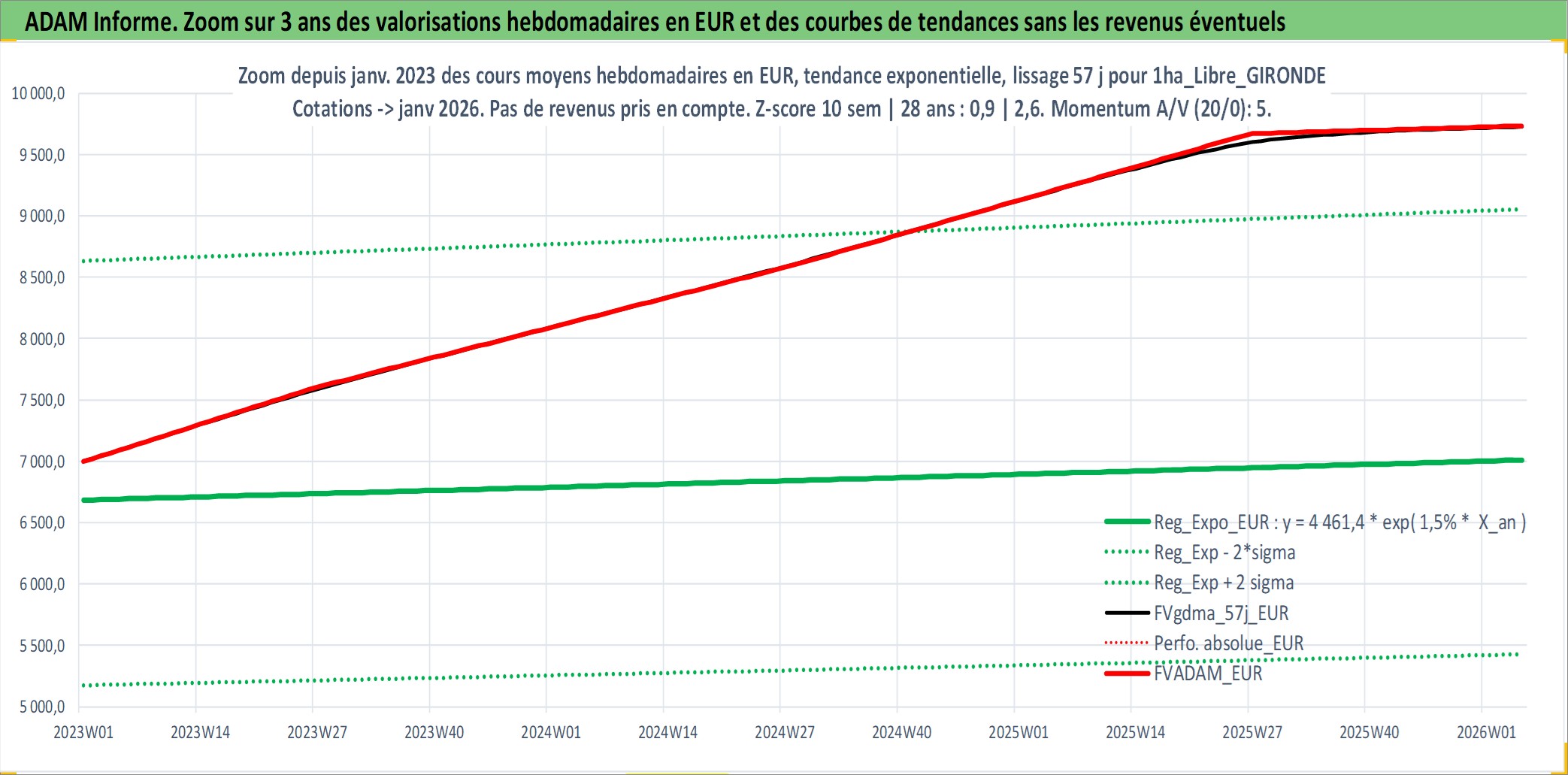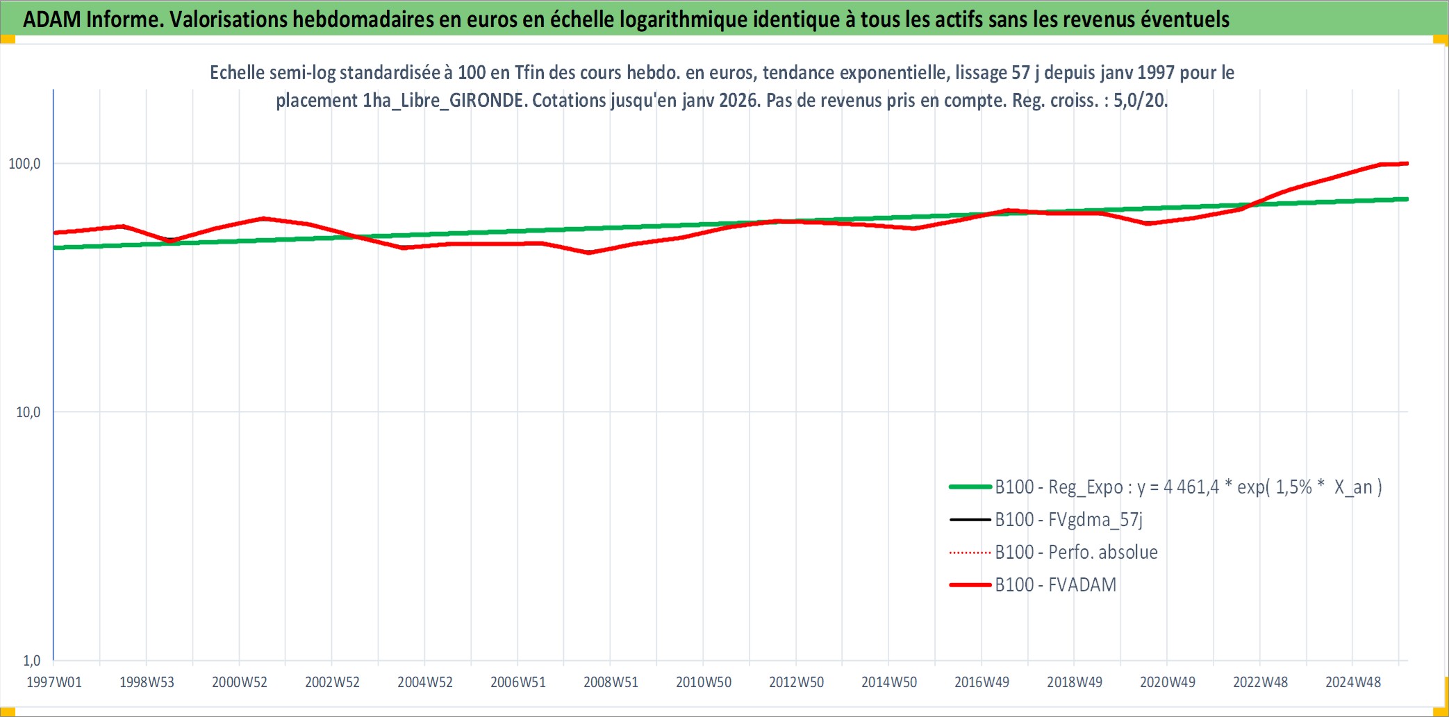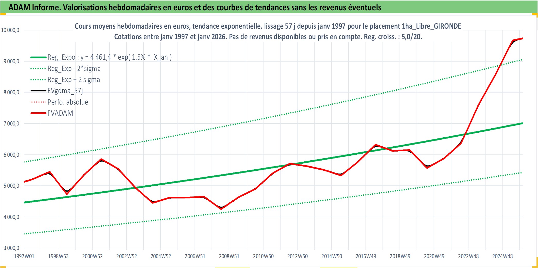 Site dédié aux investisseursPage dédiée sur site financeAnalyse des valorisations hebdomadaires de l'actif 1ha_Libre_GIRONDE. Cet actif est cote en EUR. Les valorisations couvrent les semaines 1997W01 a 2026W05. Les fermages de ce bien foncier sont pris egaux a 2,5% annuels de la valeur venale du bien.