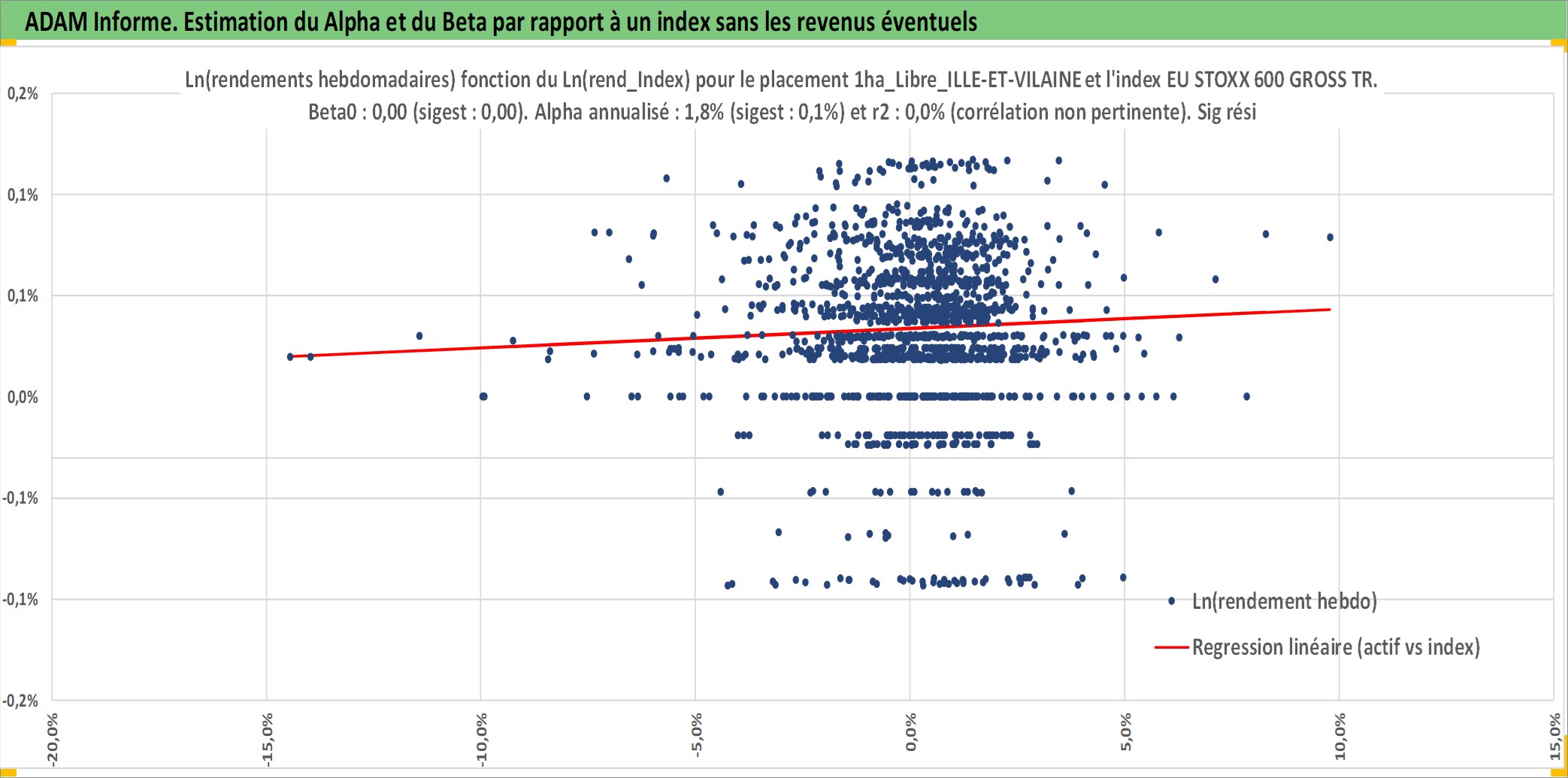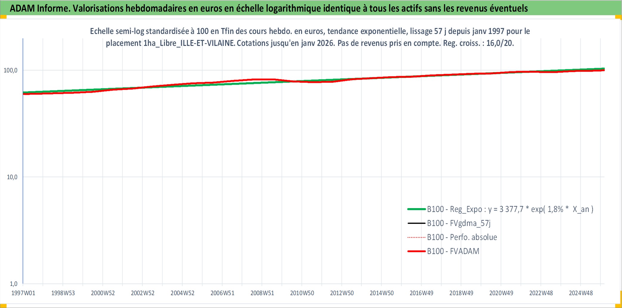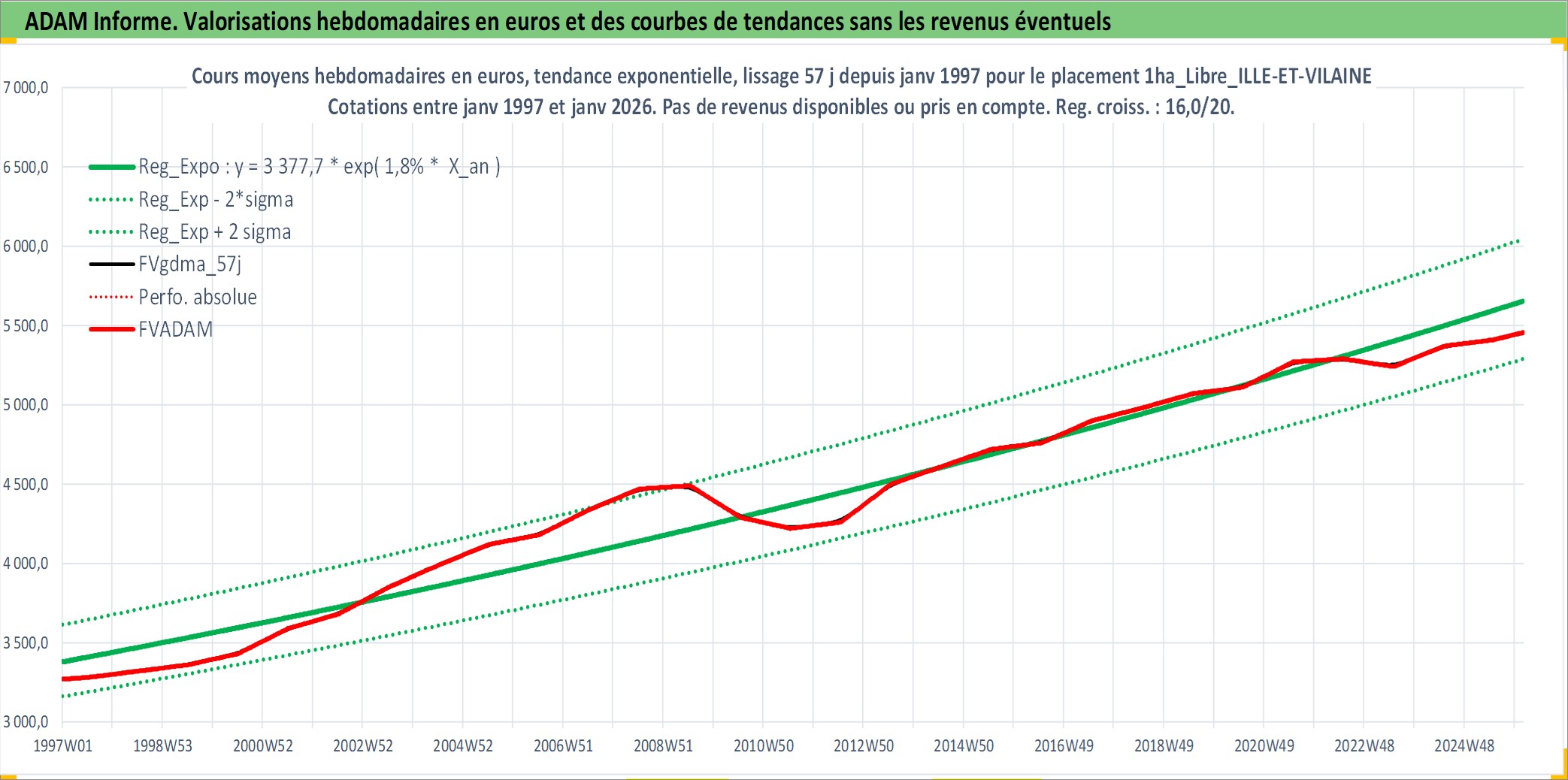 Site dédié aux investisseursPage dédiée sur site financeAnalyse des valorisations hebdomadaires de l'actif 1ha_Libre_ILLE-ET-VILAINE. Cet actif est cote en EUR. Les valorisations couvrent les semaines 1997W01 a 2026W05. Les fermages de ce bien foncier sont pris egaux a 2,5% annuels de la valeur venale du bien.