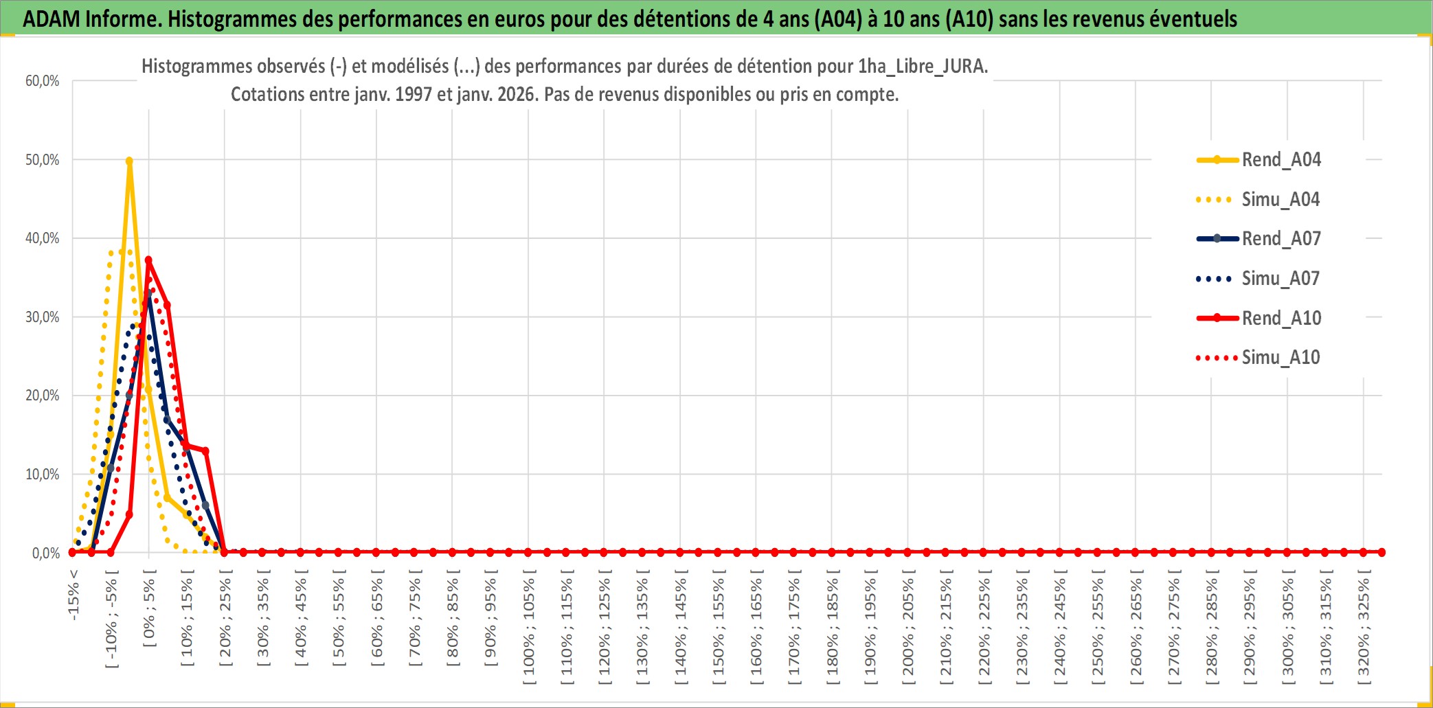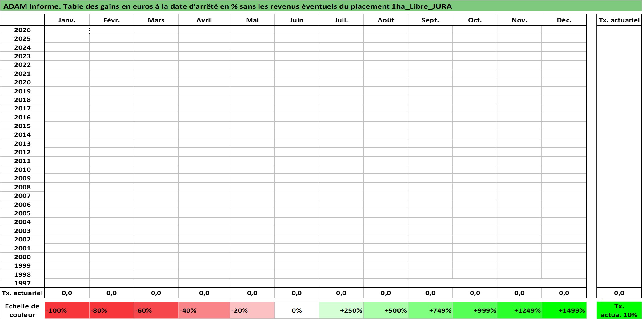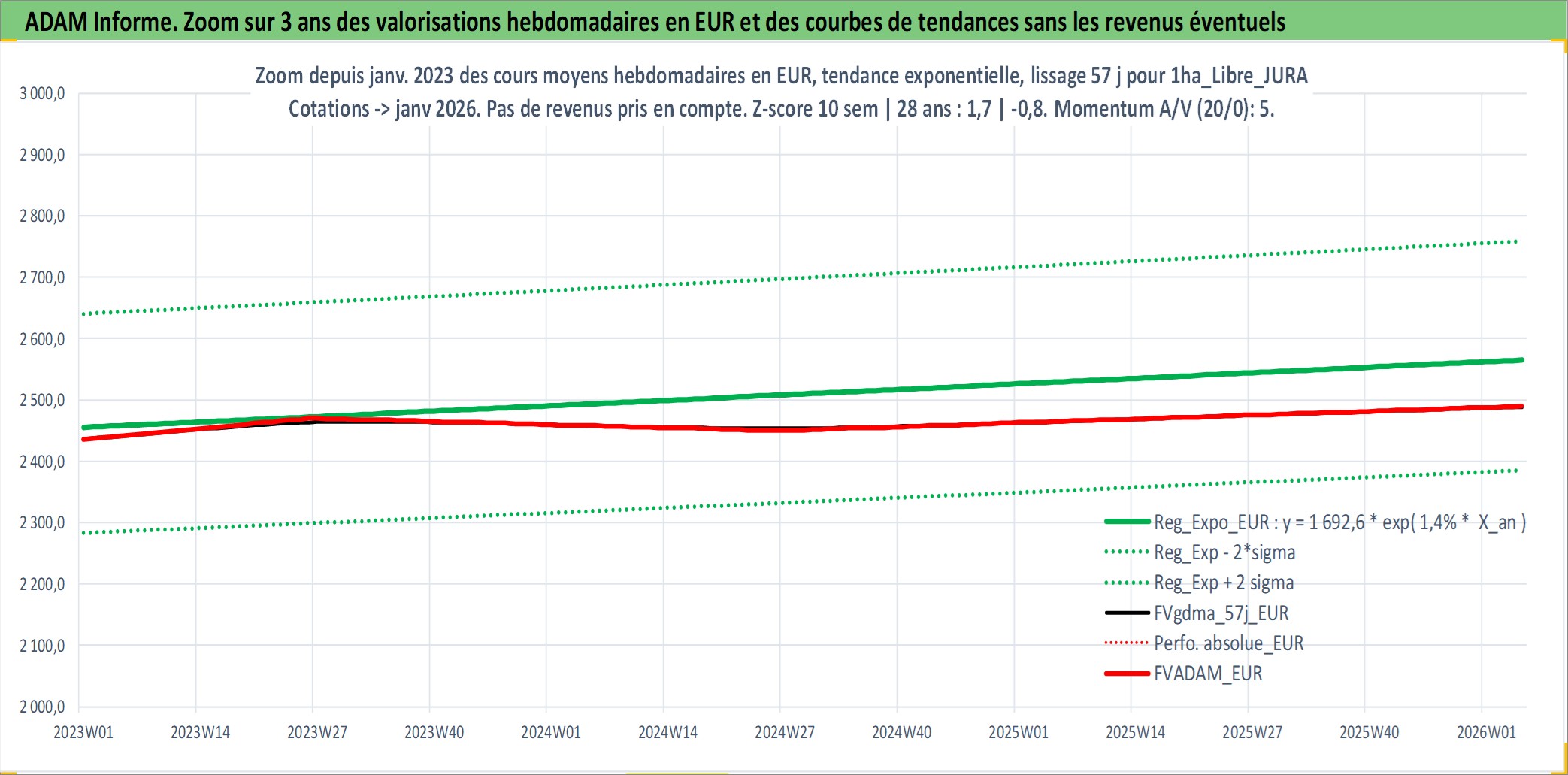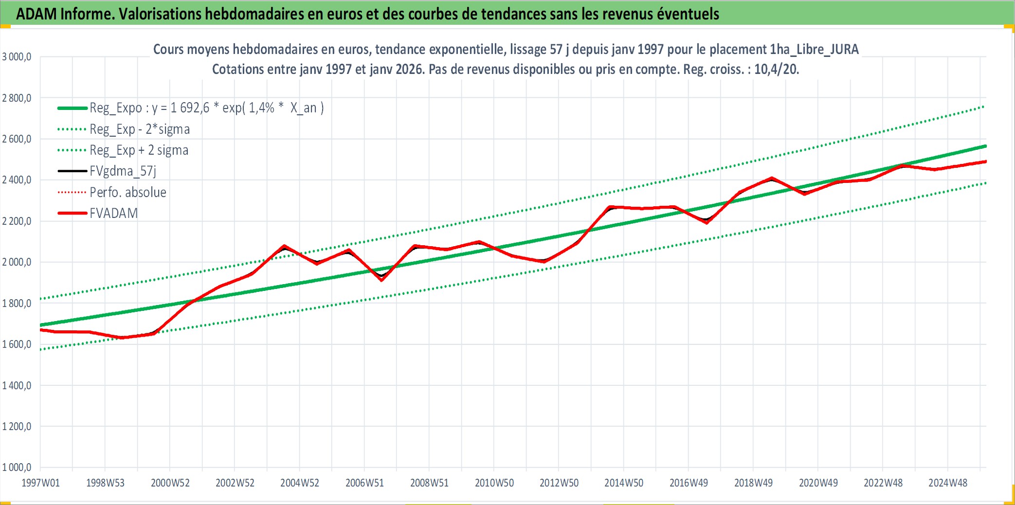Site dédié aux investisseursPage dédiée sur site financeAnalyse des valorisations hebdomadaires de l'actif 1ha_Libre_JURA. Cet actif est cote en EUR. Les valorisations couvrent les semaines 1997W01 a 2026W05. Les fermages de ce bien foncier sont pris egaux a 2,5% annuels de la valeur venale du bien.
