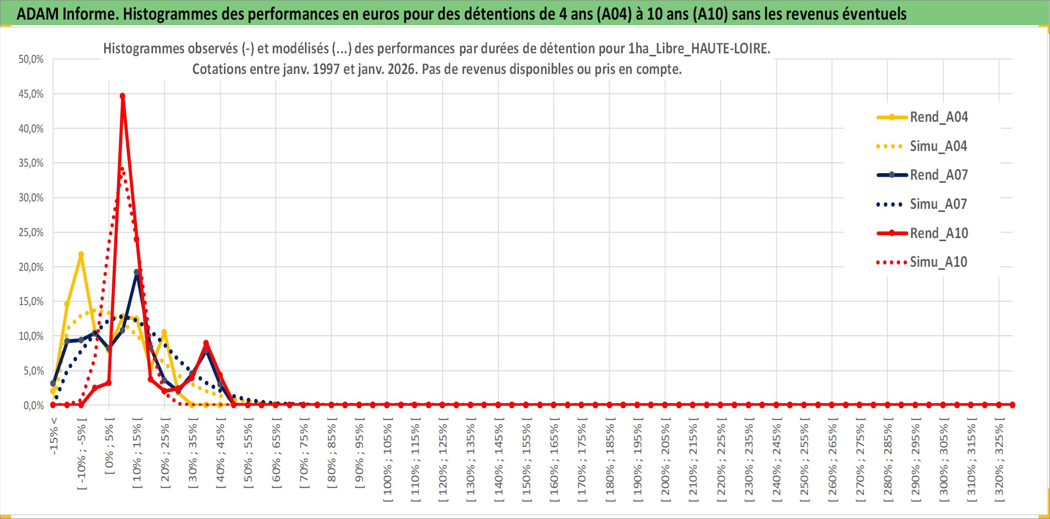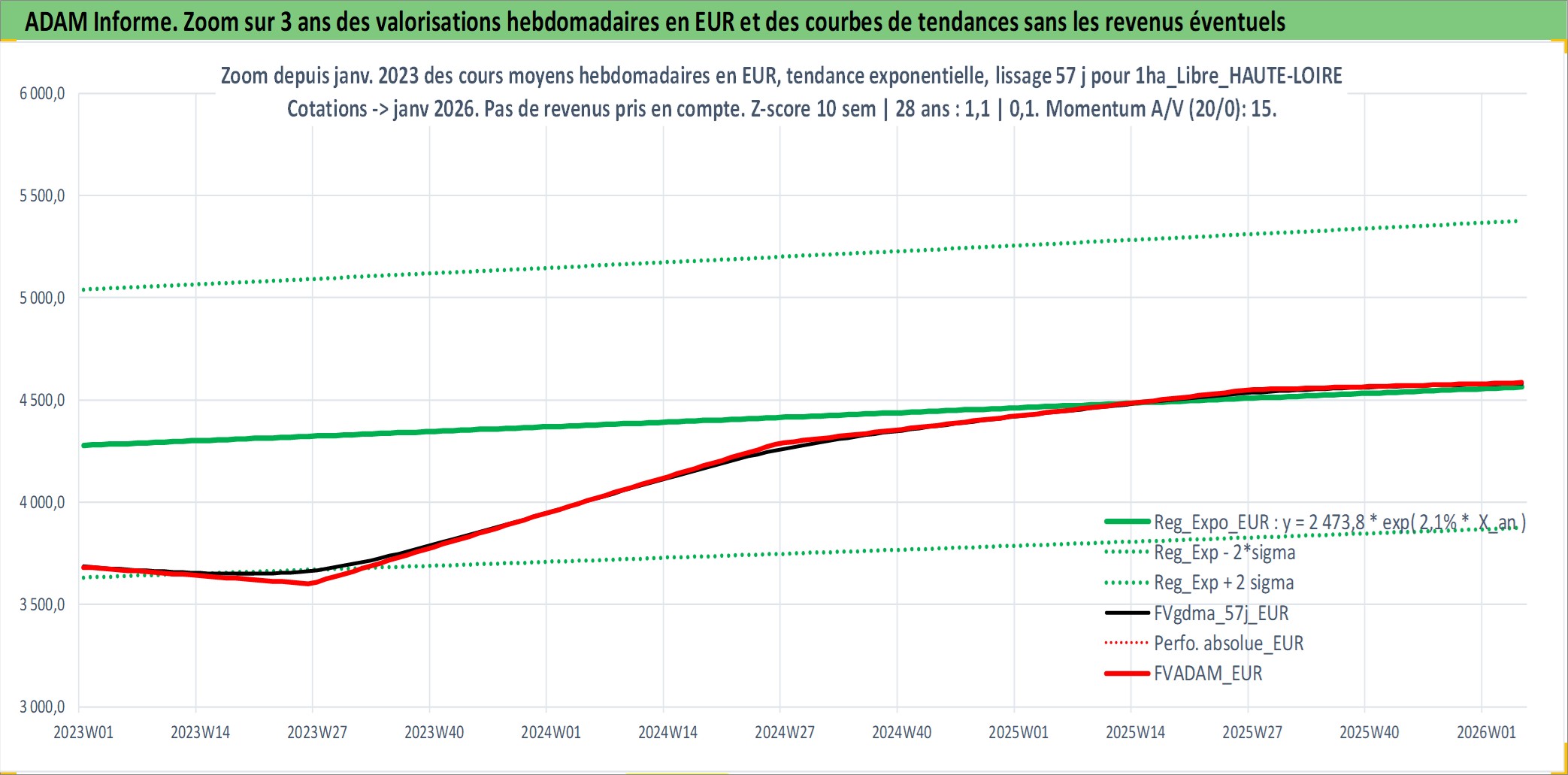 Site dédié aux investisseursPage dédiée sur site financeAnalyse des valorisations hebdomadaires de l'actif 1ha_Libre_HAUTE-LOIRE. Cet actif est cote en EUR. Les valorisations couvrent les semaines 1997W01 a 2026W05. Les fermages de ce bien foncier sont pris egaux a 2,5% annuels de la valeur venale du bien.