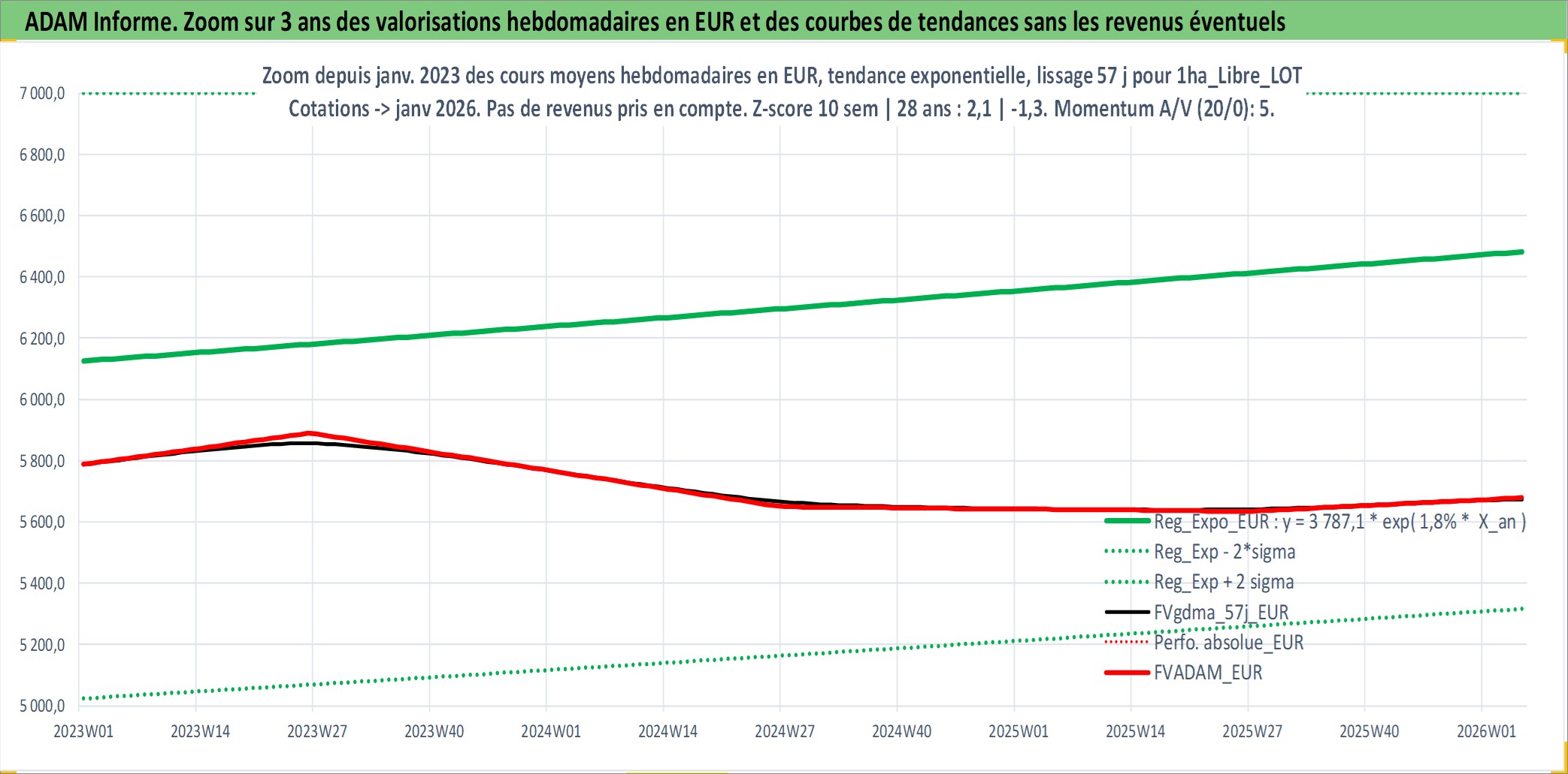 Site dédié aux investisseursPage dédiée sur site financeAnalyse des valorisations hebdomadaires de l'actif 1ha_Libre_LOT. Cet actif est cote en EUR. Les valorisations couvrent les semaines 1997W01 a 2026W05. Les fermages de ce bien foncier sont pris egaux a 2,5% annuels de la valeur venale du bien.