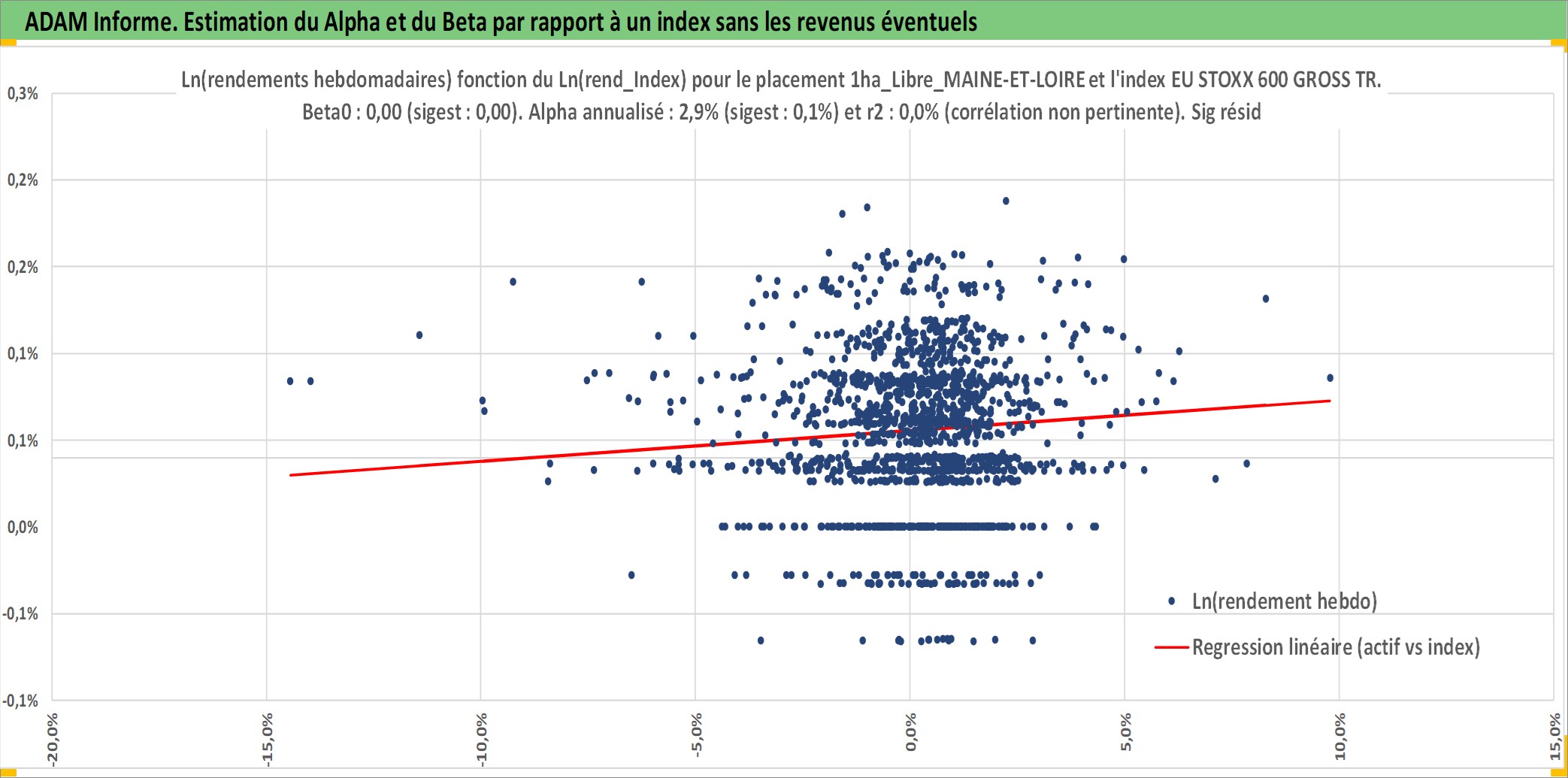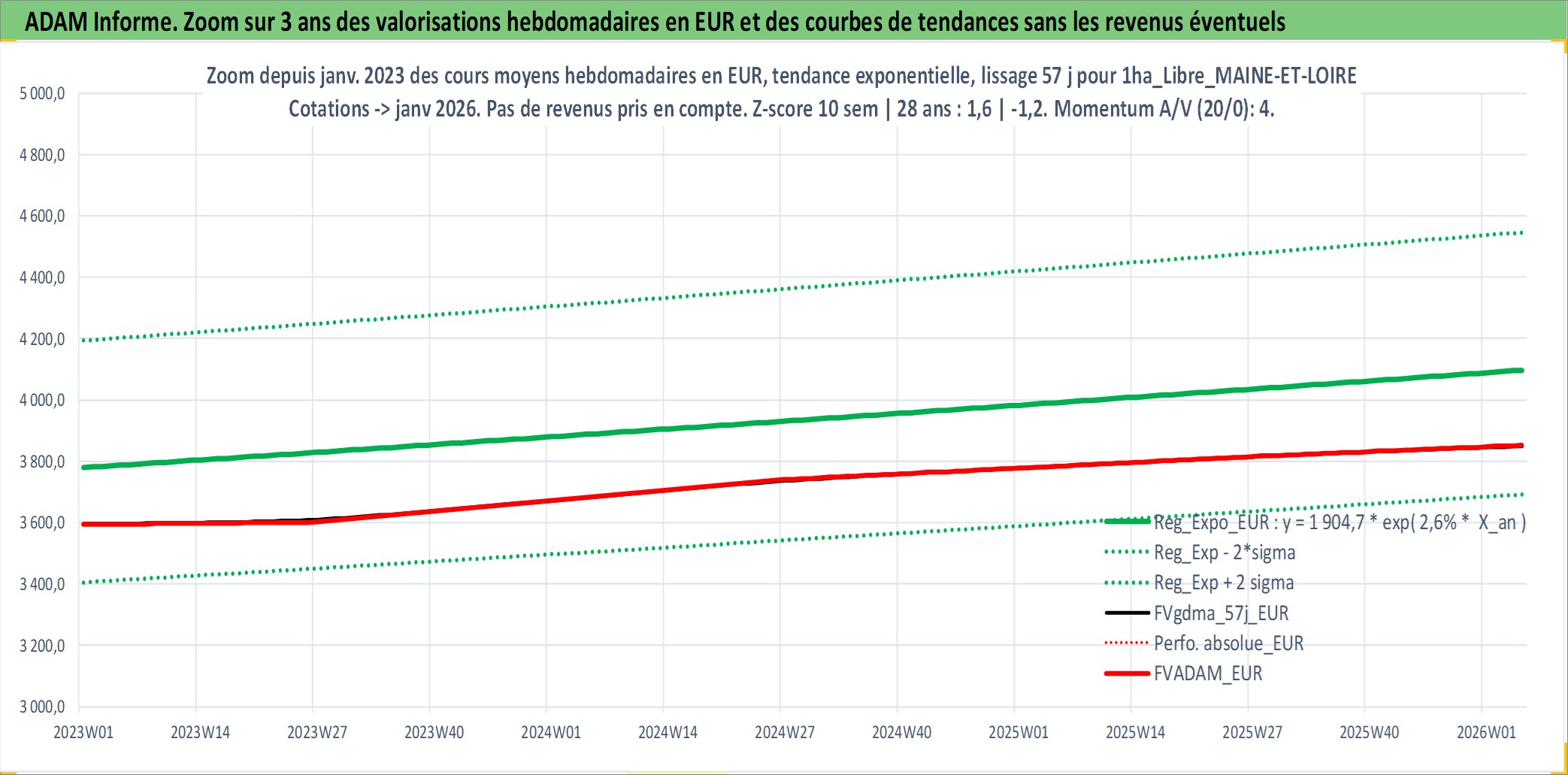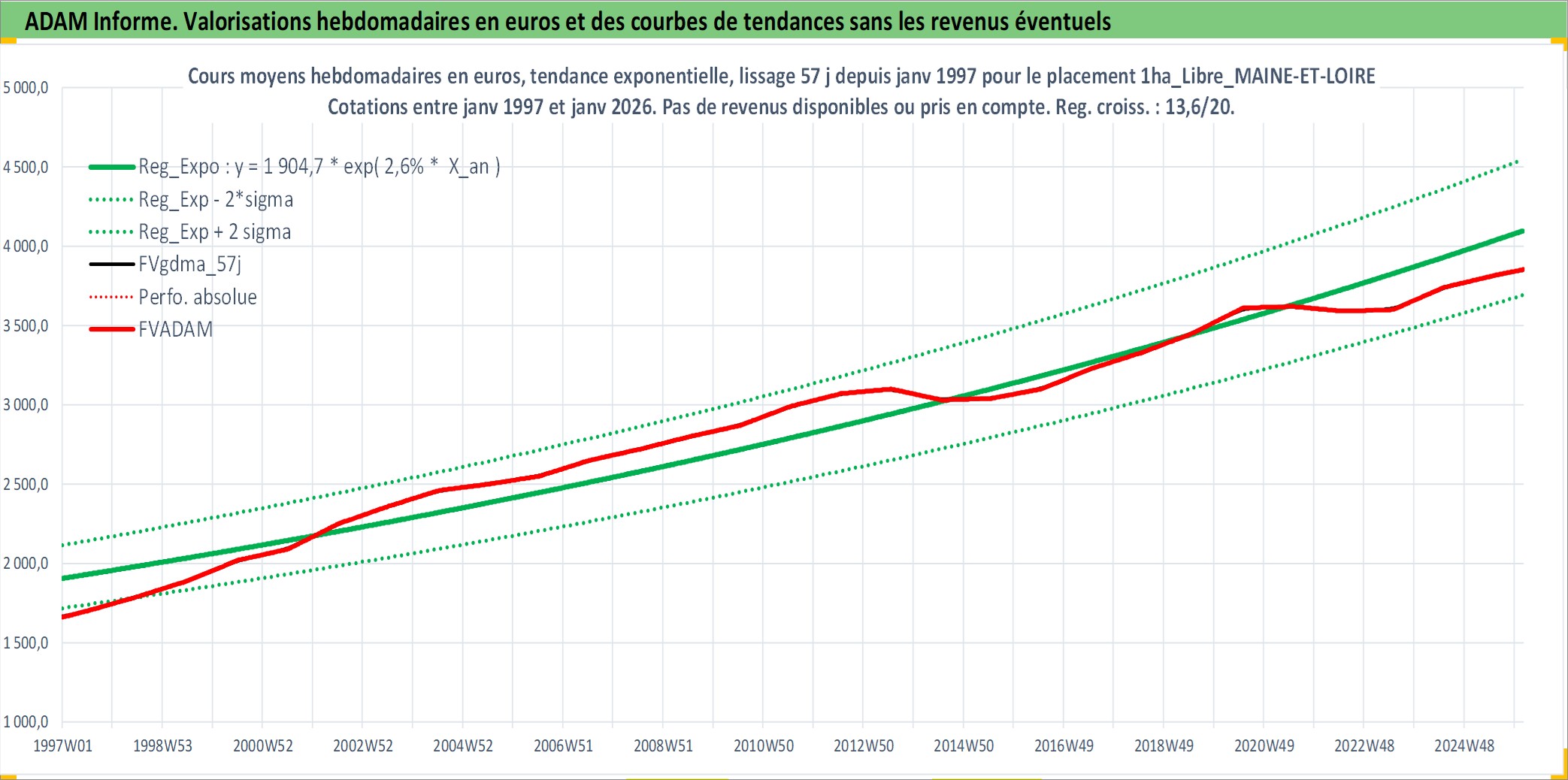 Site dédié aux investisseursPage dédiée sur site financeAnalyse des valorisations hebdomadaires de l'actif 1ha_Libre_MAINE-ET-LOIRE. Cet actif est cote en EUR. Les valorisations couvrent les semaines 1997W01 a 2026W05. Les fermages de ce bien foncier sont pris egaux a 2,5% annuels de la valeur venale du bien.
