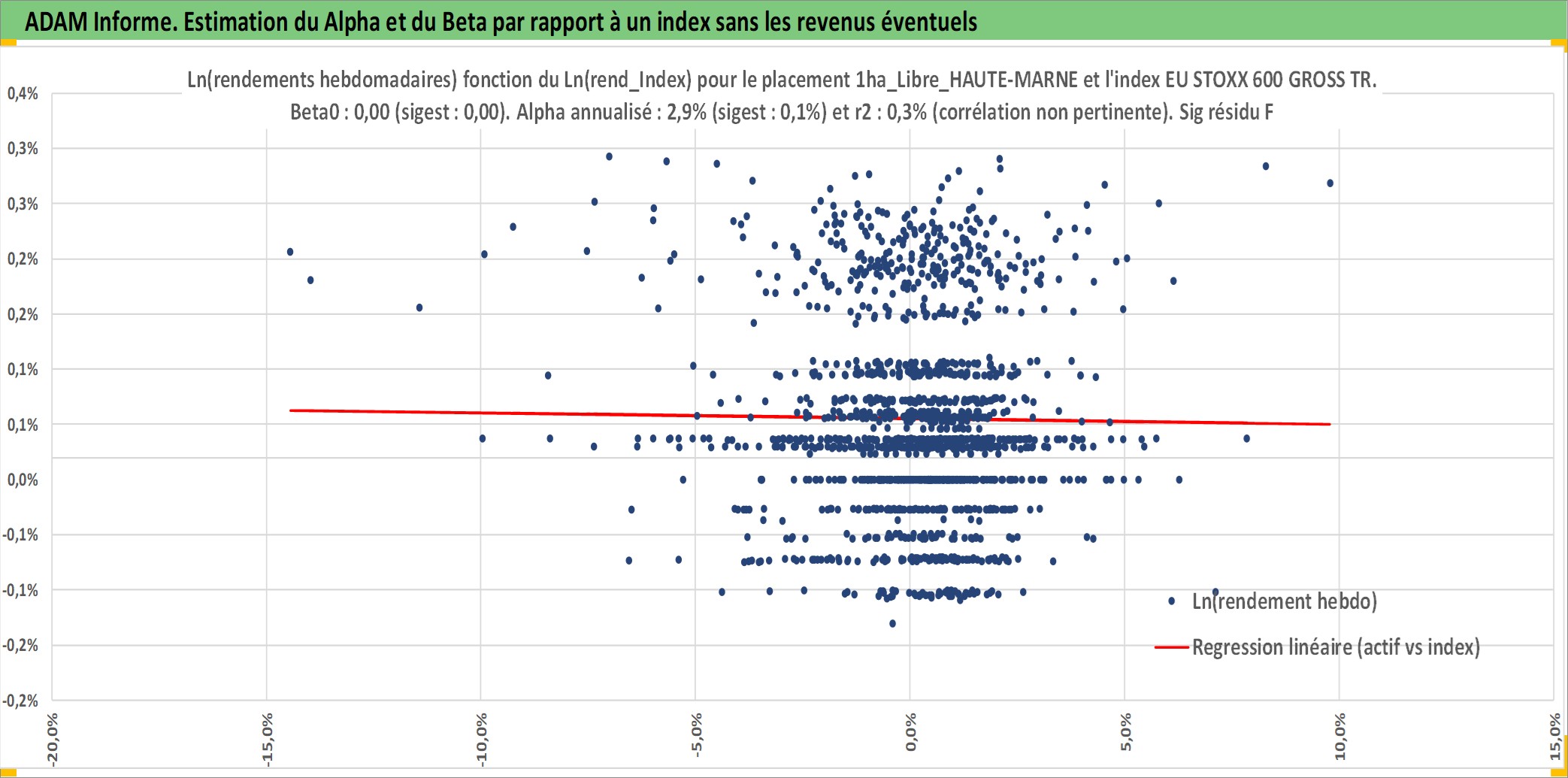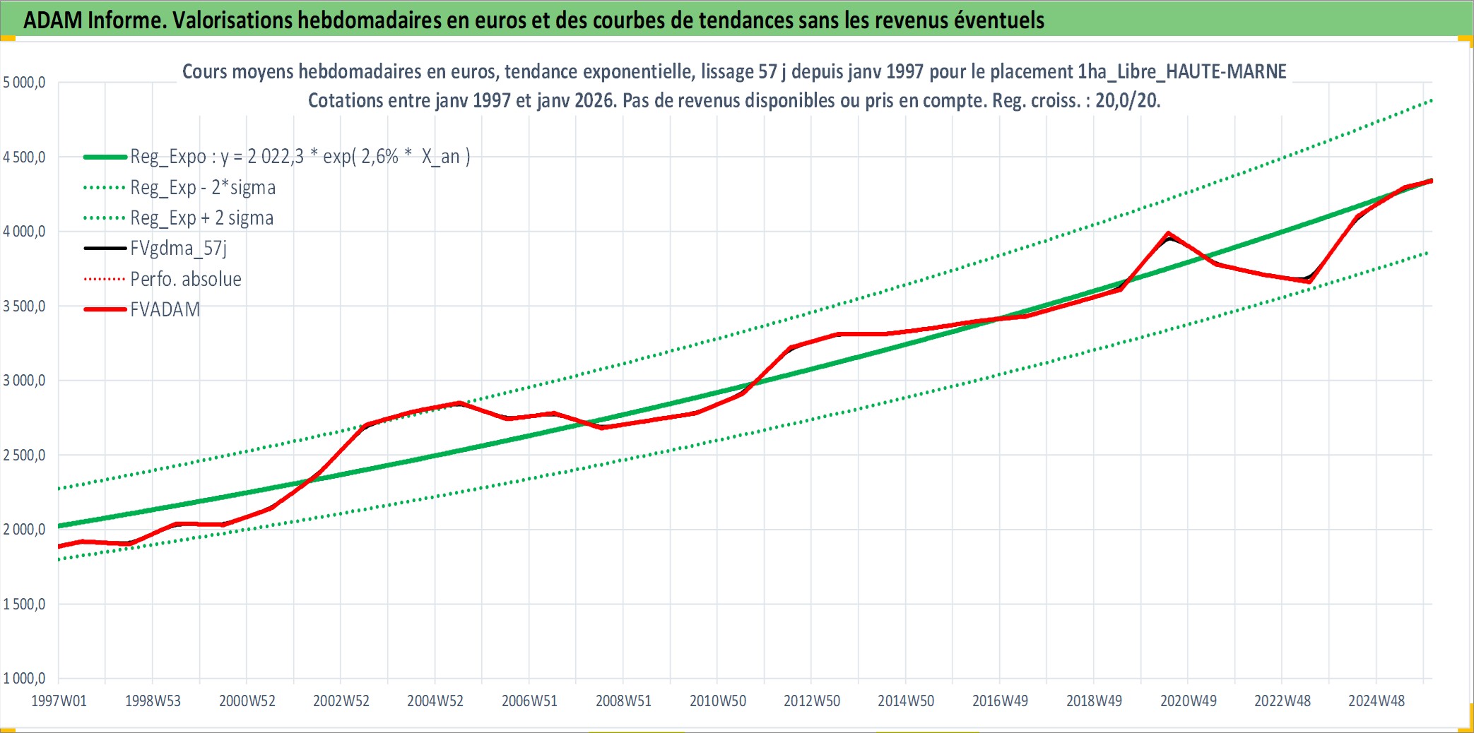 Site dédié aux investisseursPage dédiée sur site financeAnalyse des valorisations hebdomadaires de l'actif 1ha_Libre_HAUTE-MARNE. Cet actif est cote en EUR. Les valorisations couvrent les semaines 1997W01 a 2026W05. Les fermages de ce bien foncier sont pris egaux a 2,5% annuels de la valeur venale du bien.