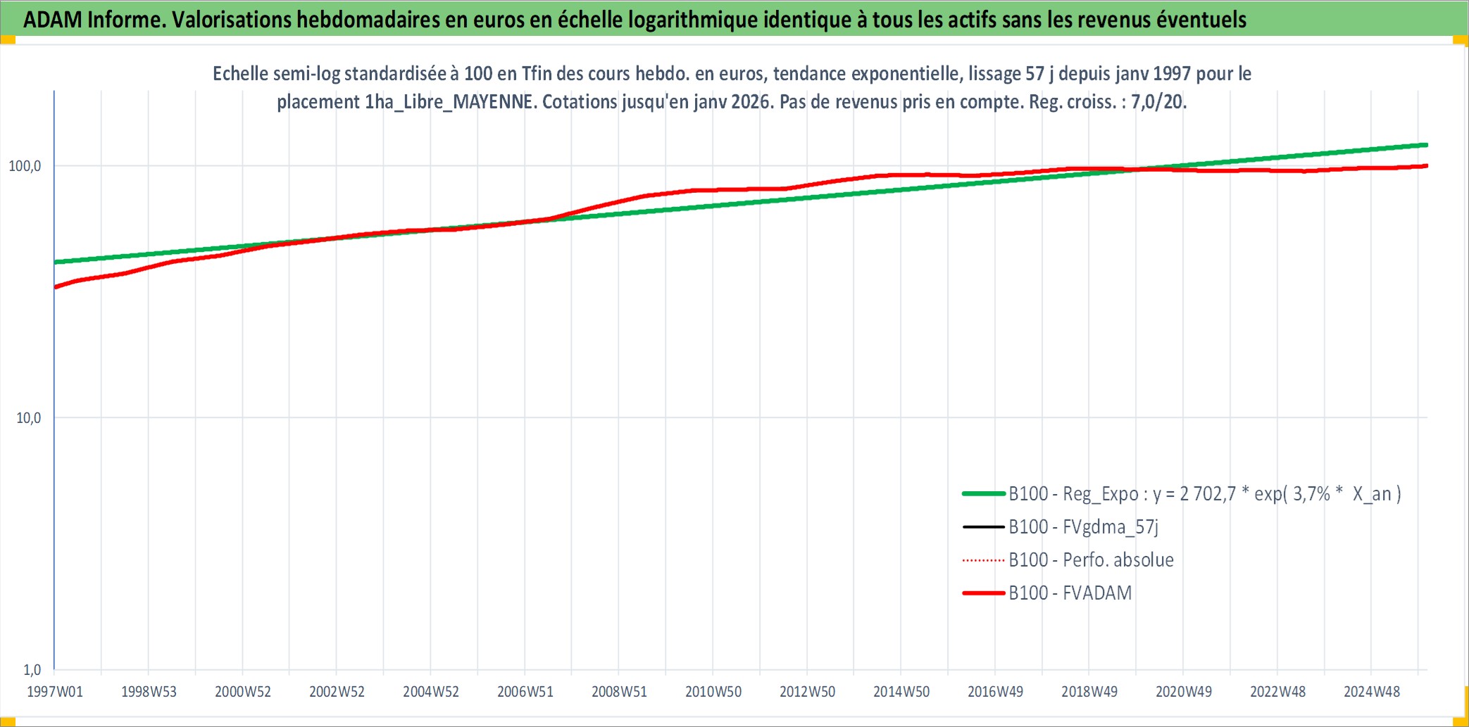 Site dédié aux investisseursPage dédiée sur site financeAnalyse des valorisations hebdomadaires de l'actif 1ha_Libre_MAYENNE. Cet actif est cote en EUR. Les valorisations couvrent les semaines 1997W01 a 2026W05. Les fermages de ce bien foncier sont pris egaux a 2,5% annuels de la valeur venale du bien.
