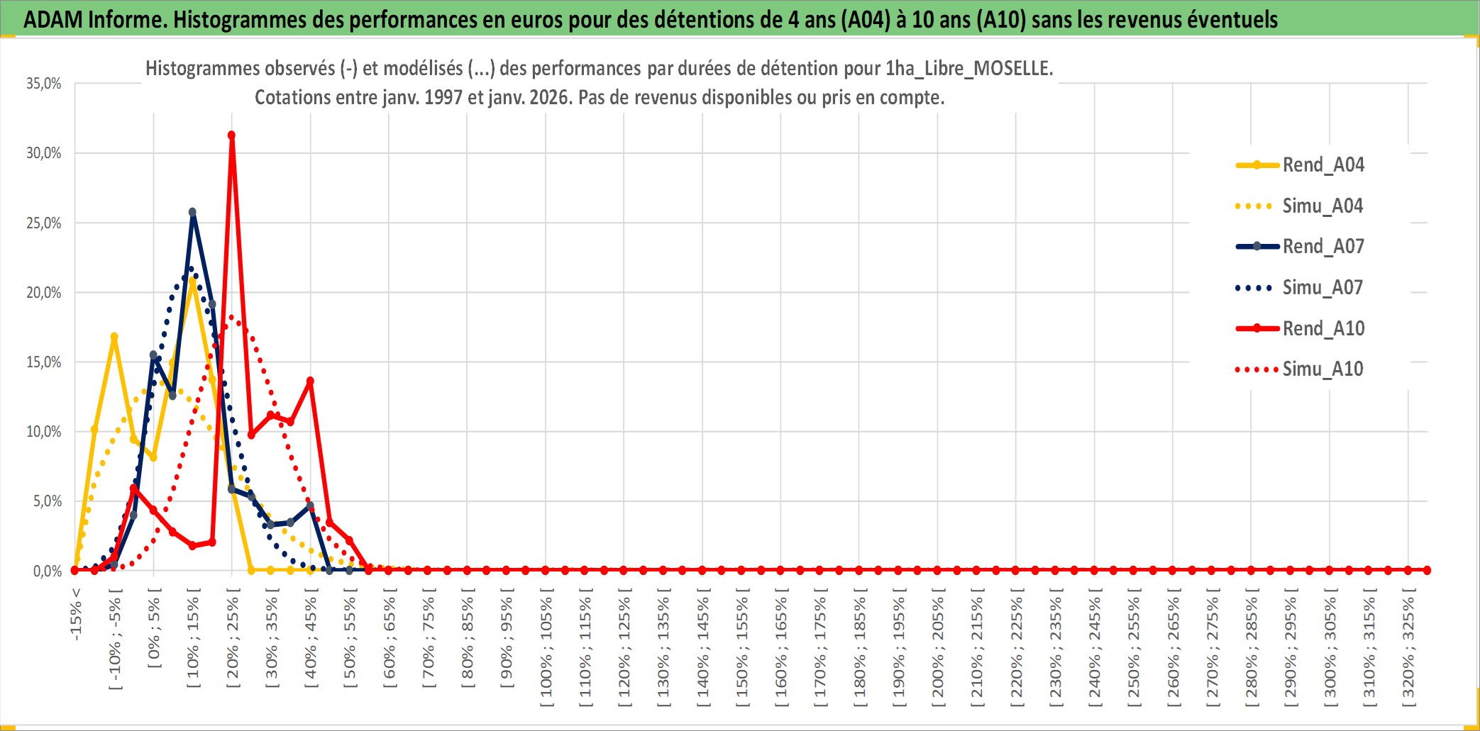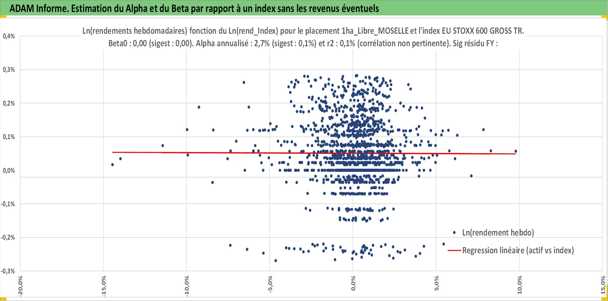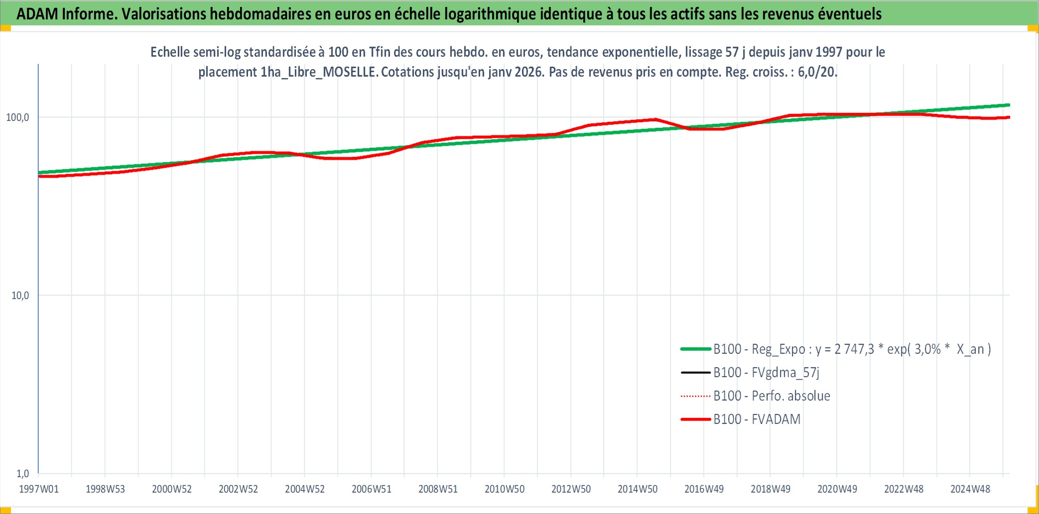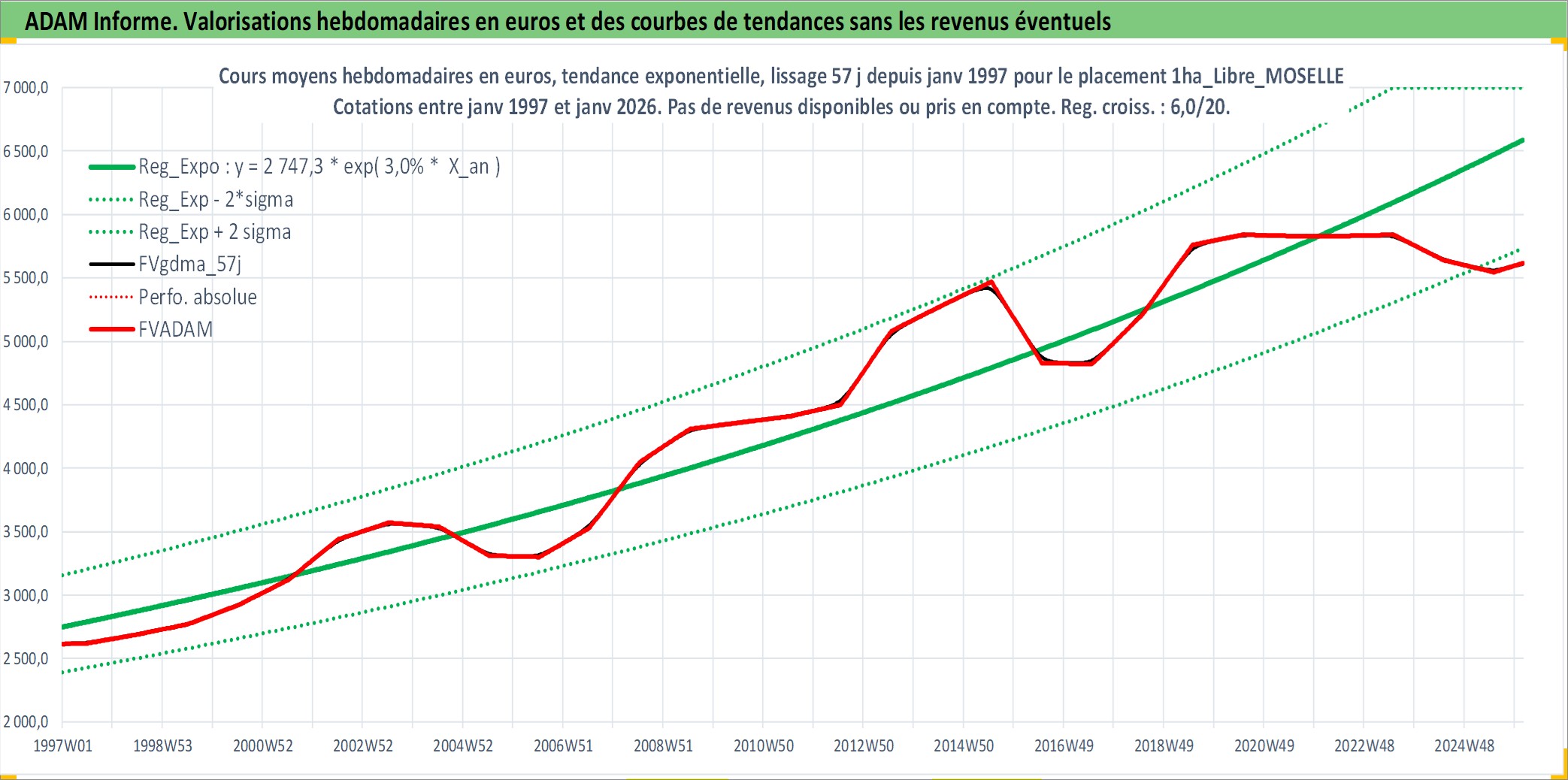 Site dédié aux investisseursPage dédiée sur site financeAnalyse des valorisations hebdomadaires de l'actif 1ha_Libre_MOSELLE. Cet actif est cote en EUR. Les valorisations couvrent les semaines 1997W01 a 2026W05. Les fermages de ce bien foncier sont pris egaux a 2,5% annuels de la valeur venale du bien.