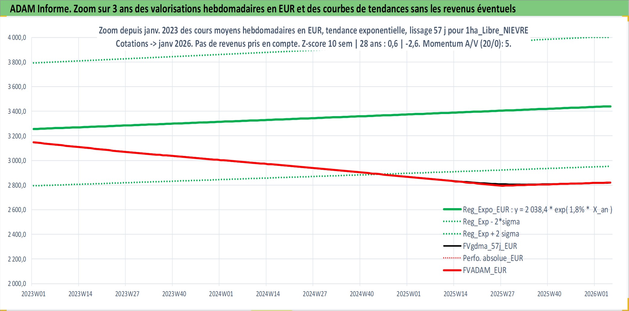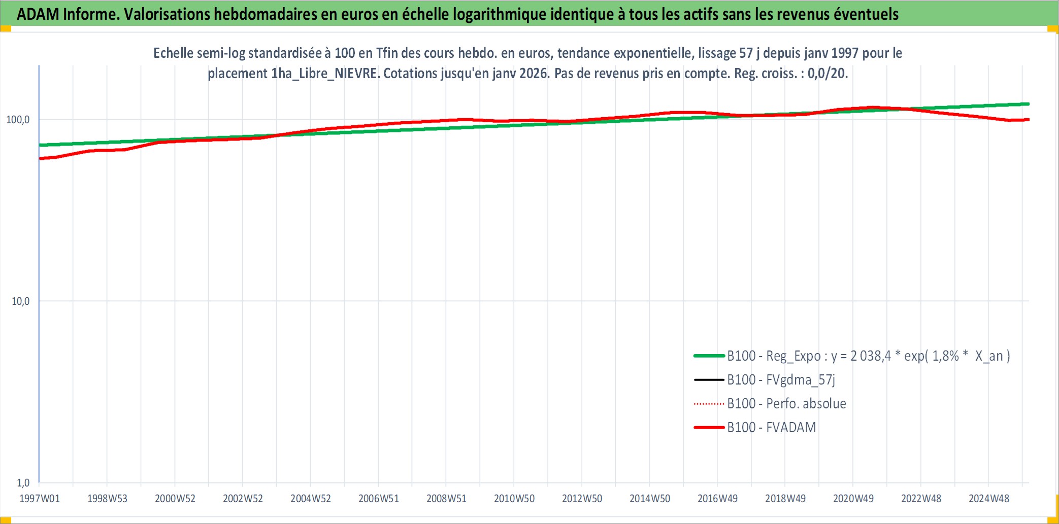 Site dédié aux investisseursPage dédiée sur site financeAnalyse des valorisations hebdomadaires de l'actif 1ha_Libre_NIEVRE. Cet actif est cote en EUR. Les valorisations couvrent les semaines 1997W01 a 2026W05. Les fermages de ce bien foncier sont pris egaux a 2,5% annuels de la valeur venale du bien.