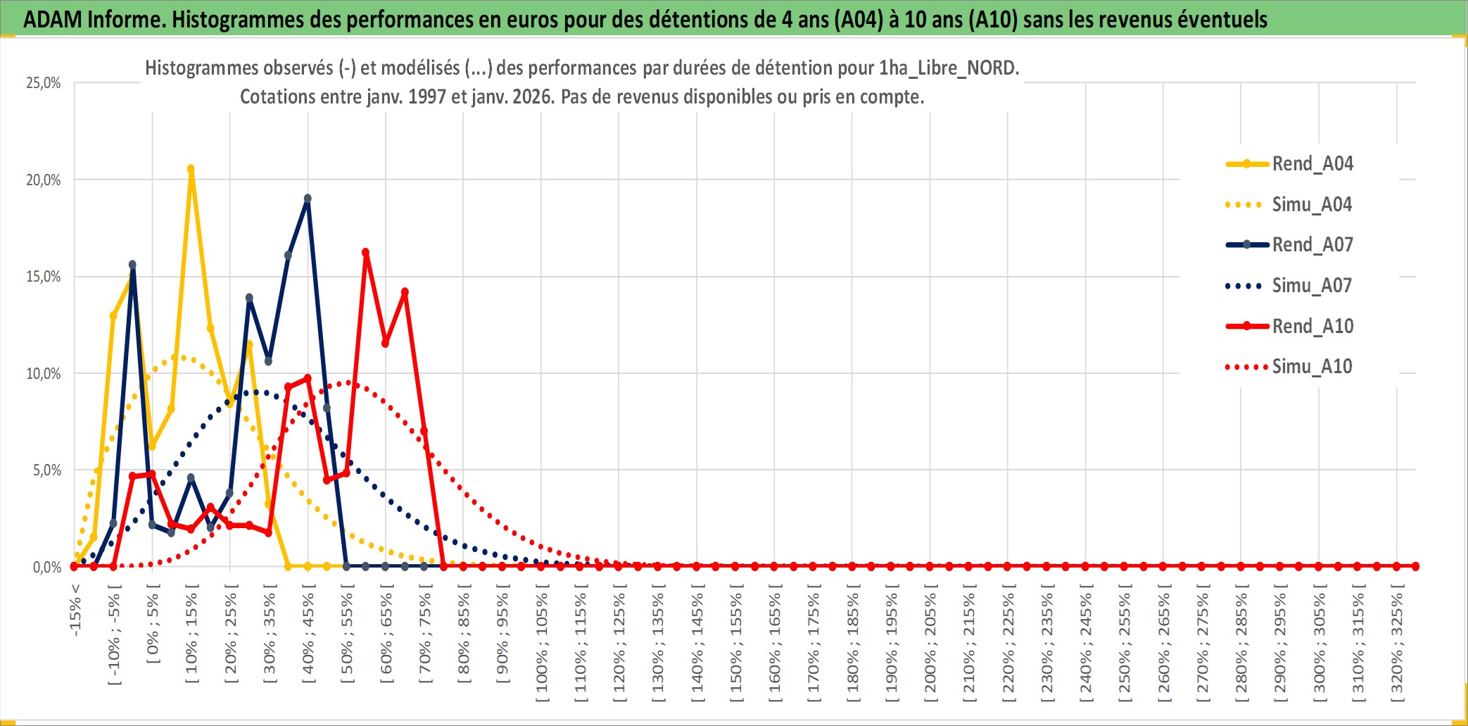 Site dédié aux investisseursPage dédiée sur site financeAnalyse des valorisations hebdomadaires de l'actif 1ha_Libre_NORD. Cet actif est cote en EUR. Les valorisations couvrent les semaines 1997W01 a 2026W05. Les fermages de ce bien foncier sont pris egaux a 2,5% annuels de la valeur venale du bien.