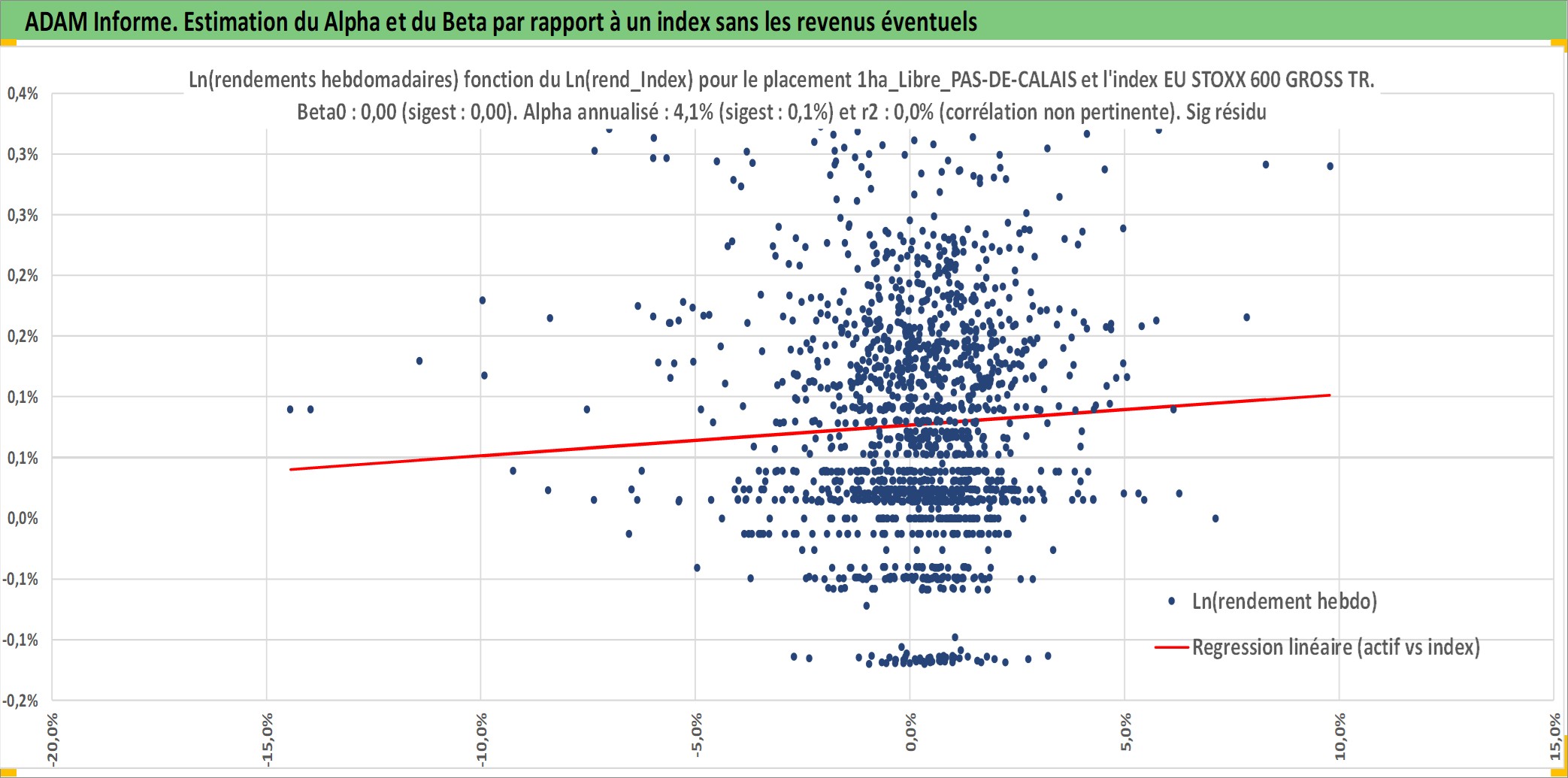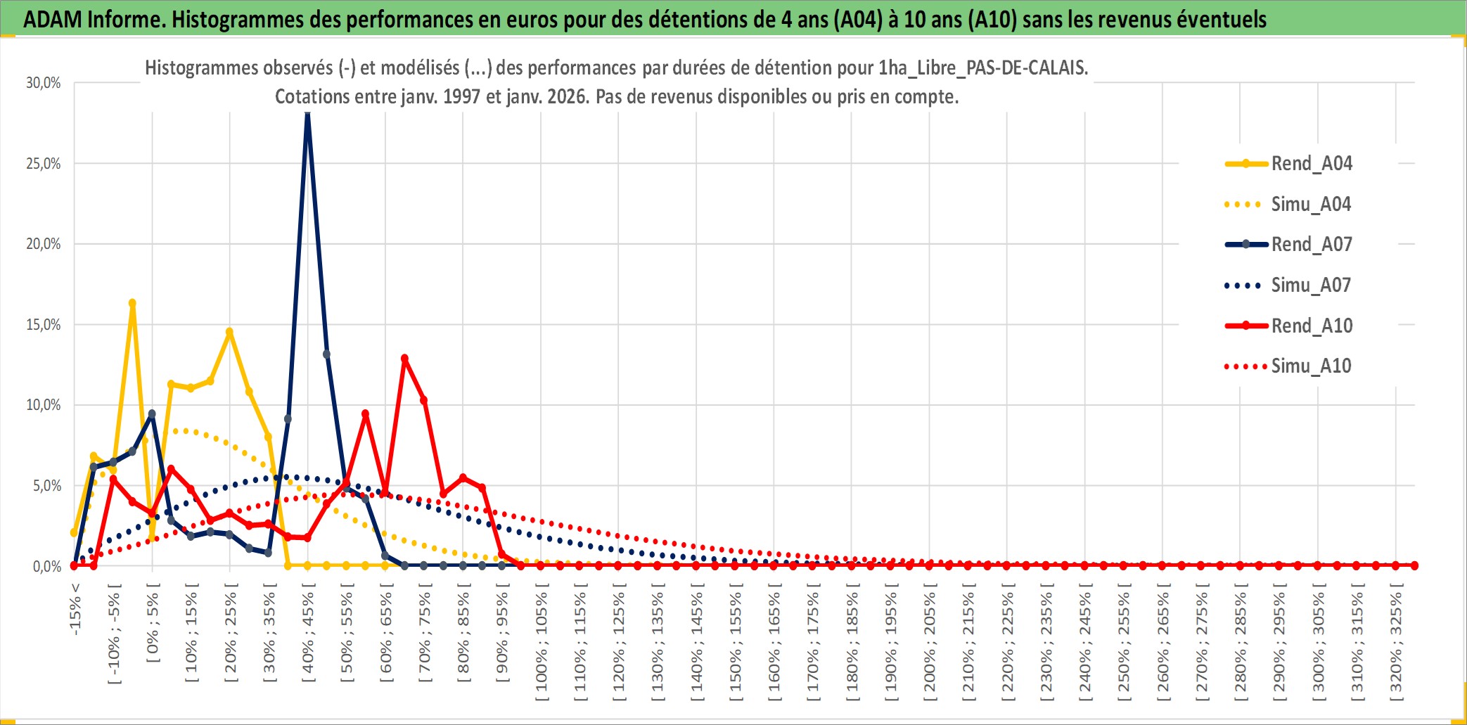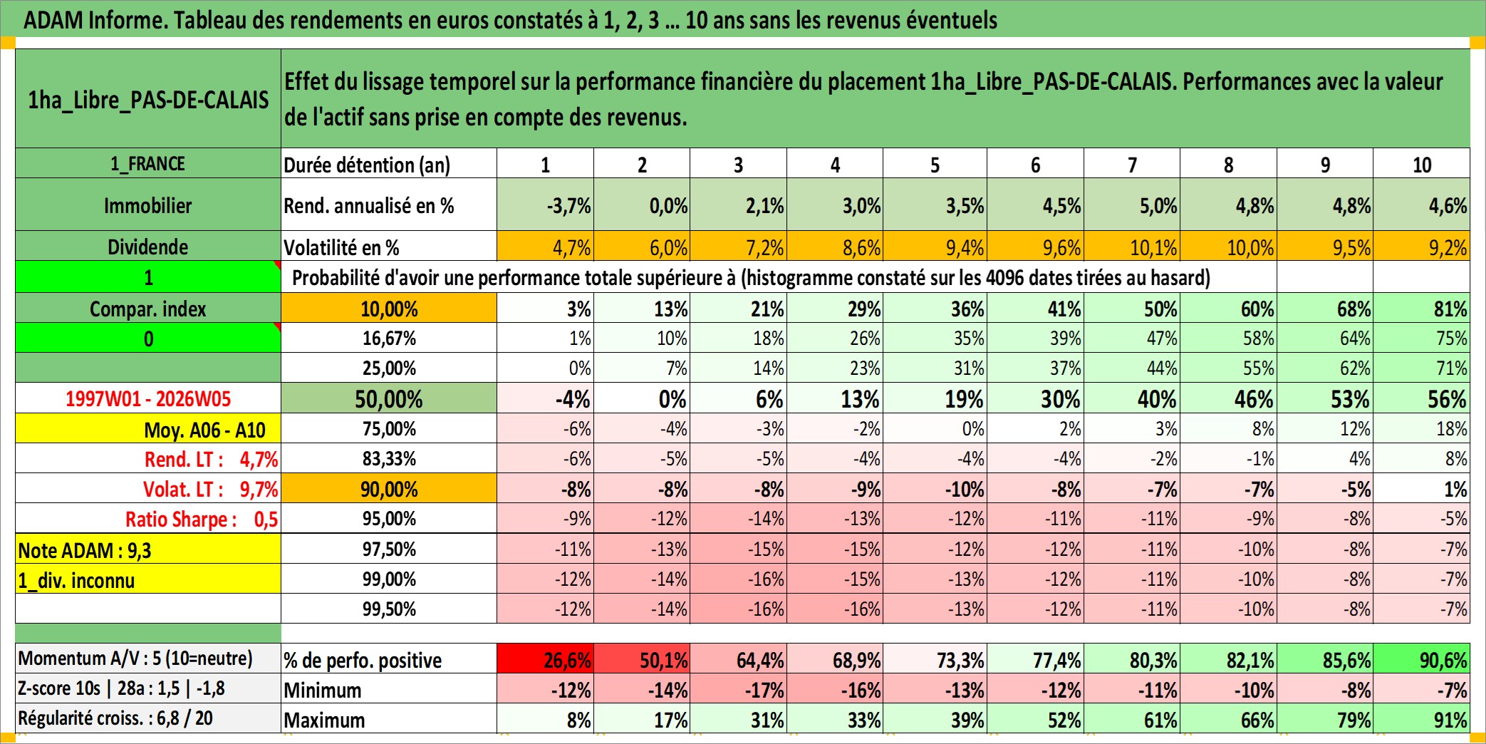 Site dédié aux investisseursPage dédiée sur site financeAnalyse des valorisations hebdomadaires de l'actif 1ha_Libre_PAS-DE-CALAIS. Cet actif est cote en EUR. Les valorisations couvrent les semaines 1997W01 a 2026W05. Les fermages de ce bien foncier sont pris egaux a 2,5% annuels de la valeur venale du bien.
