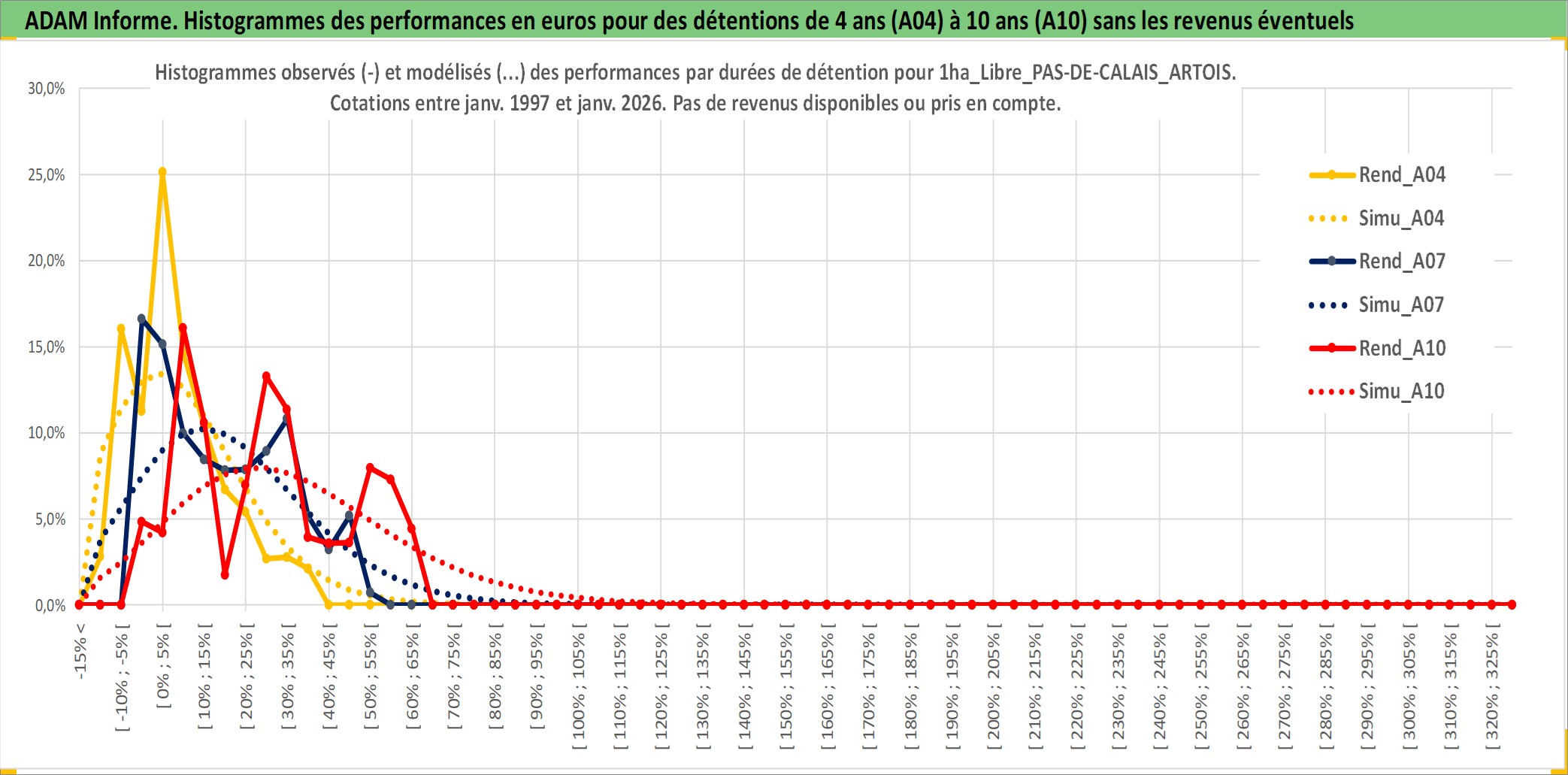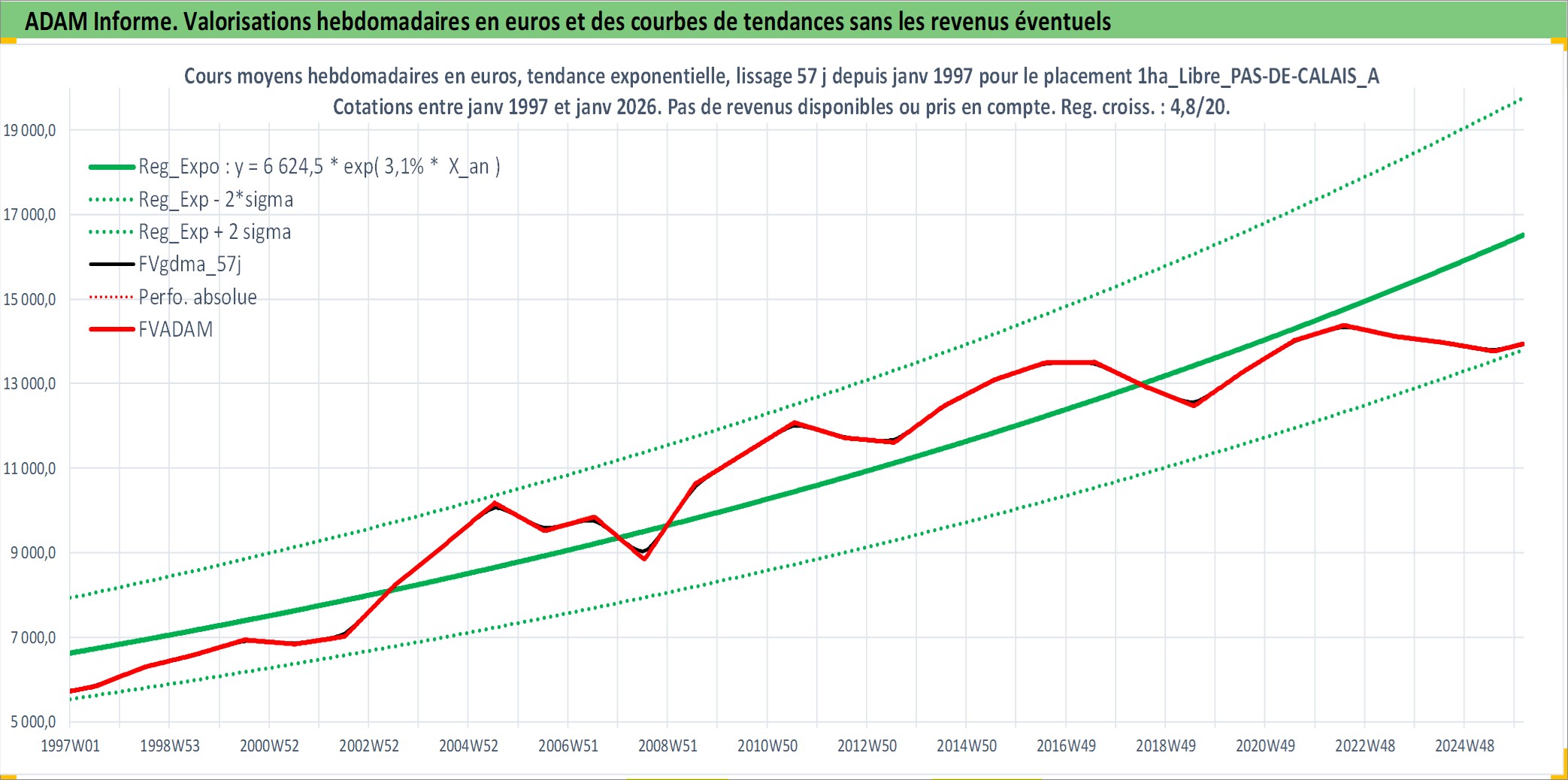 Site dédié aux investisseursPage dédiée sur site financeAnalyse des valorisations hebdomadaires de l'actif 1ha_Libre_PAS-DE-CALAIS_ARTOIS. Cet actif est cote en EUR. Les valorisations couvrent les semaines 1997W01 a 2026W05. Les fermages de ce bien foncier sont pris egaux a 2,5% annuels de la valeur venale du bien.