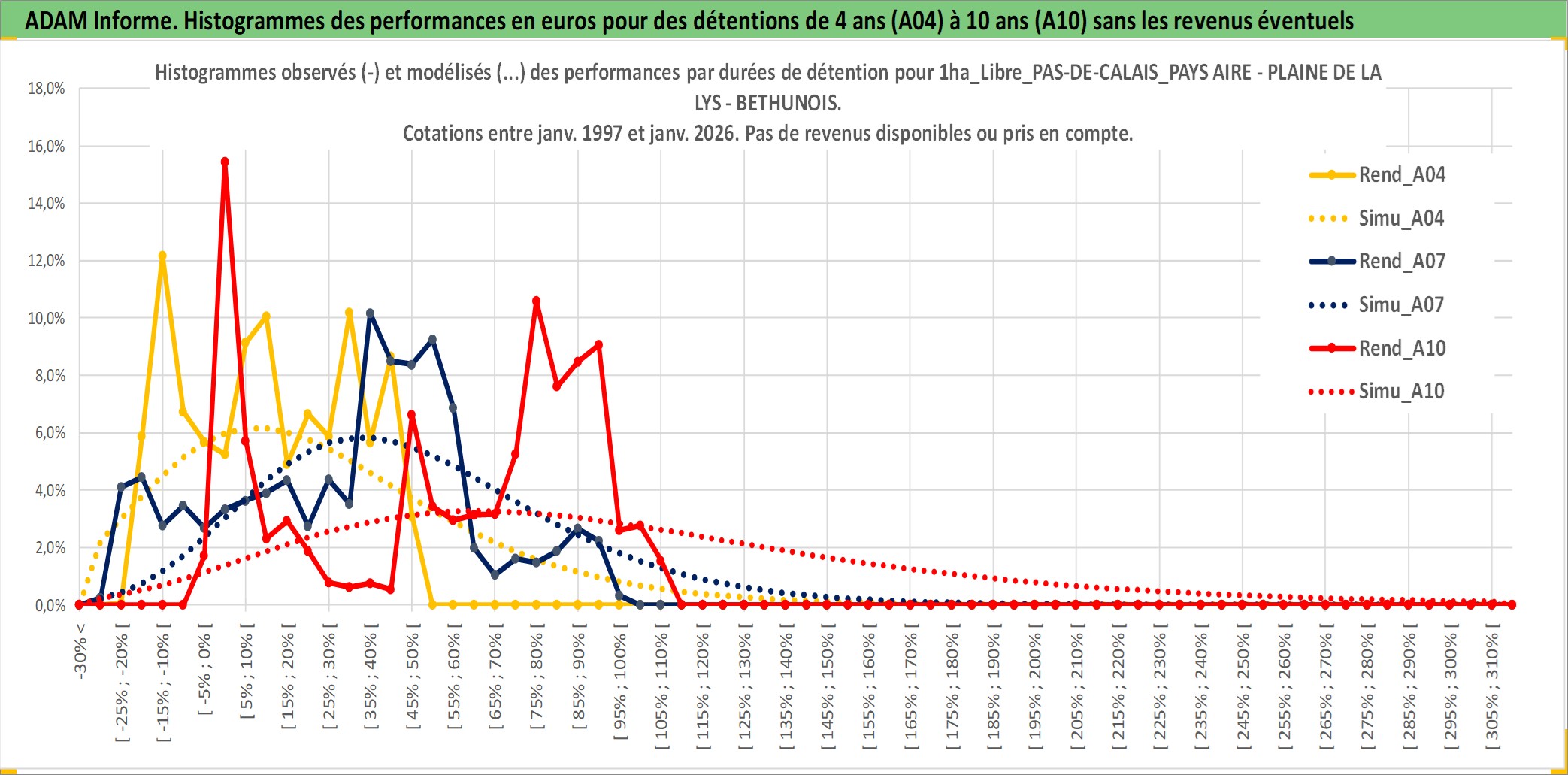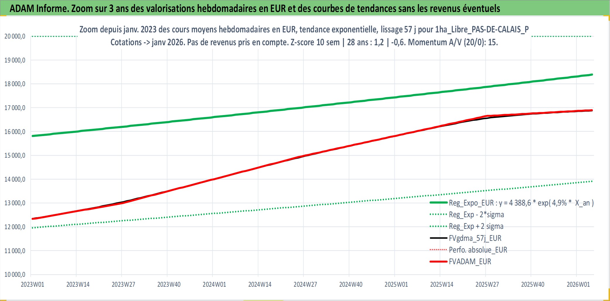 Site dédié aux investisseursPage dédiée sur site financeAnalyse des valorisations hebdomadaires de l'actif 1ha_Libre_PAS-DE-CALAIS_PAYS AIRE - PLAINE DE LA LYS - BETHUNOIS. Cet actif est cote en EUR. Les valorisations couvrent les semaines 1997W01 a 2026W05. Les fermages de ce bien foncier sont pris egaux a 2,5% annuels de la valeur venale du bien.