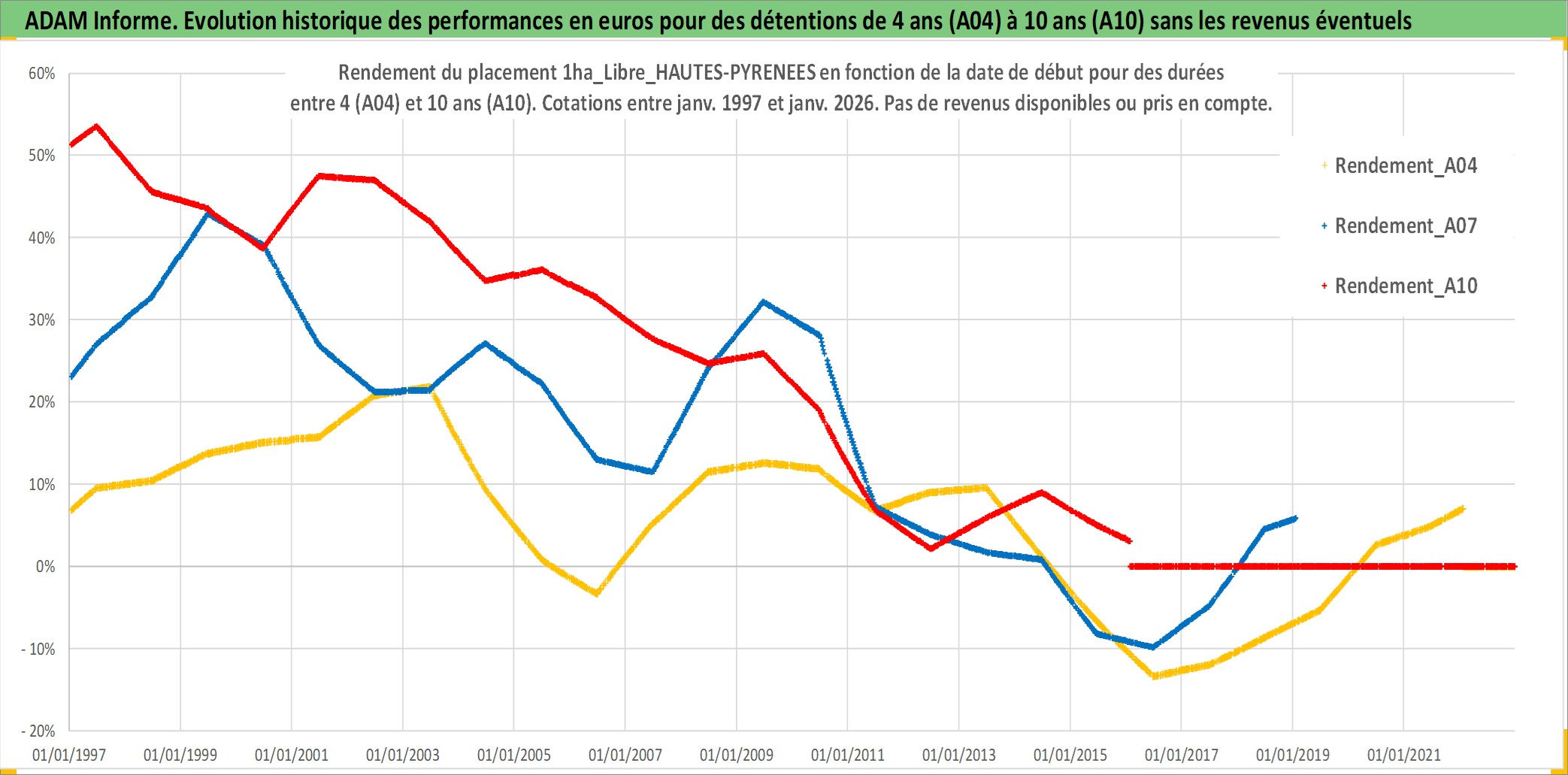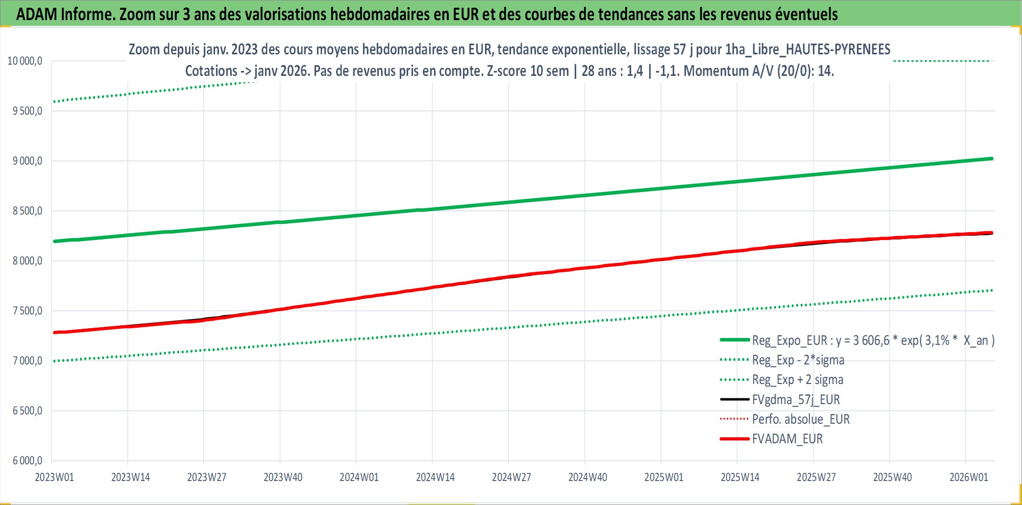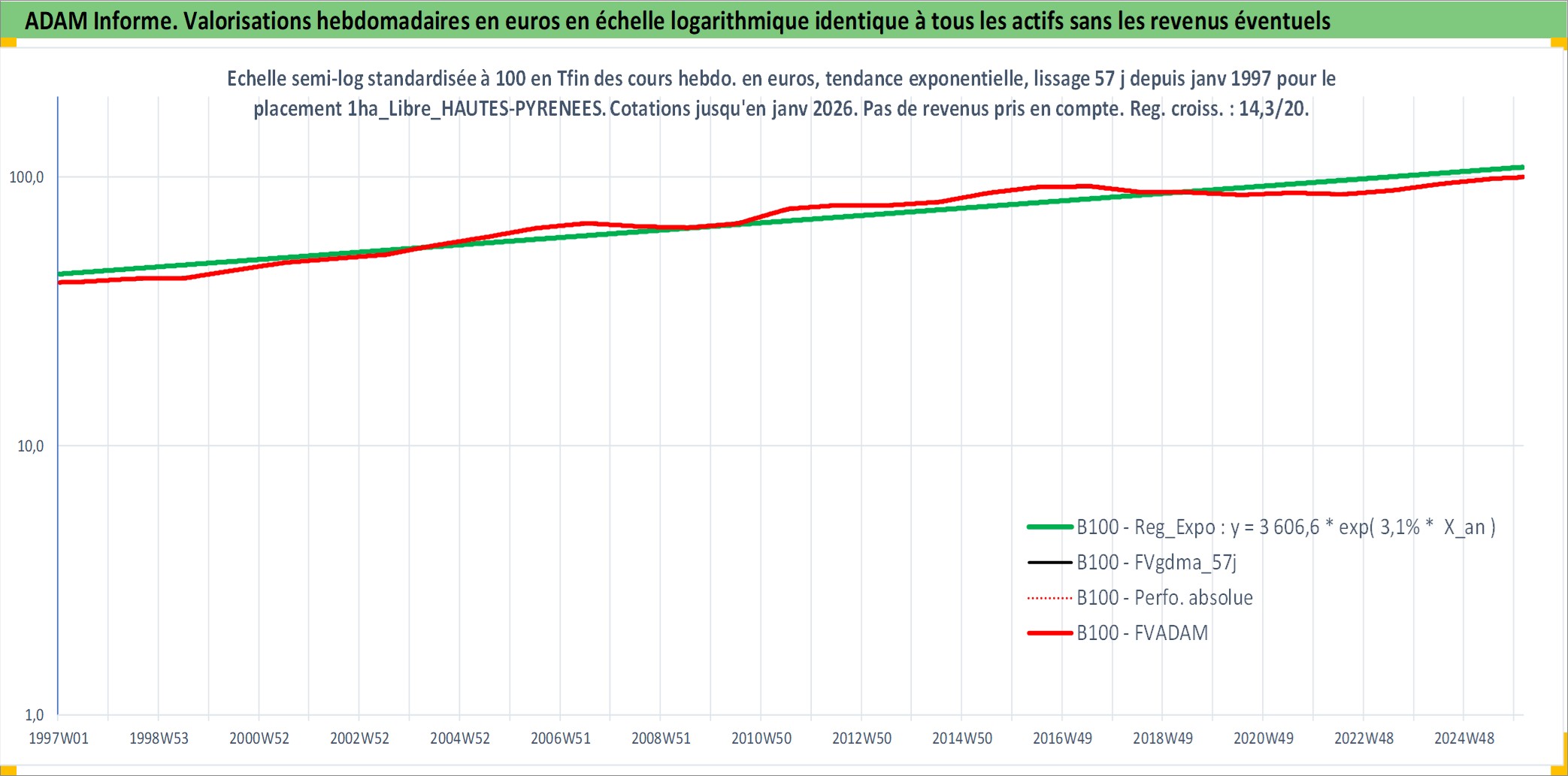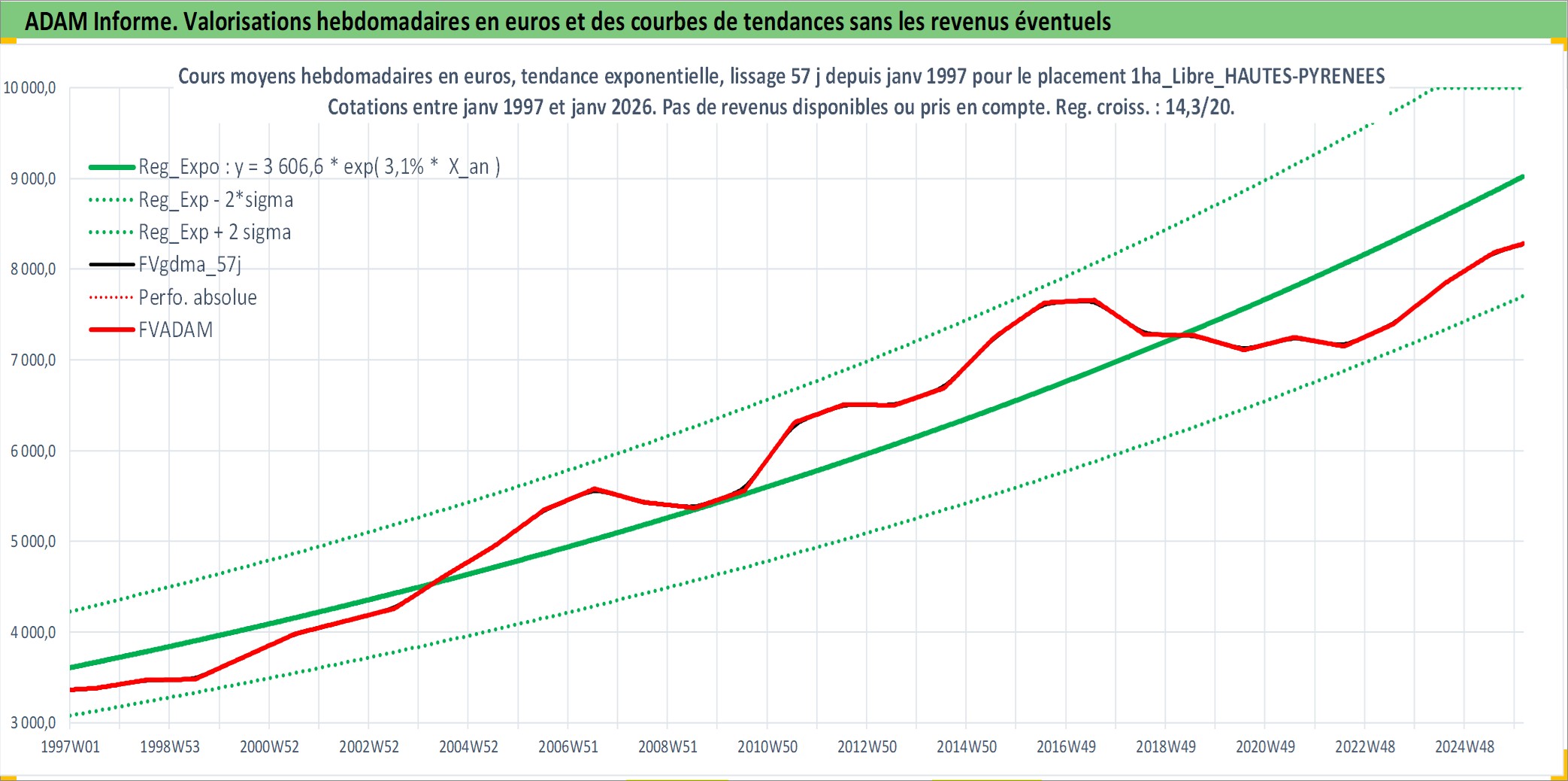 Site dédié aux investisseursPage dédiée sur site financeAnalyse des valorisations hebdomadaires de l'actif 1ha_Libre_HAUTES-PYRENEES. Cet actif est cote en EUR. Les valorisations couvrent les semaines 1997W01 a 2026W05. Les fermages de ce bien foncier sont pris egaux a 2,5% annuels de la valeur venale du bien.