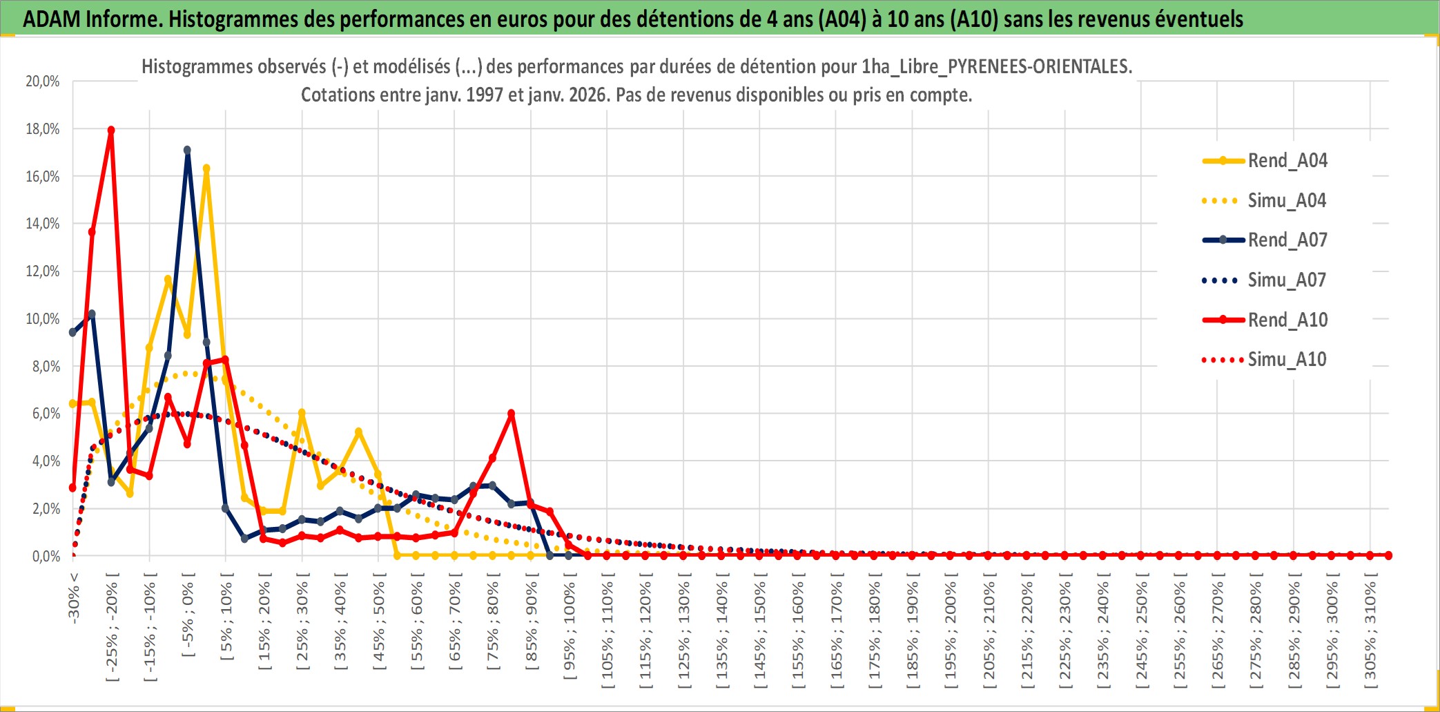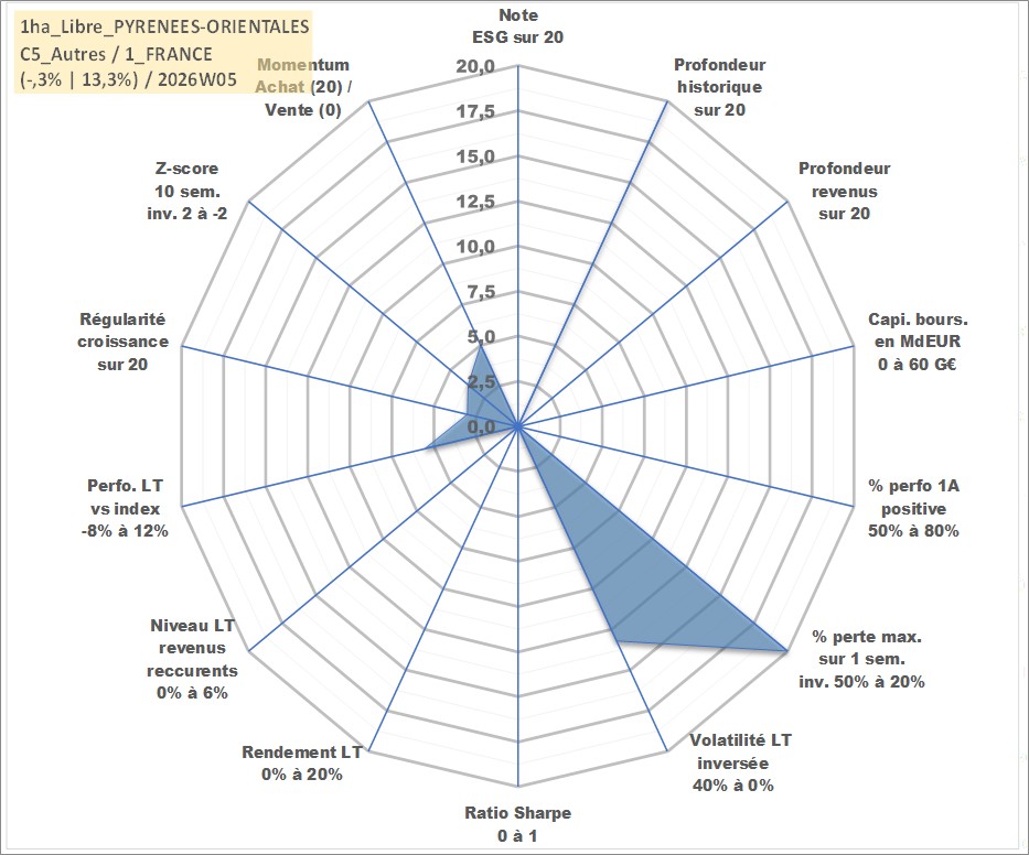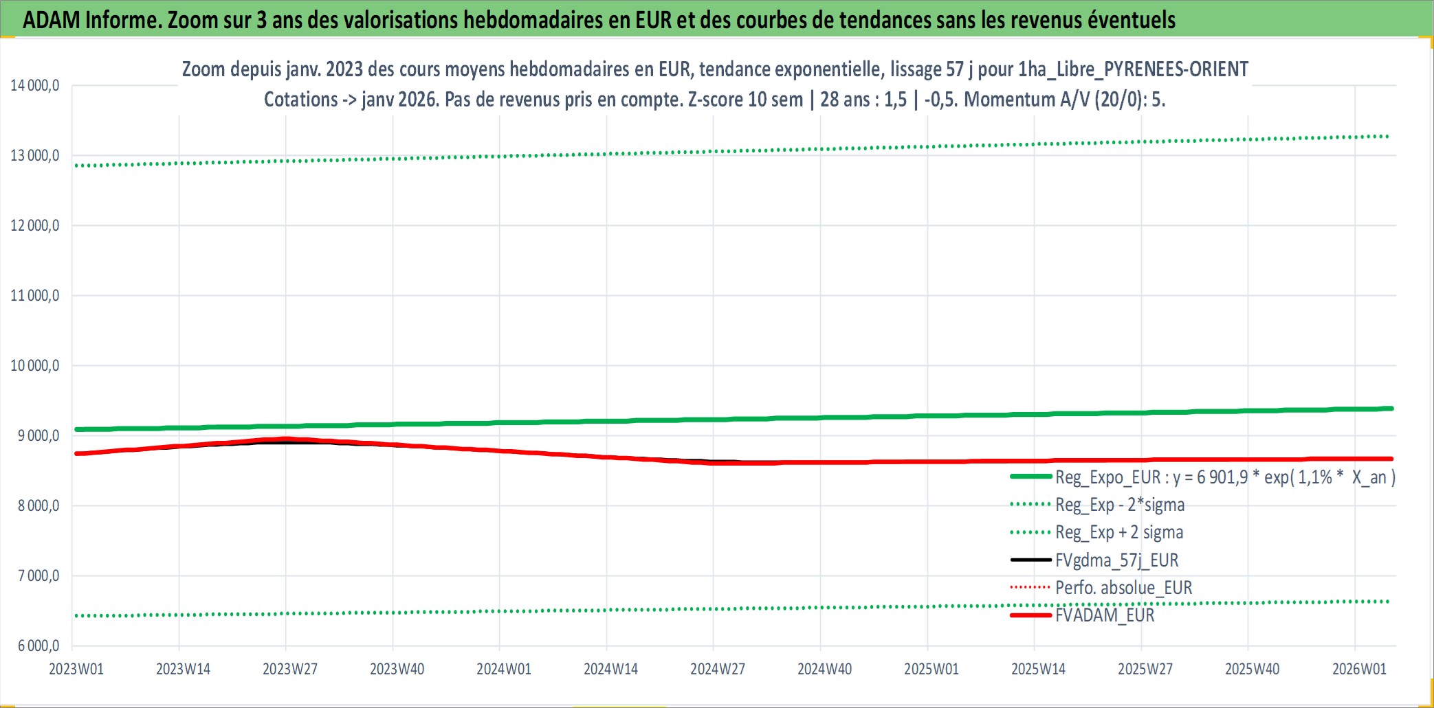 Site dédié aux investisseursPage dédiée sur site financeAnalyse des valorisations hebdomadaires de l'actif 1ha_Libre_PYRENEES-ORIENTALES. Cet actif est cote en EUR. Les valorisations couvrent les semaines 1997W01 a 2026W05. Les fermages de ce bien foncier sont pris egaux a 2,5% annuels de la valeur venale du bien.