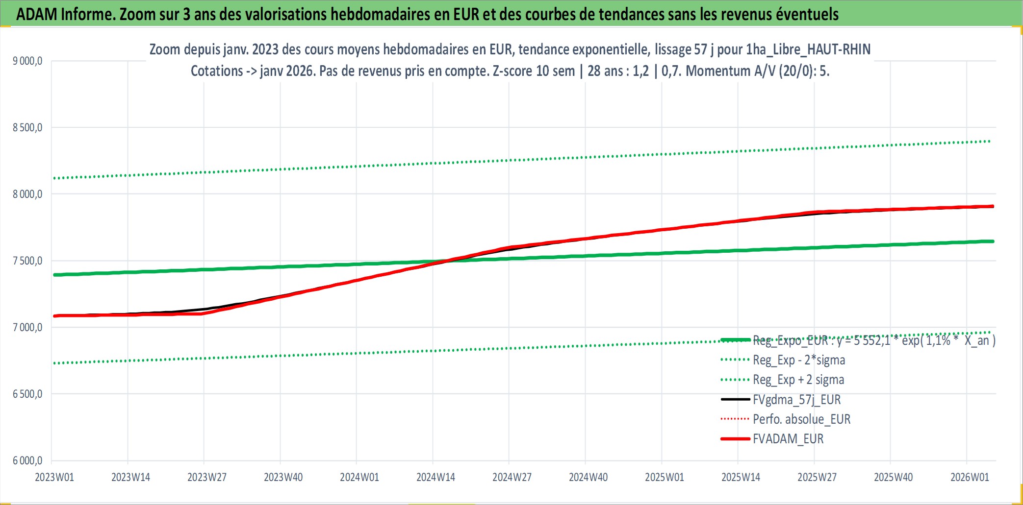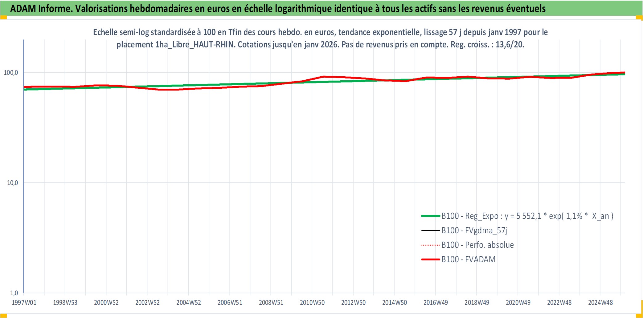 Site dédié aux investisseursPage dédiée sur site financeAnalyse des valorisations hebdomadaires de l'actif 1ha_Libre_HAUT-RHIN. Cet actif est cote en EUR. Les valorisations couvrent les semaines 1997W01 a 2026W05. Les fermages de ce bien foncier sont pris egaux a 2,5% annuels de la valeur venale du bien.