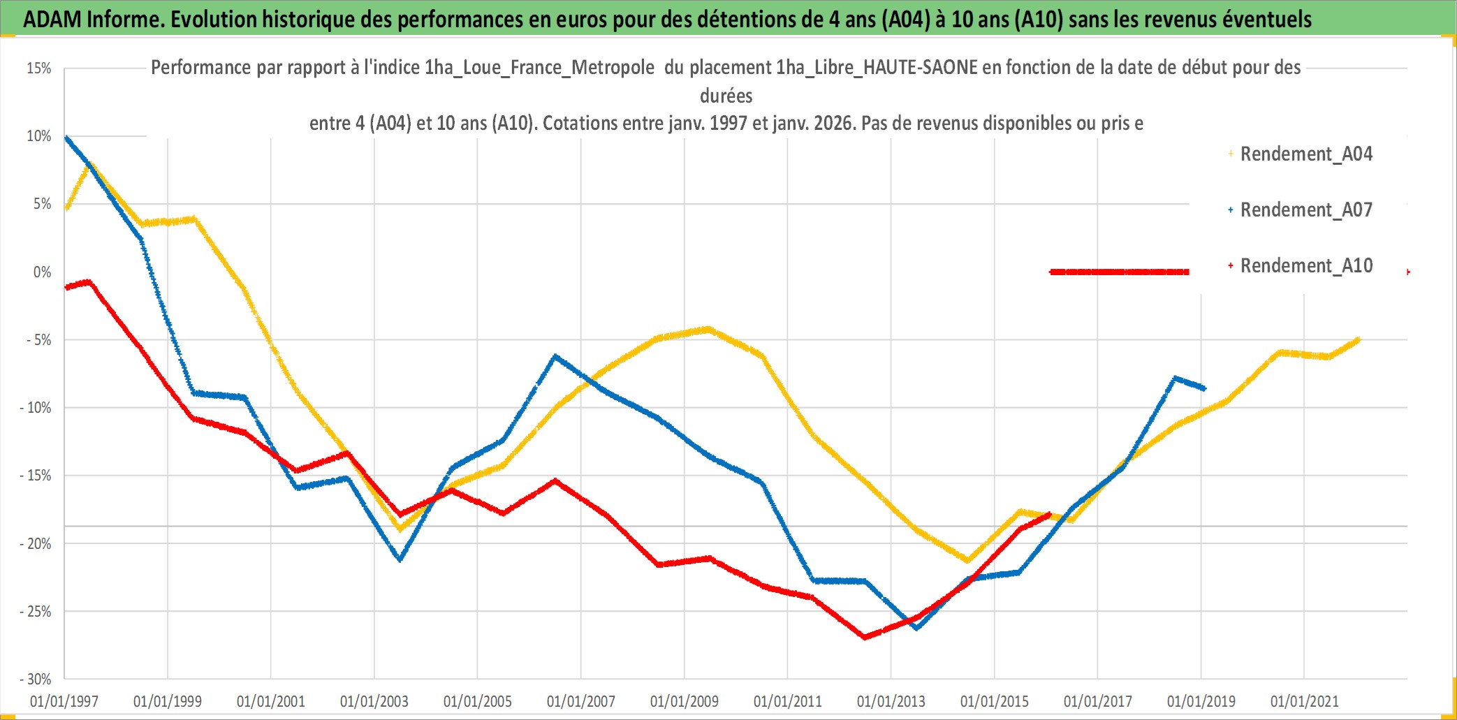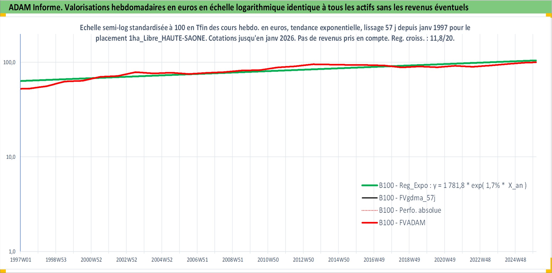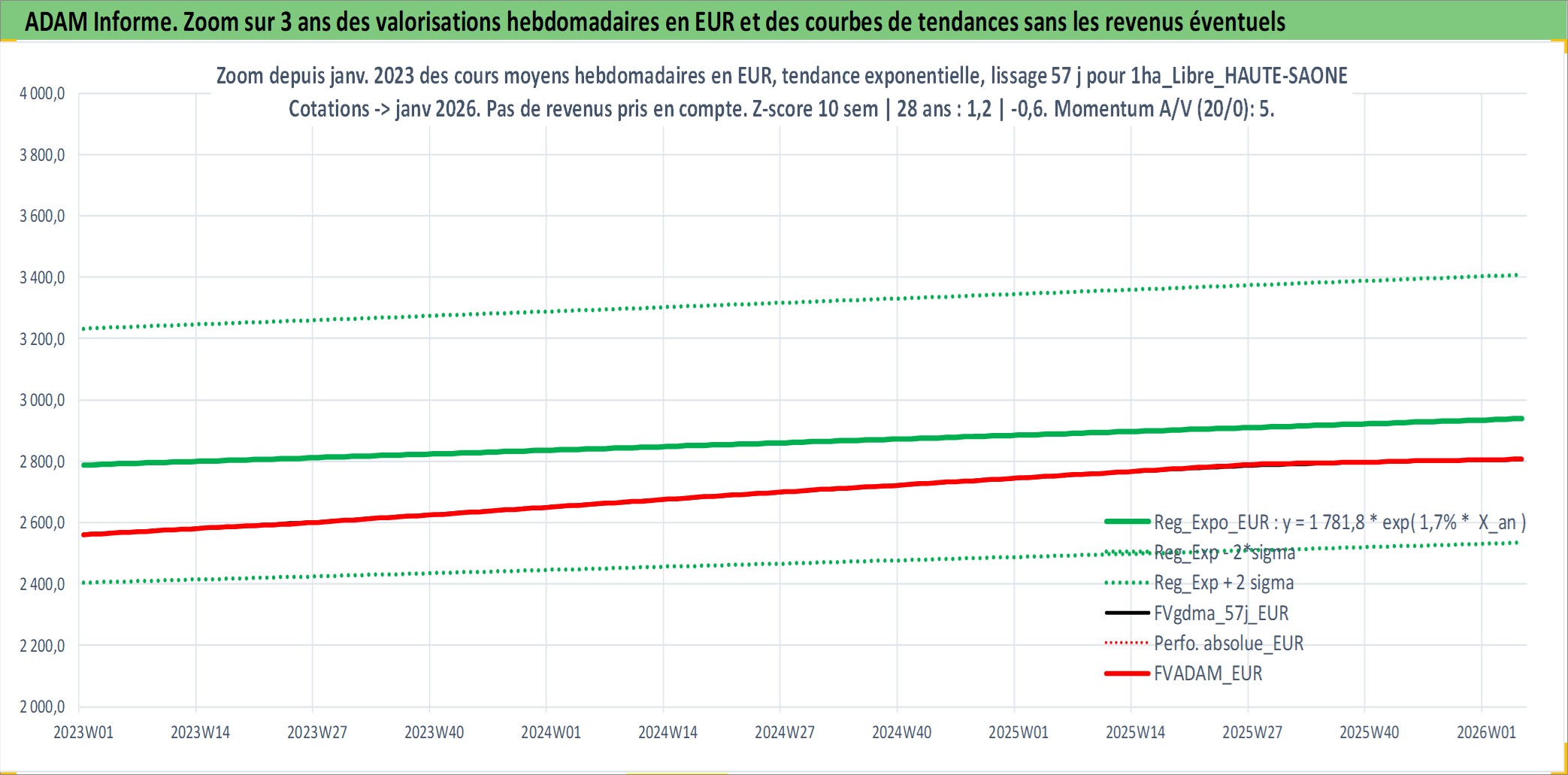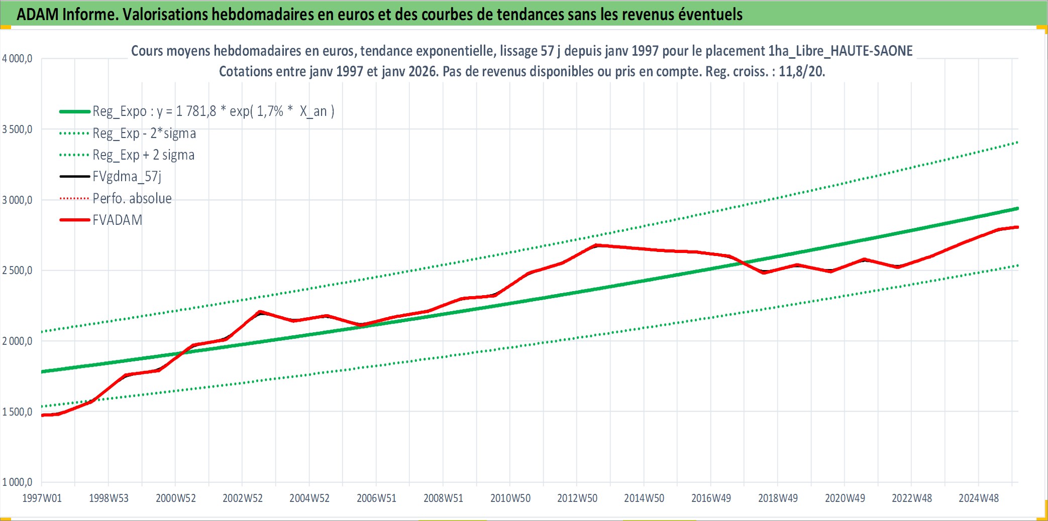 Site dédié aux investisseursPage dédiée sur site financeAnalyse des valorisations hebdomadaires de l'actif 1ha_Libre_HAUTE-SAONE. Cet actif est cote en EUR. Les valorisations couvrent les semaines 1997W01 a 2026W05. Les fermages de ce bien foncier sont pris egaux a 2,5% annuels de la valeur venale du bien.