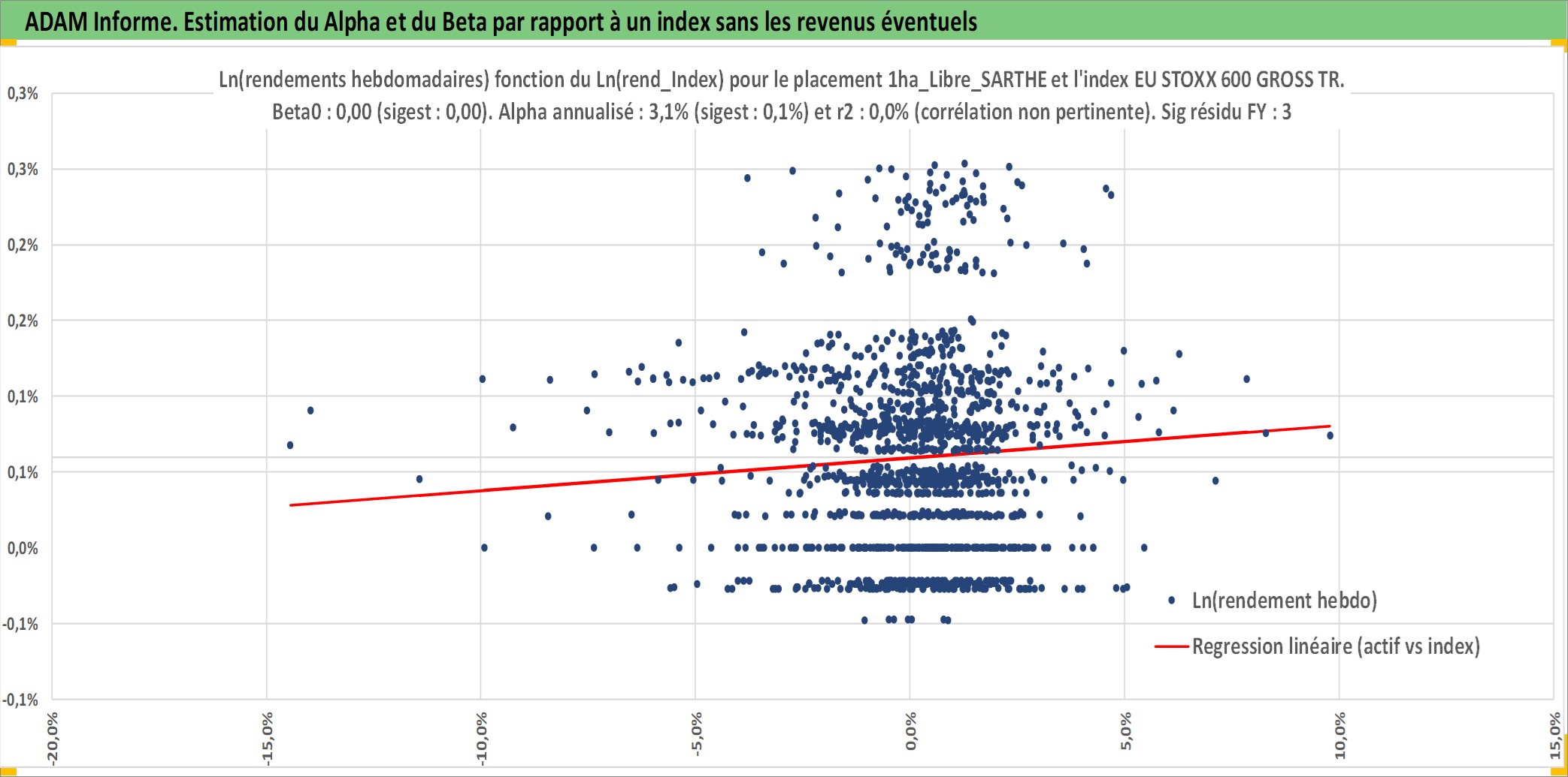 Site dédié aux investisseursPage dédiée sur site financeAnalyse des valorisations hebdomadaires de l'actif 1ha_Libre_SARTHE. Cet actif est cote en EUR. Les valorisations couvrent les semaines 1997W01 a 2026W05. Les fermages de ce bien foncier sont pris egaux a 2,5% annuels de la valeur venale du bien.