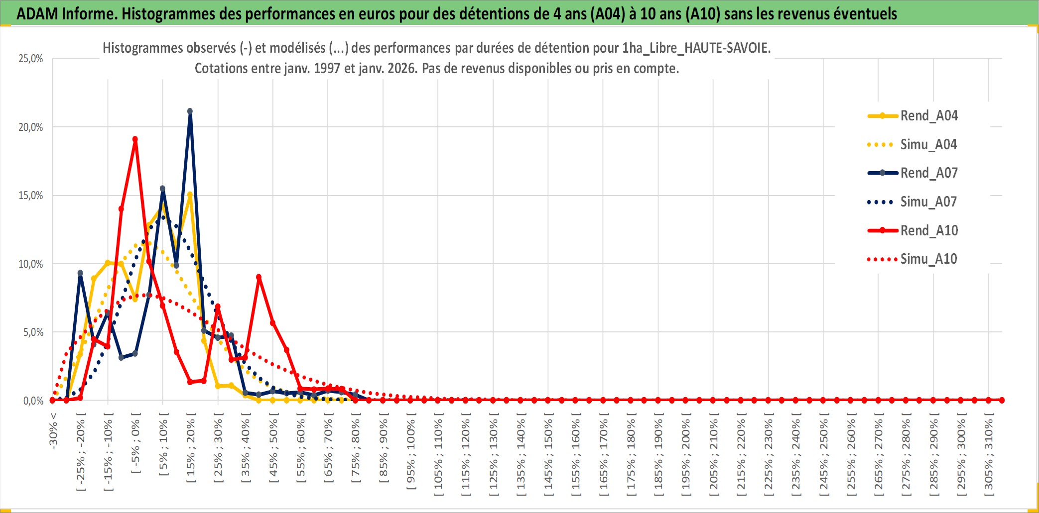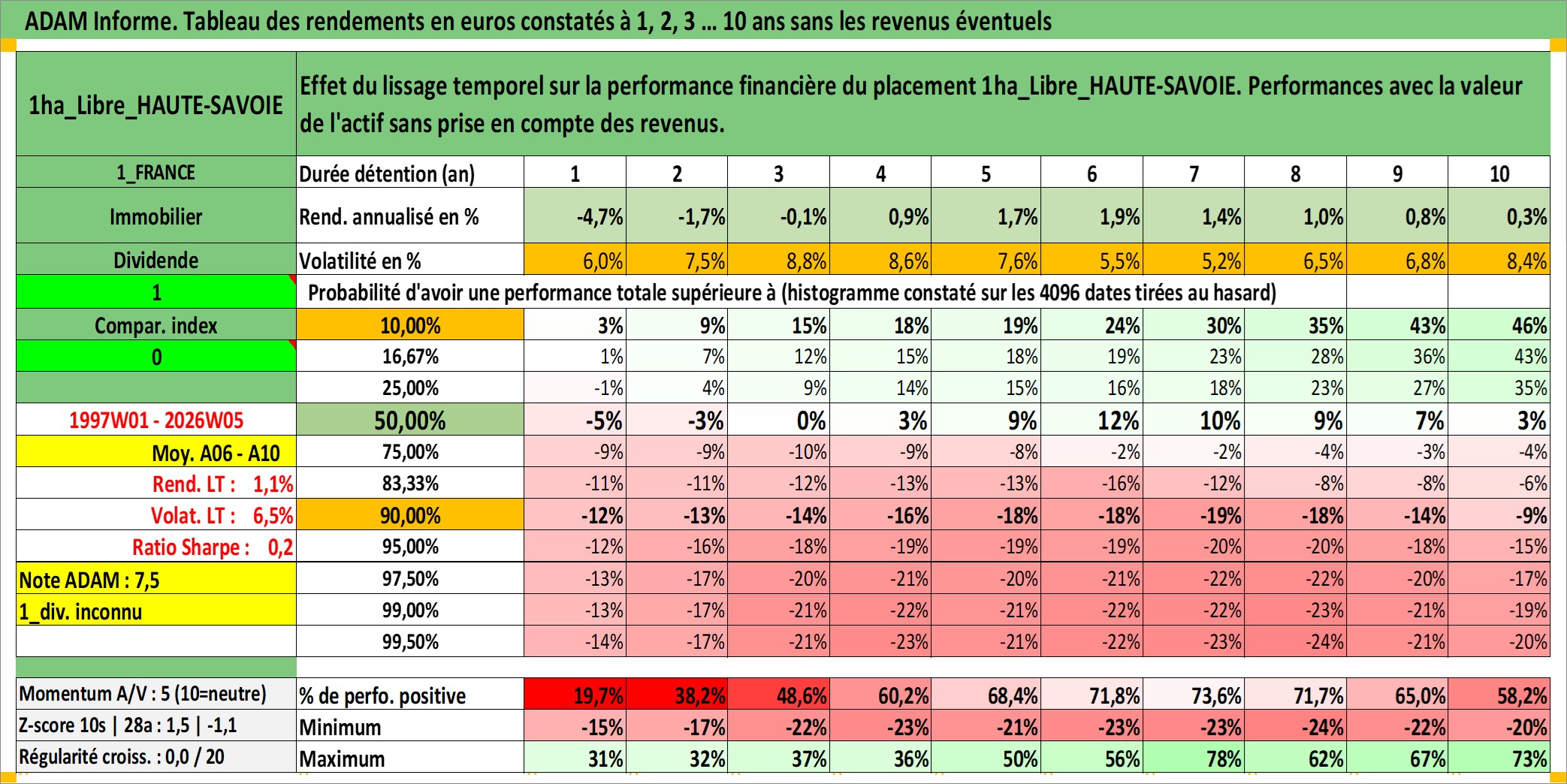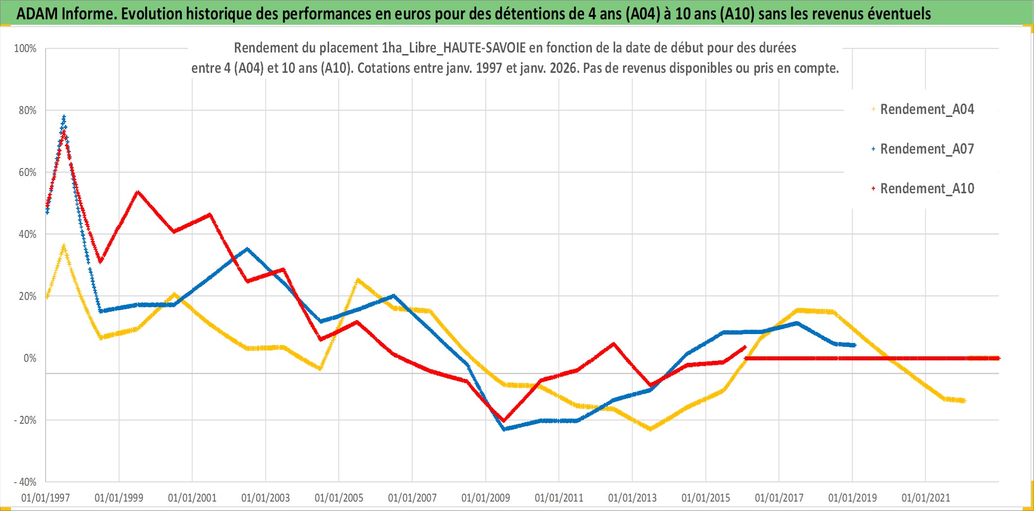 Site dédié aux investisseursPage dédiée sur site financeAnalyse des valorisations hebdomadaires de l'actif 1ha_Libre_HAUTE-SAVOIE. Cet actif est cote en EUR. Les valorisations couvrent les semaines 1997W01 a 2026W05. Les fermages de ce bien foncier sont pris egaux a 2,5% annuels de la valeur venale du bien.