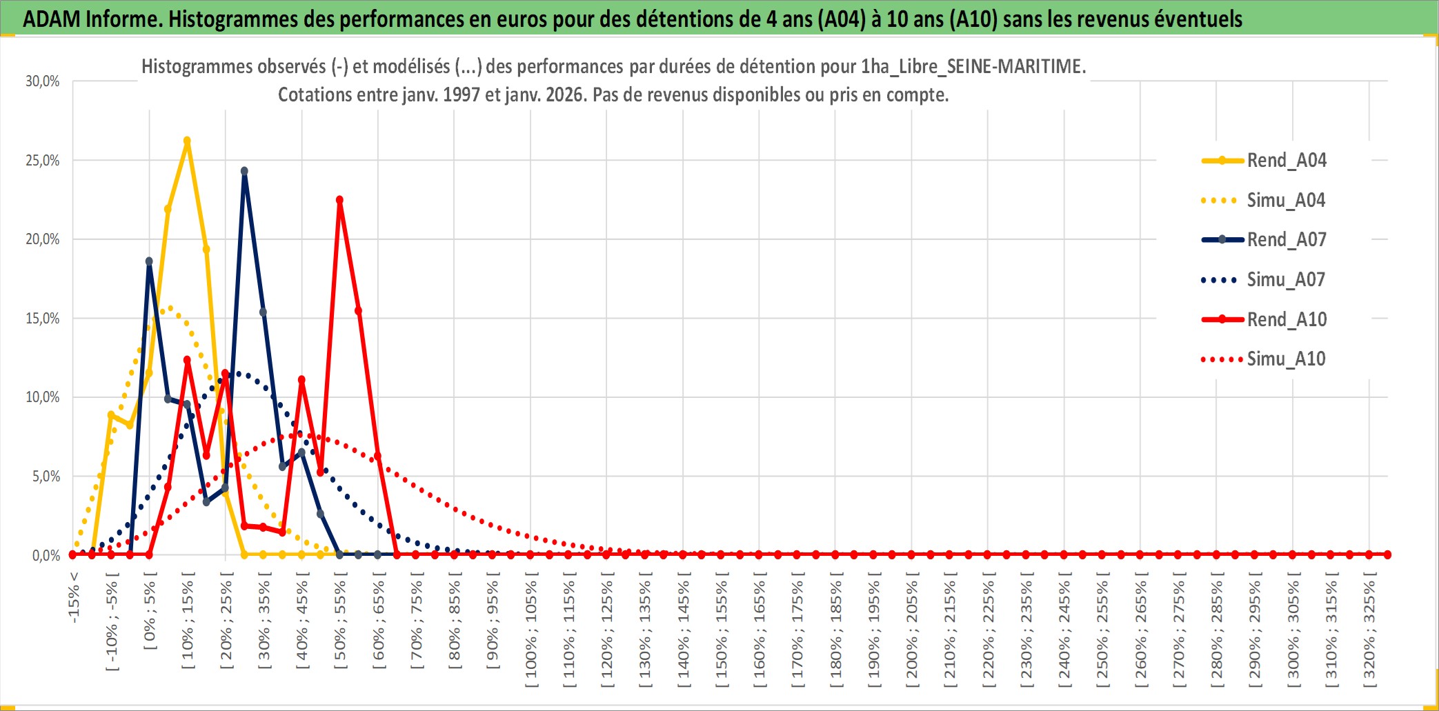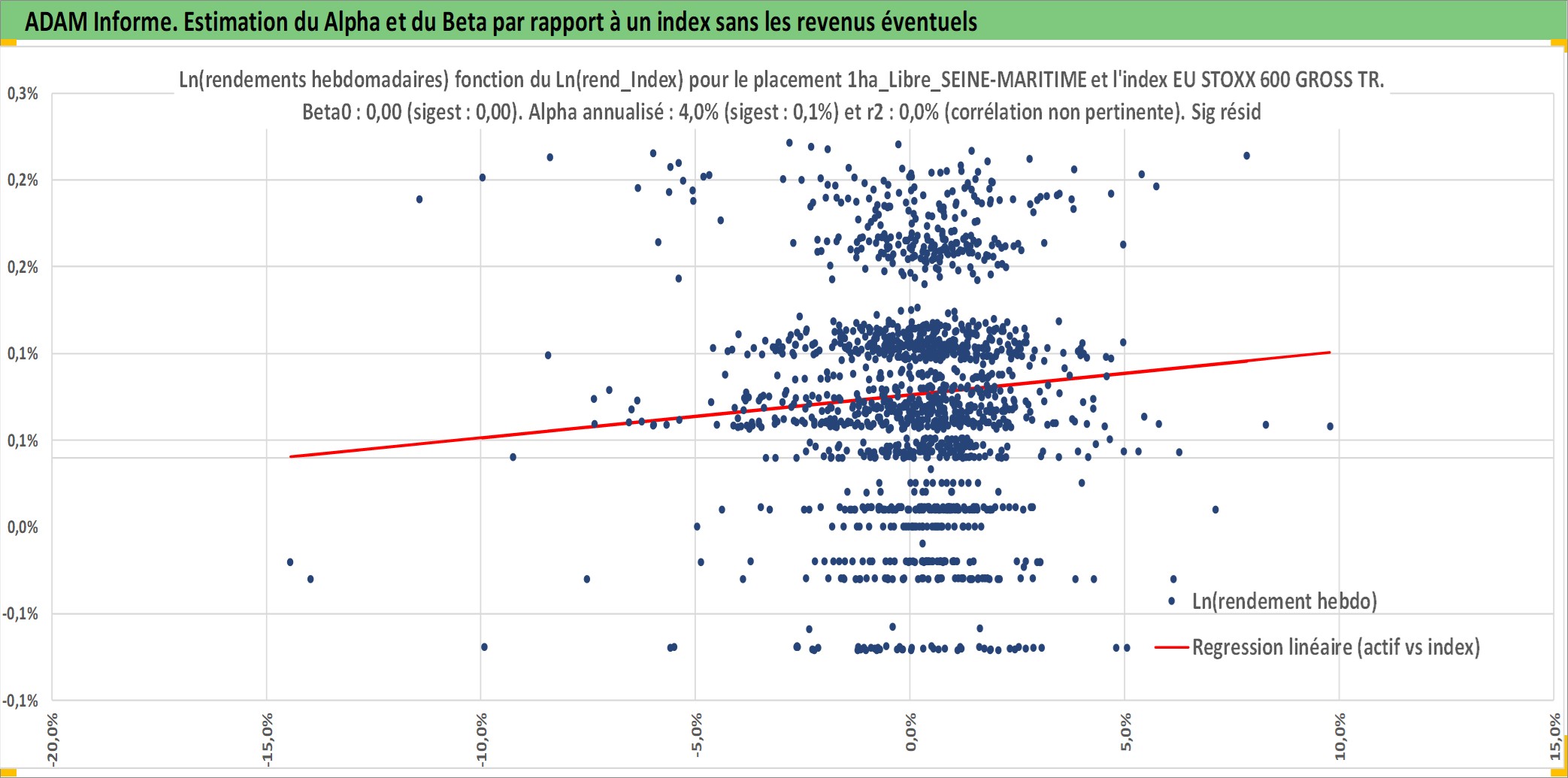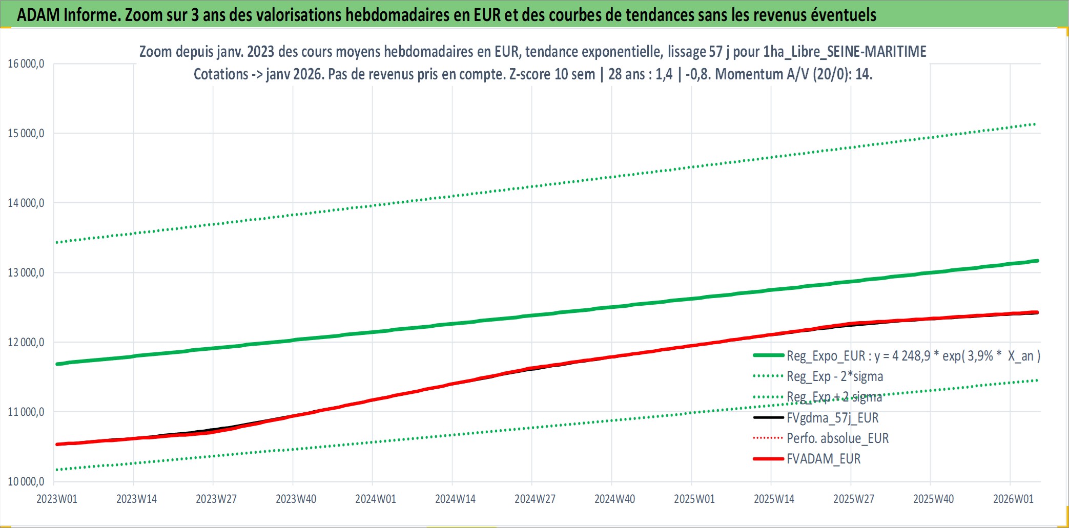 Site dédié aux investisseursPage dédiée sur site financeAnalyse des valorisations hebdomadaires de l'actif 1ha_Libre_SEINE-MARITIME. Cet actif est cote en EUR. Les valorisations couvrent les semaines 1997W01 a 2026W05. Les fermages de ce bien foncier sont pris egaux a 2,5% annuels de la valeur venale du bien.