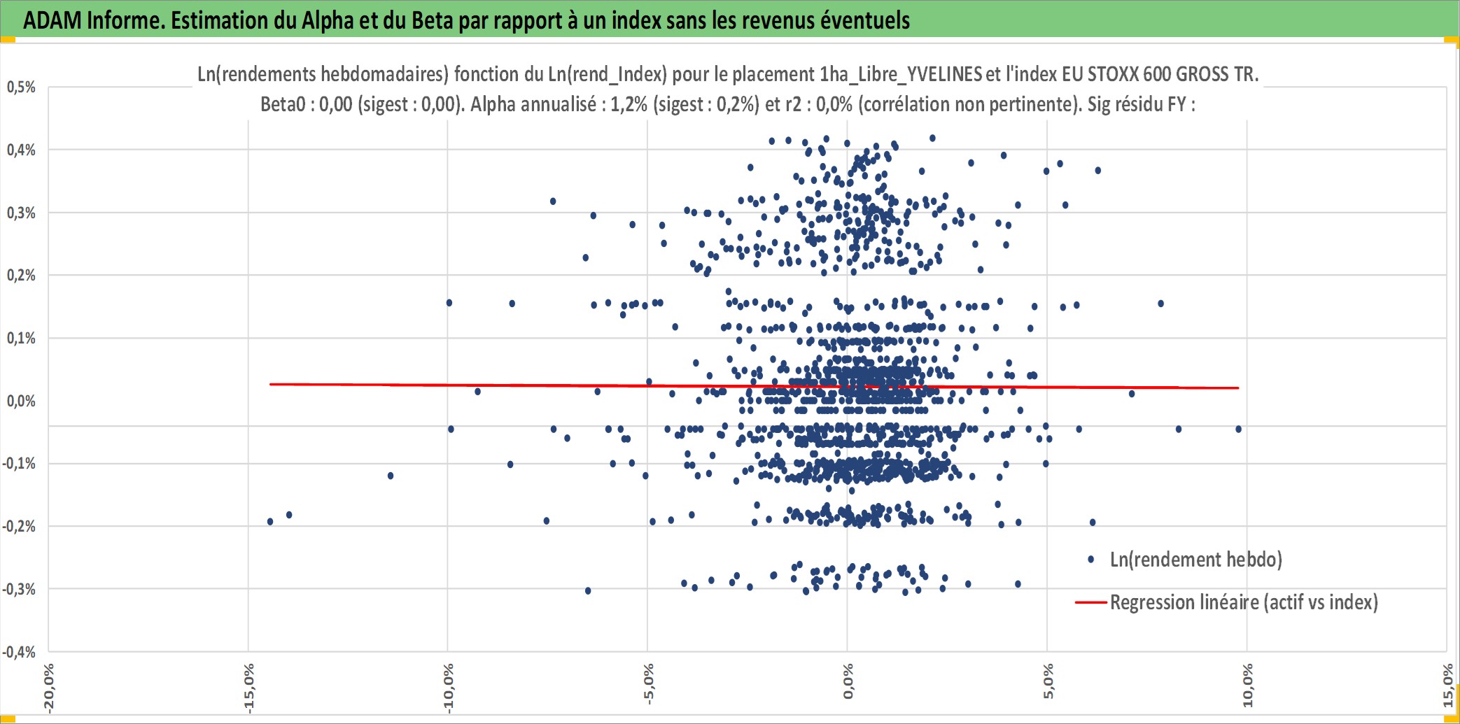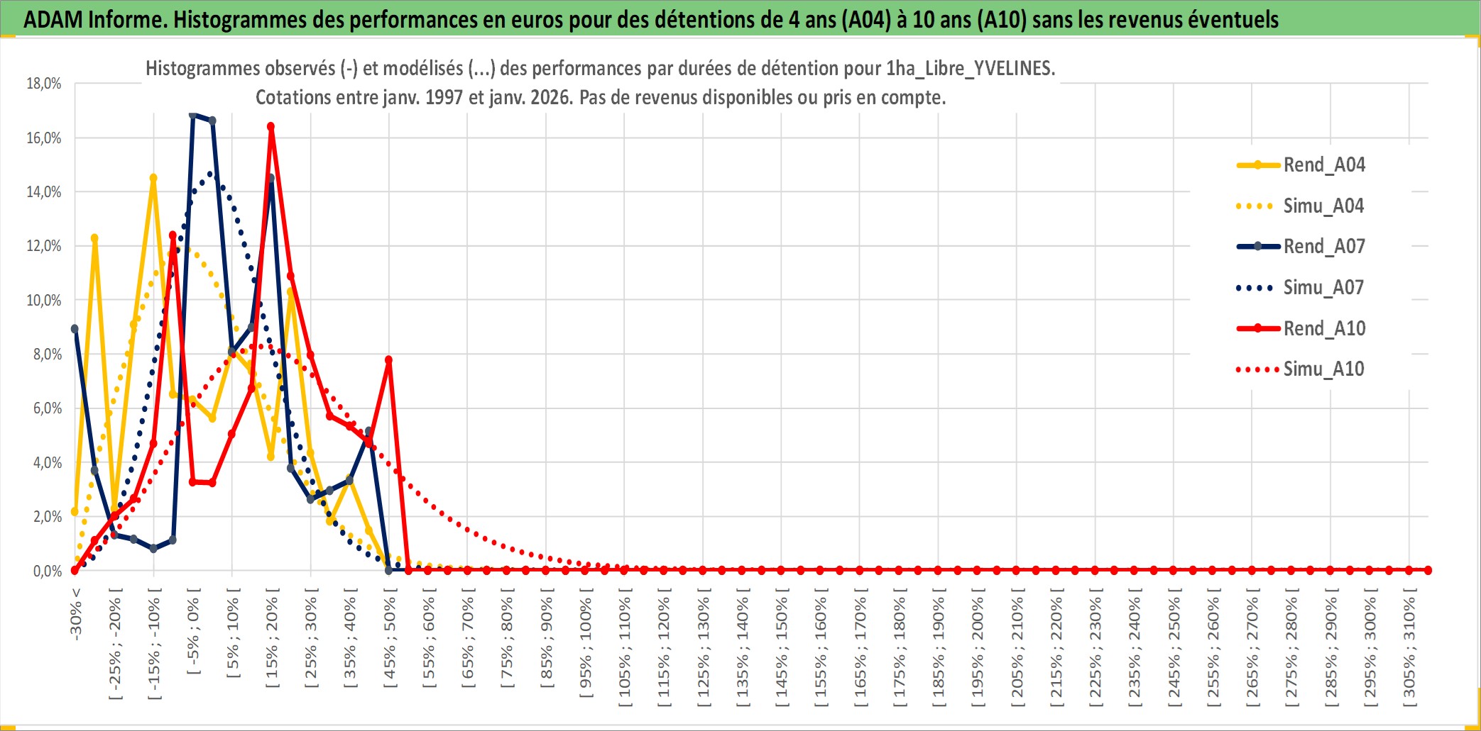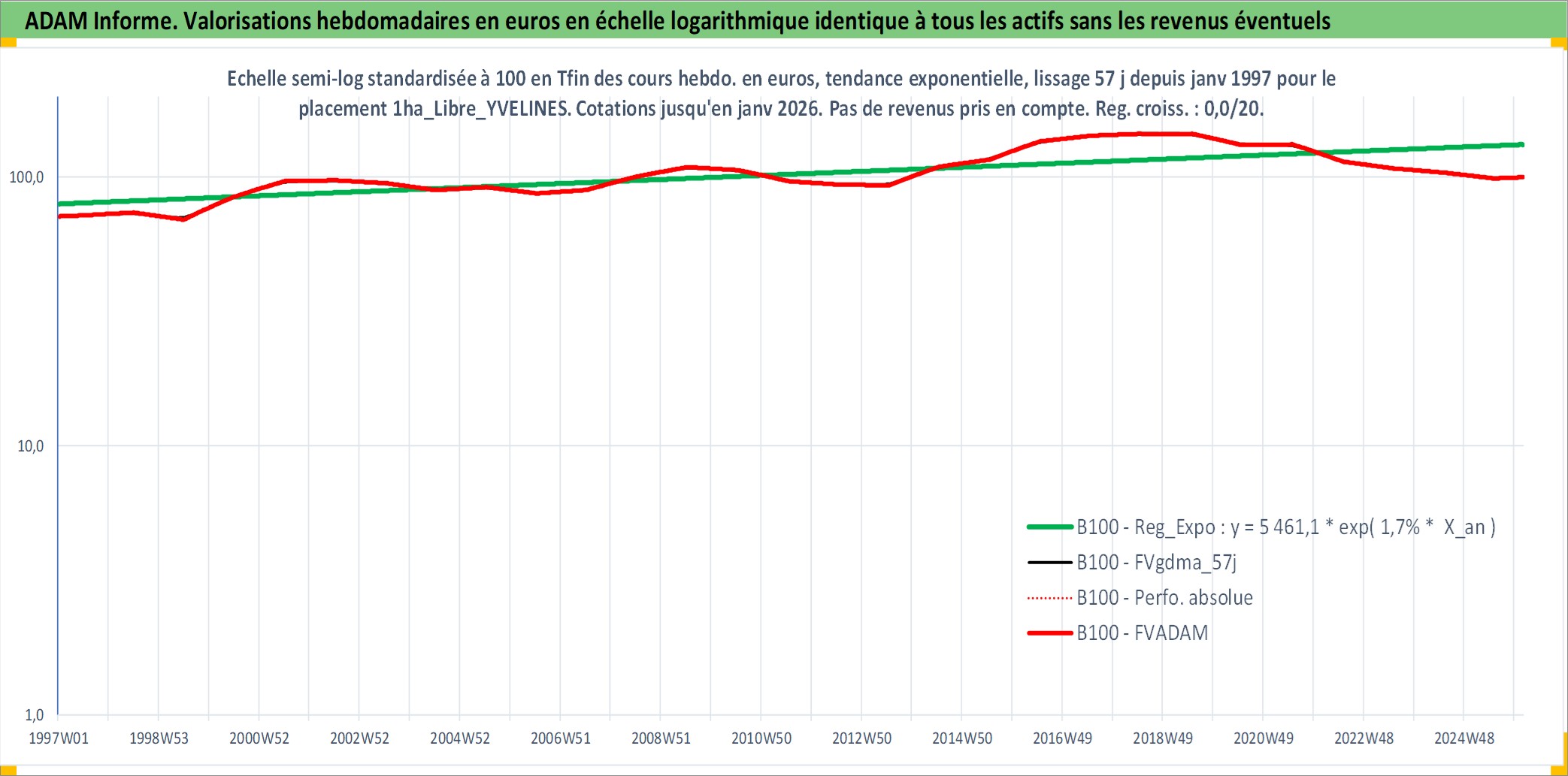 Site dédié aux investisseursPage dédiée sur site financeAnalyse des valorisations hebdomadaires de l'actif 1ha_Libre_YVELINES. Cet actif est cote en EUR. Les valorisations couvrent les semaines 1997W01 a 2026W05. Les fermages de ce bien foncier sont pris egaux a 2,5% annuels de la valeur venale du bien.