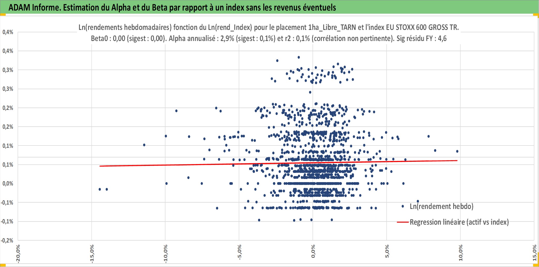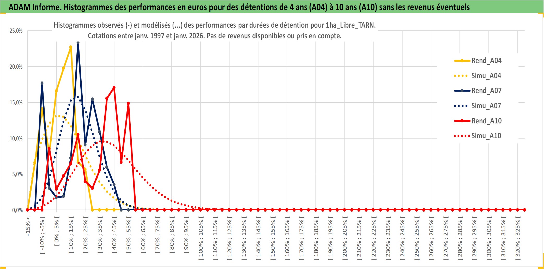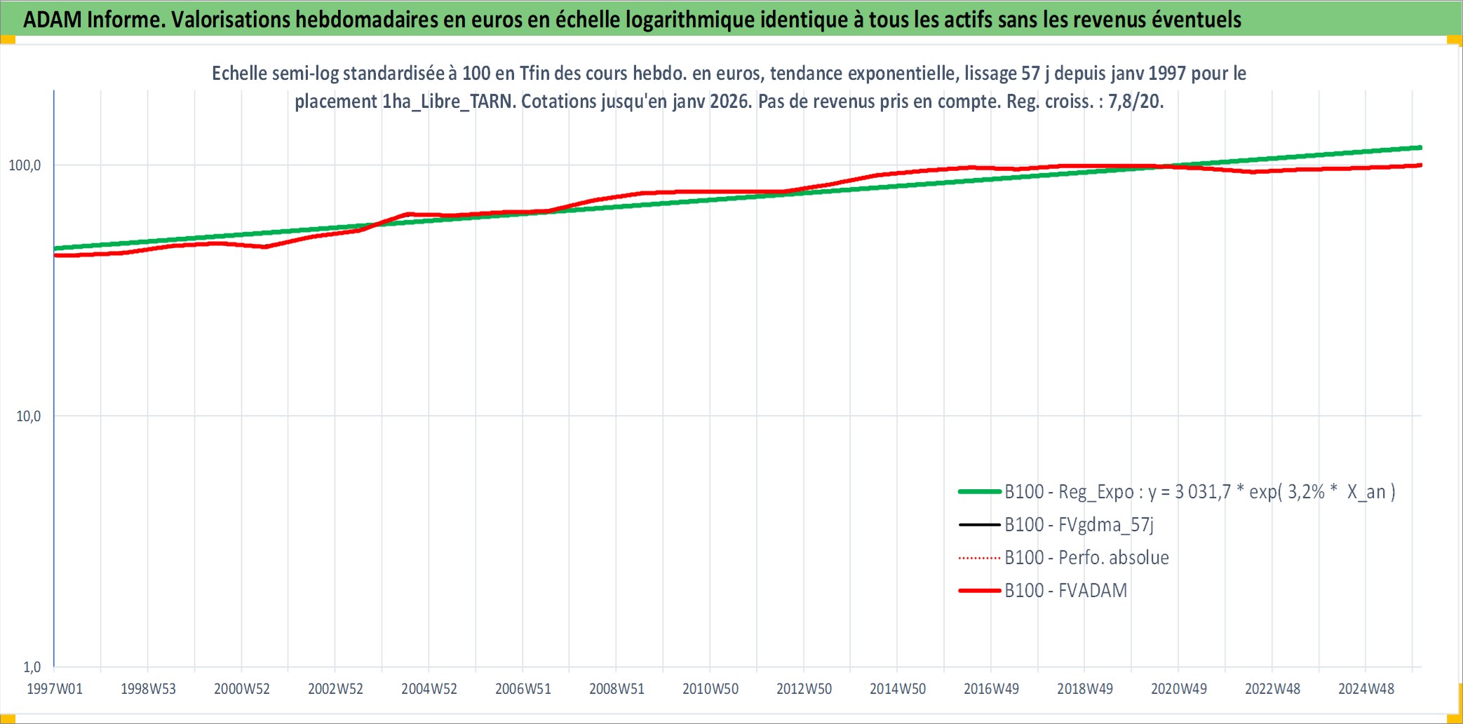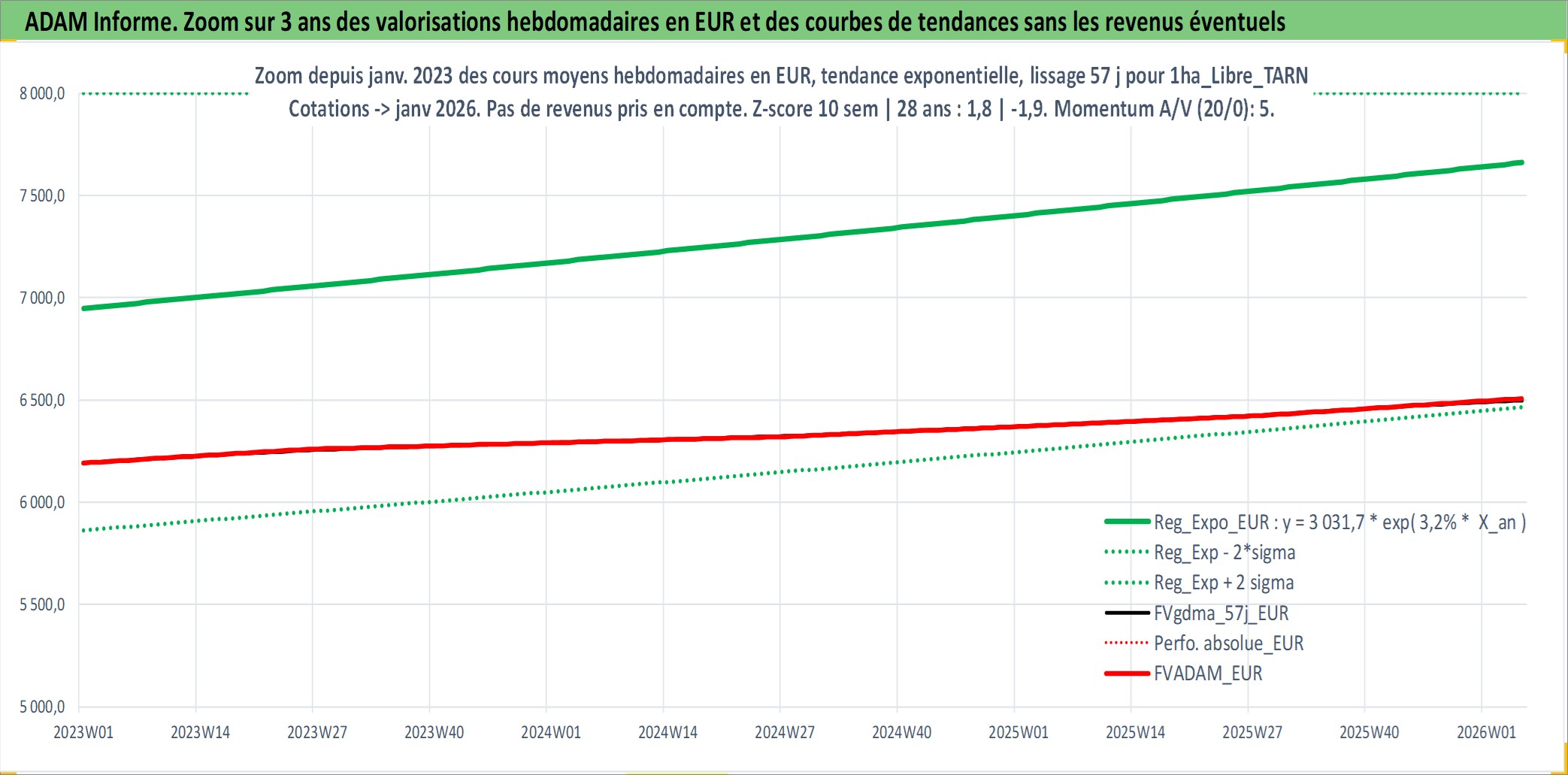 Site dédié aux investisseursPage dédiée sur site financeAnalyse des valorisations hebdomadaires de l'actif 1ha_Libre_TARN. Cet actif est cote en EUR. Les valorisations couvrent les semaines 1997W01 a 2026W05. Les fermages de ce bien foncier sont pris egaux a 2,5% annuels de la valeur venale du bien.