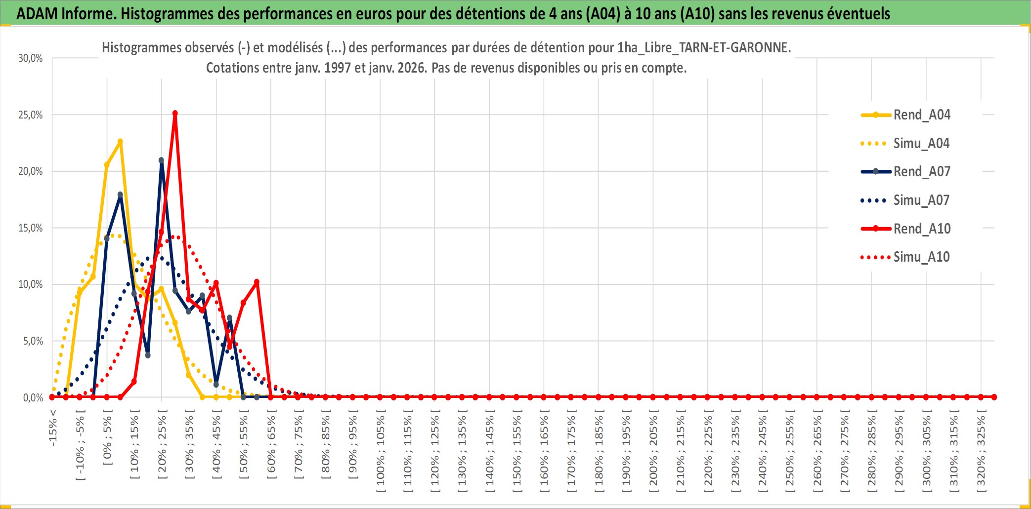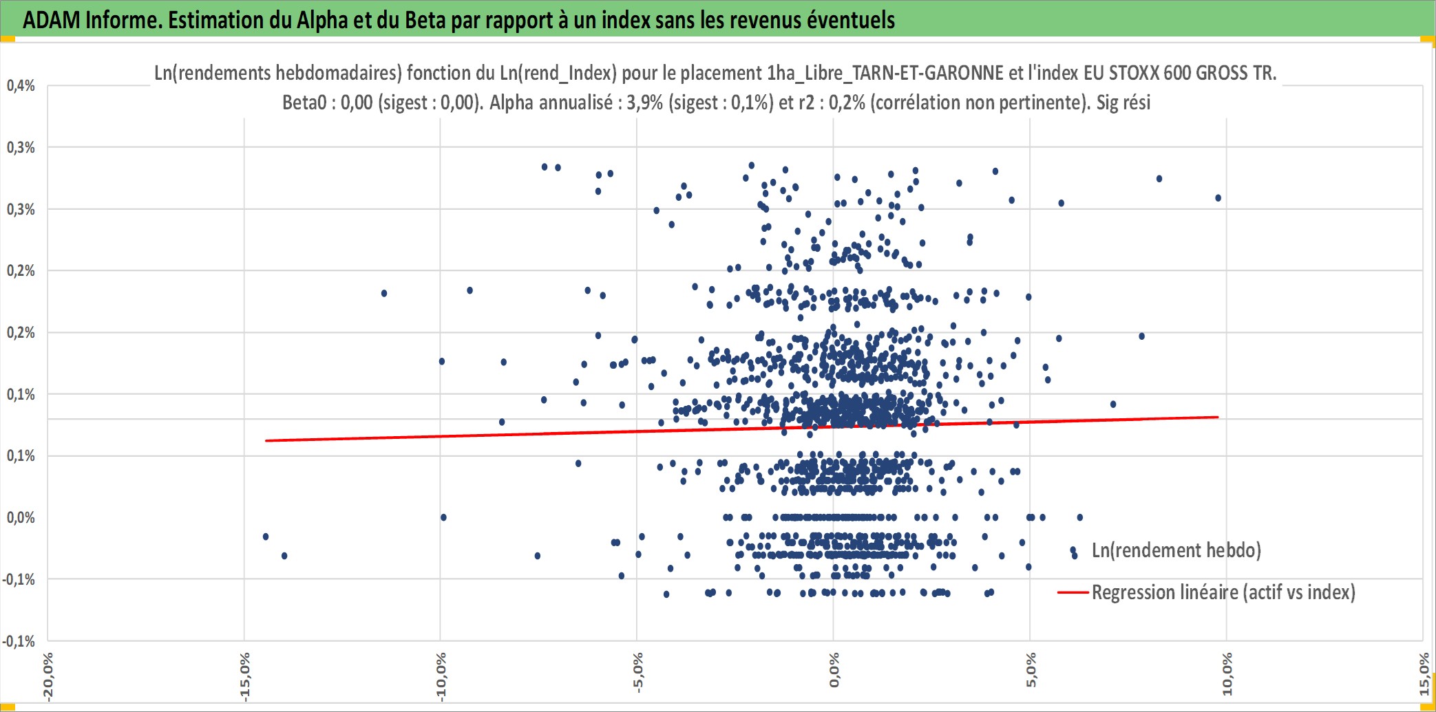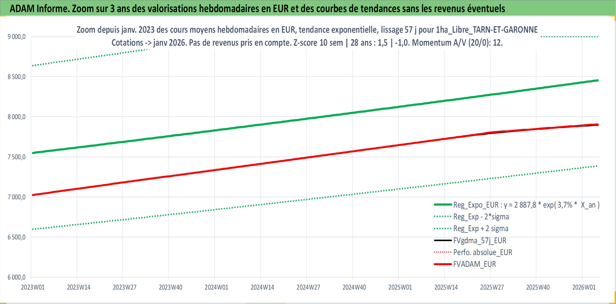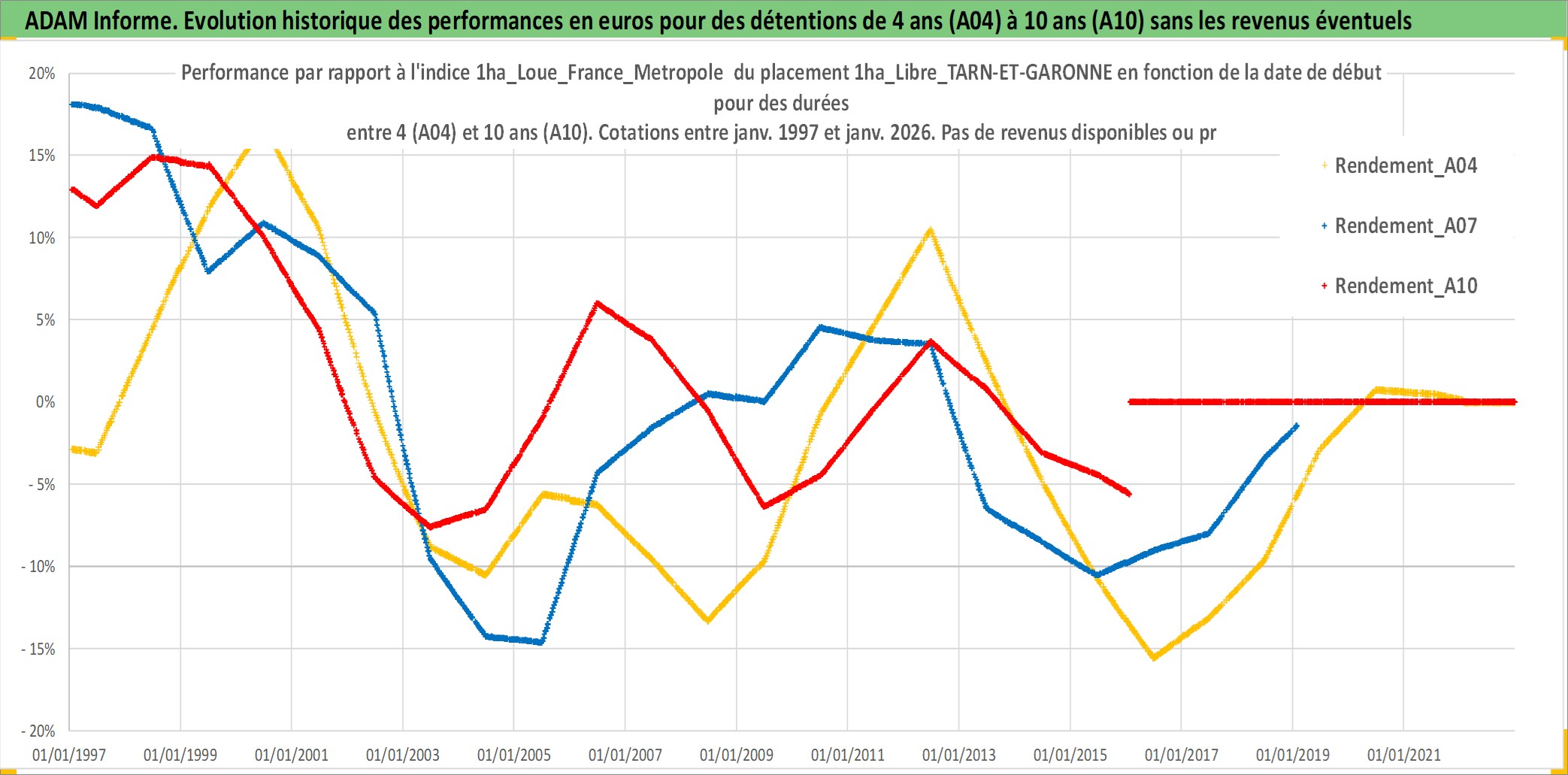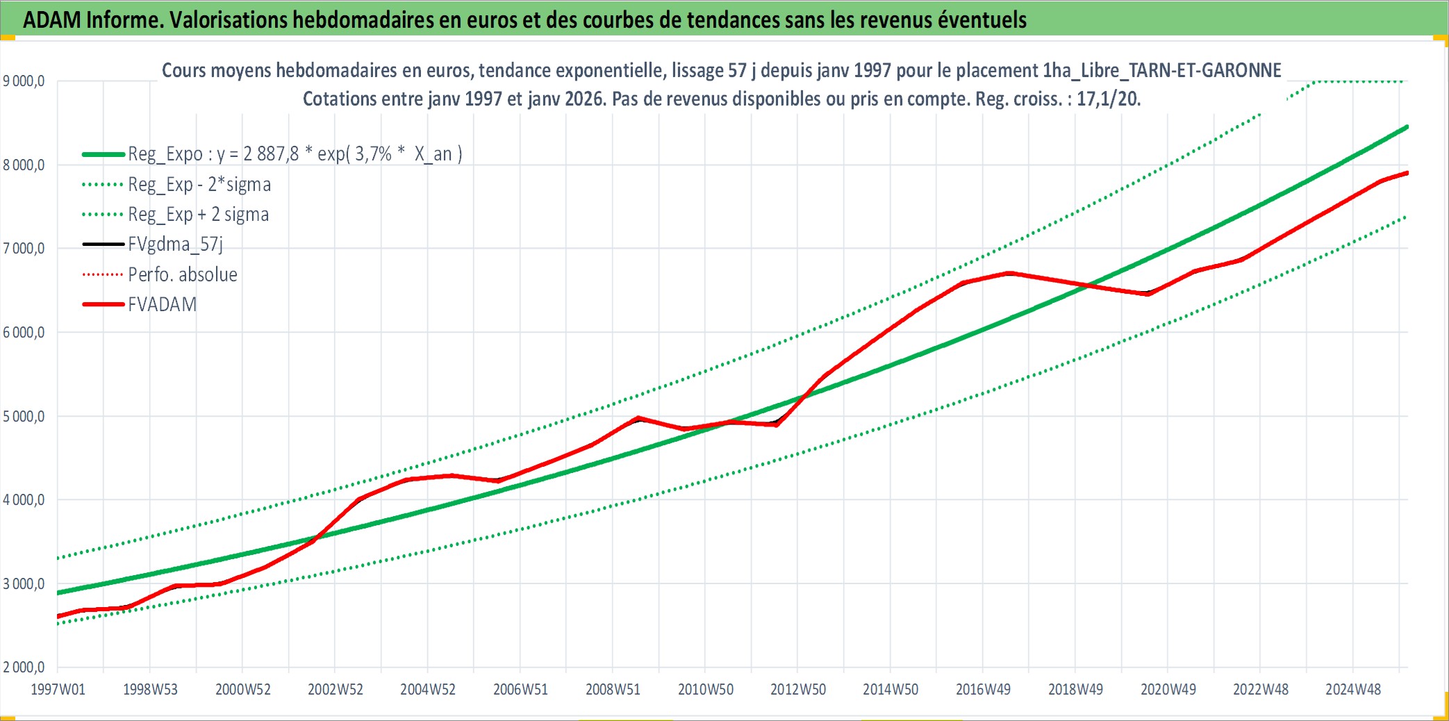 Site dédié aux investisseursPage dédiée sur site financeAnalyse des valorisations hebdomadaires de l'actif 1ha_Libre_TARN-ET-GARONNE. Cet actif est cote en EUR. Les valorisations couvrent les semaines 1997W01 a 2026W05. Les fermages de ce bien foncier sont pris egaux a 2,5% annuels de la valeur venale du bien.