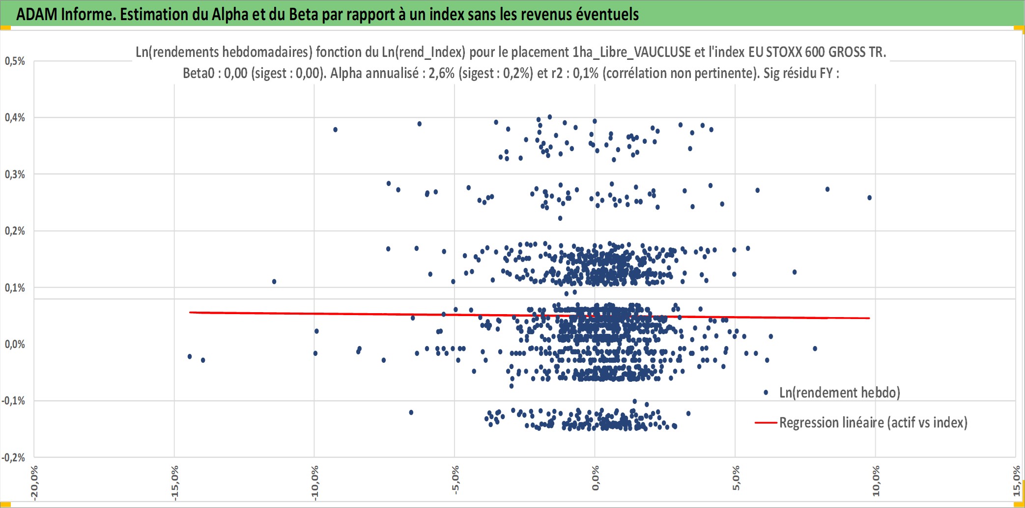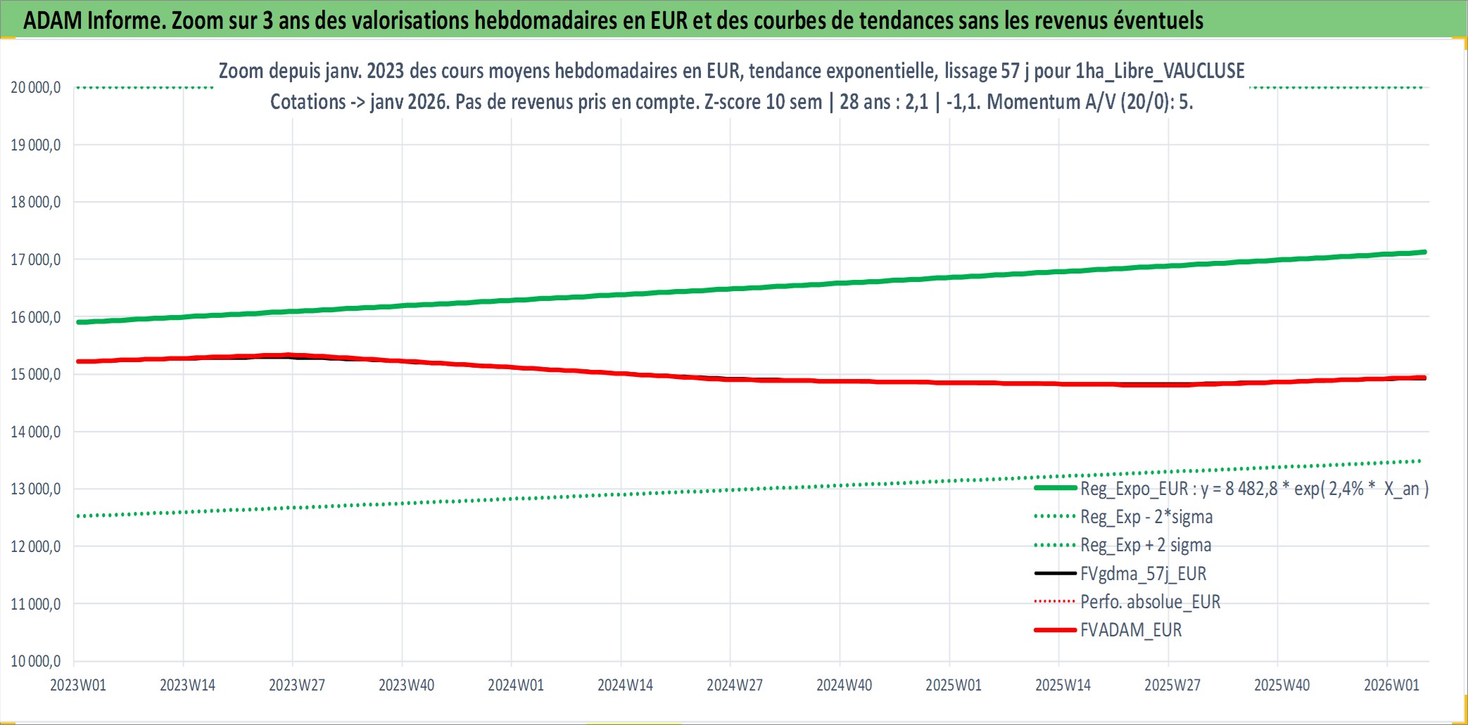 Site dédié aux investisseursPage dédiée sur site financeAnalyse des valorisations hebdomadaires de l'actif 1ha_Libre_VAUCLUSE. Cet actif est cote en EUR. Les valorisations couvrent les semaines 1997W01 a 2026W05. Les fermages de ce bien foncier sont pris egaux a 2,5% annuels de la valeur venale du bien.